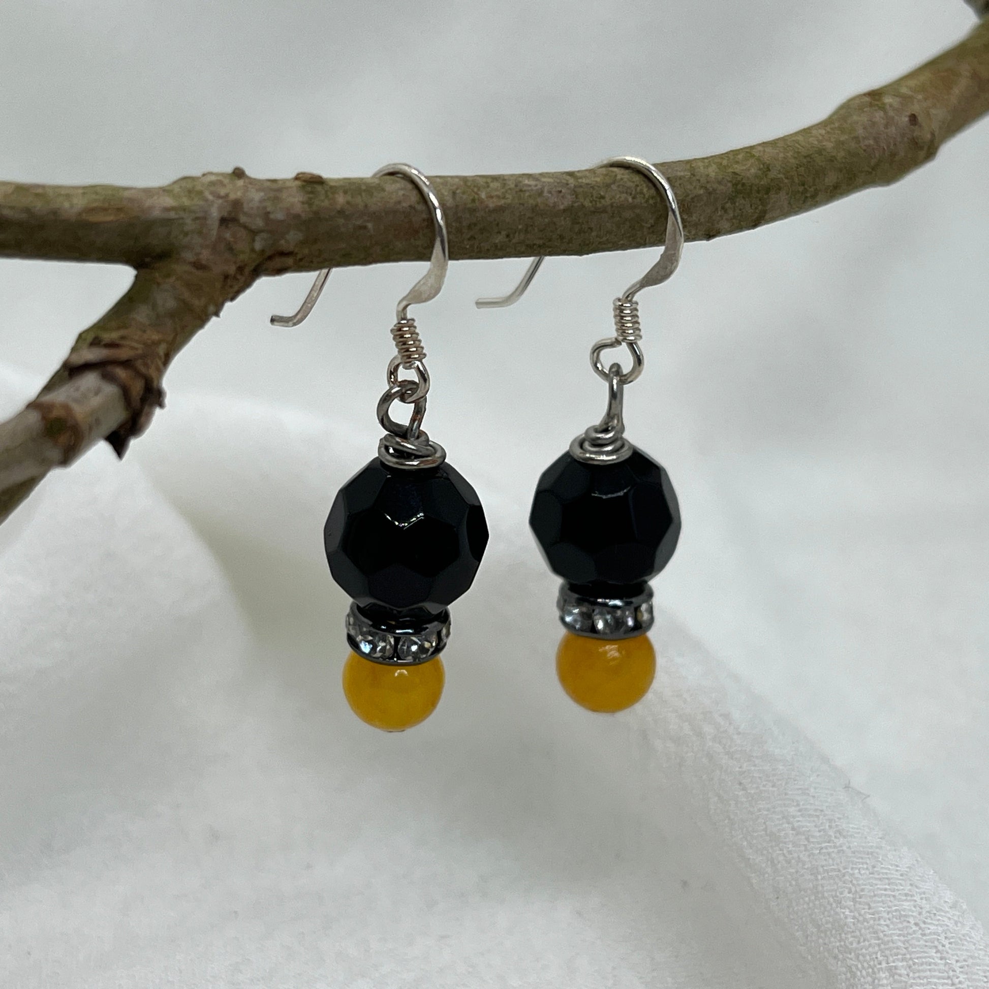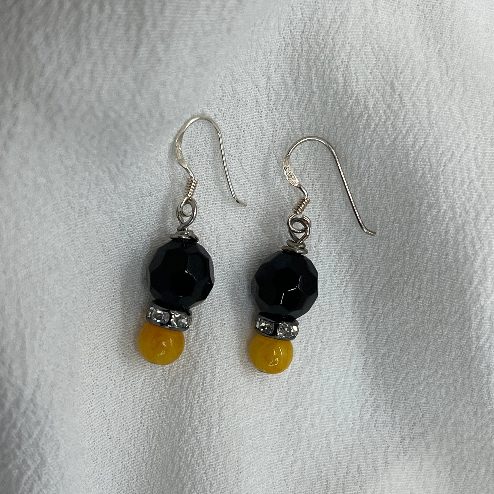 Smuk ørekrog i ægte massiv sølv med sort facetteret perle, sølvrondel med similisten. Afsluttet med en gul Jade halvædelsten.