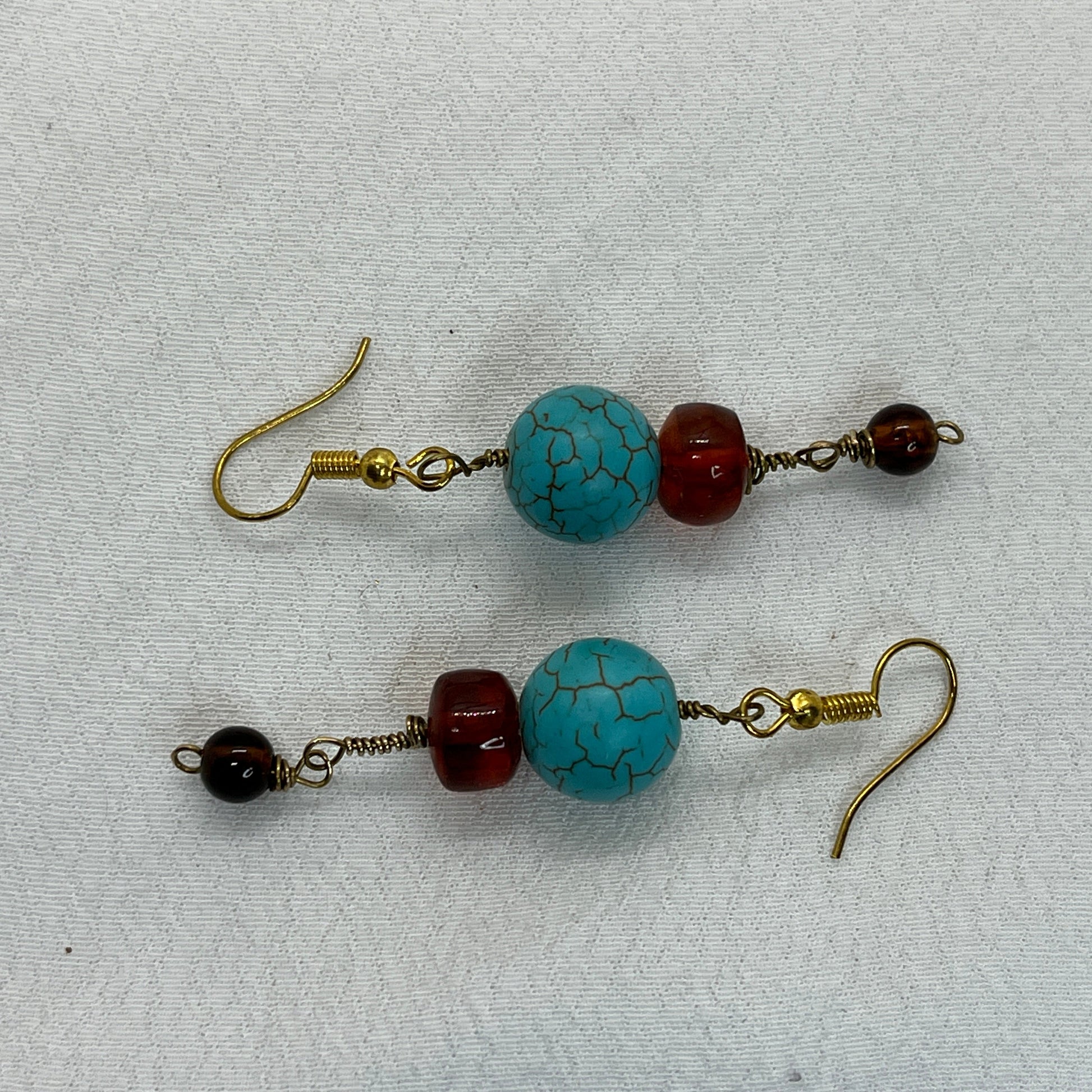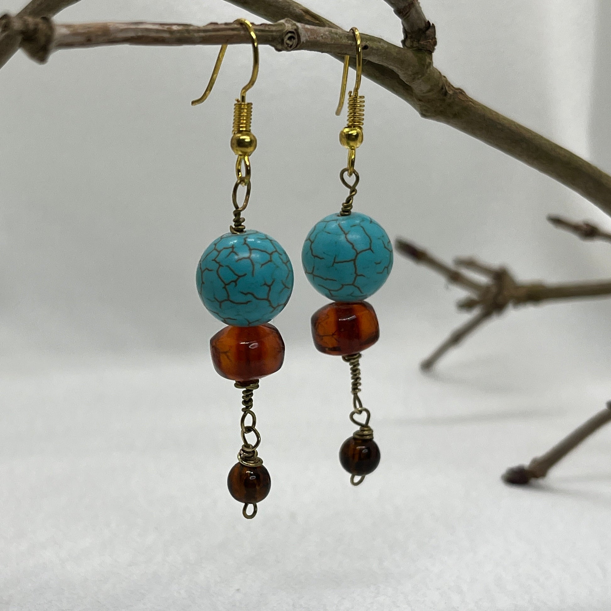 Øreringe i messing med vedhæng af imiteret turkiser, resinperler og brune glasperler viklet sammen med en messingtråd.