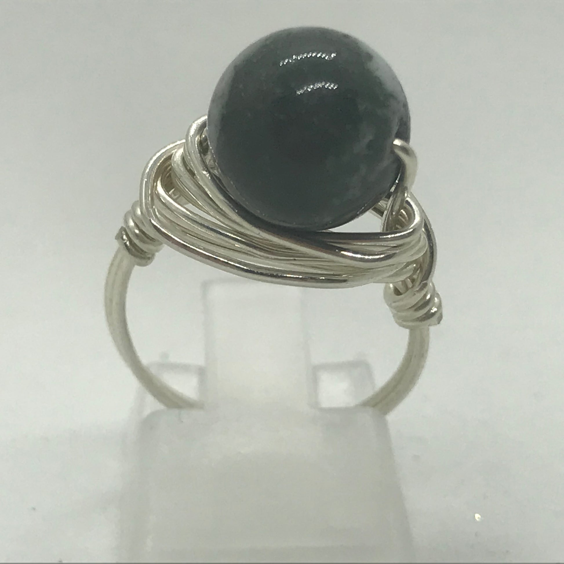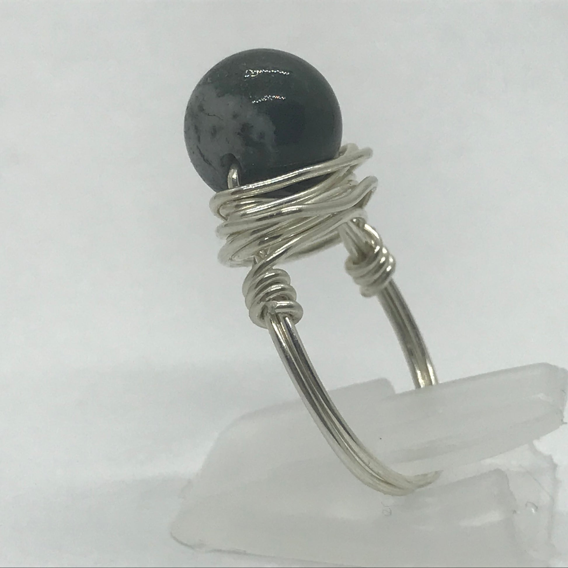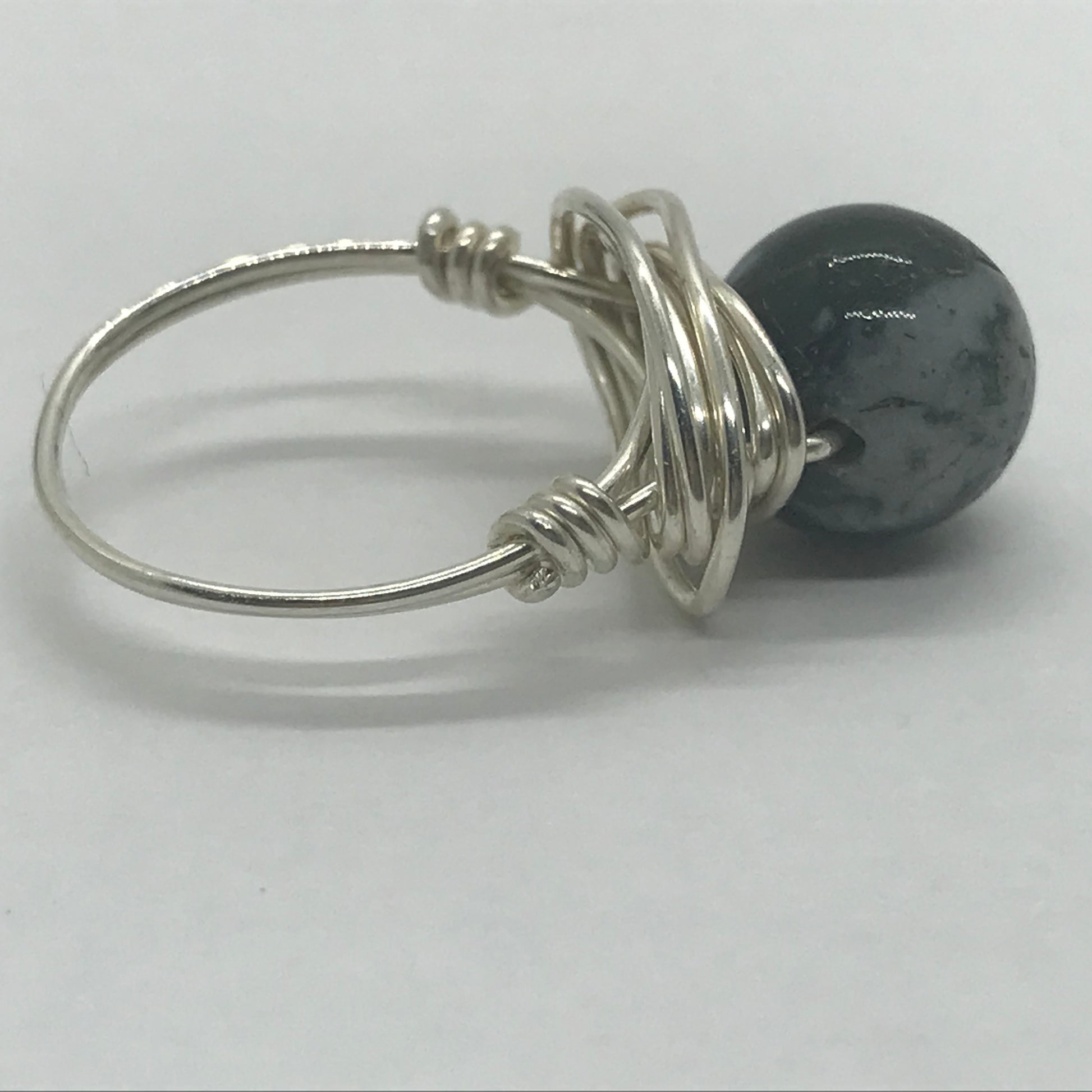 Smuk fingerring i ægte sølvtråd der er viklet om en grøn spot Jasper halvædelsten.