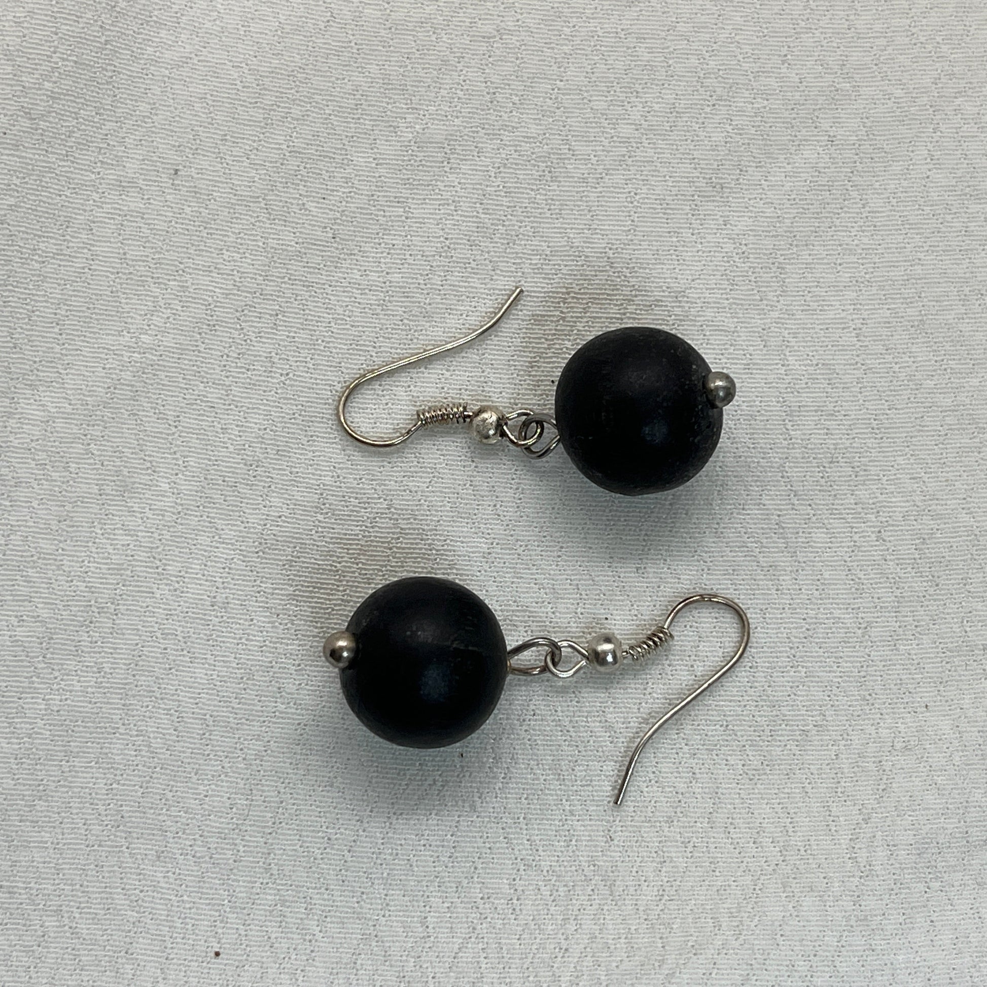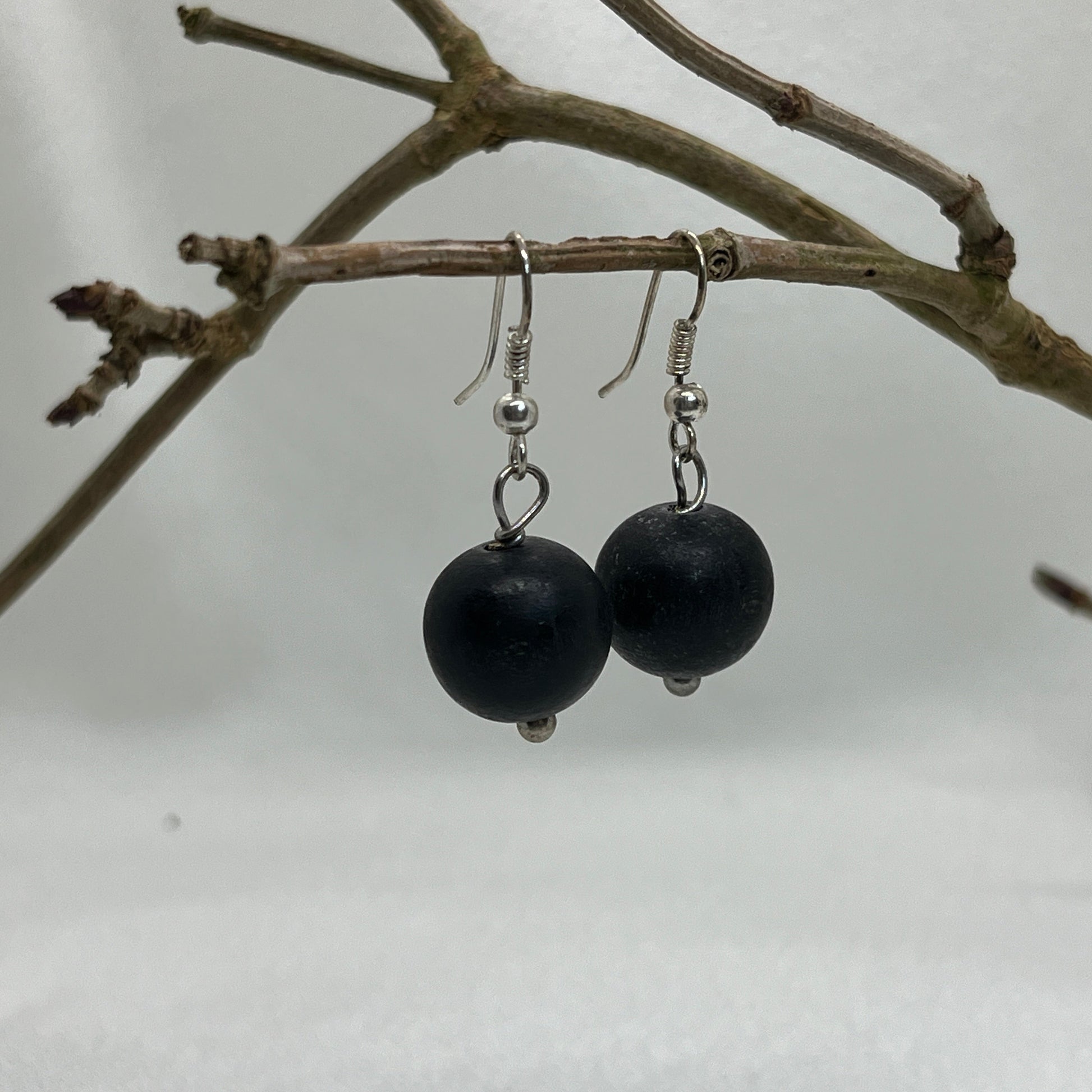 Øreringe i sølv med sort træperle på en sølv perlestilk