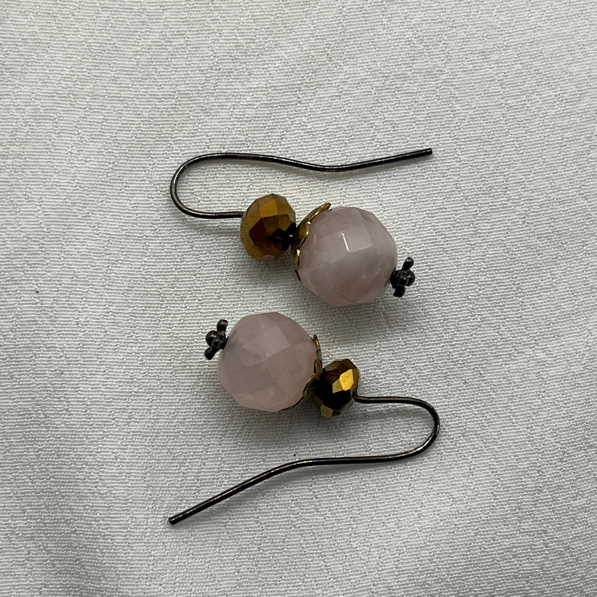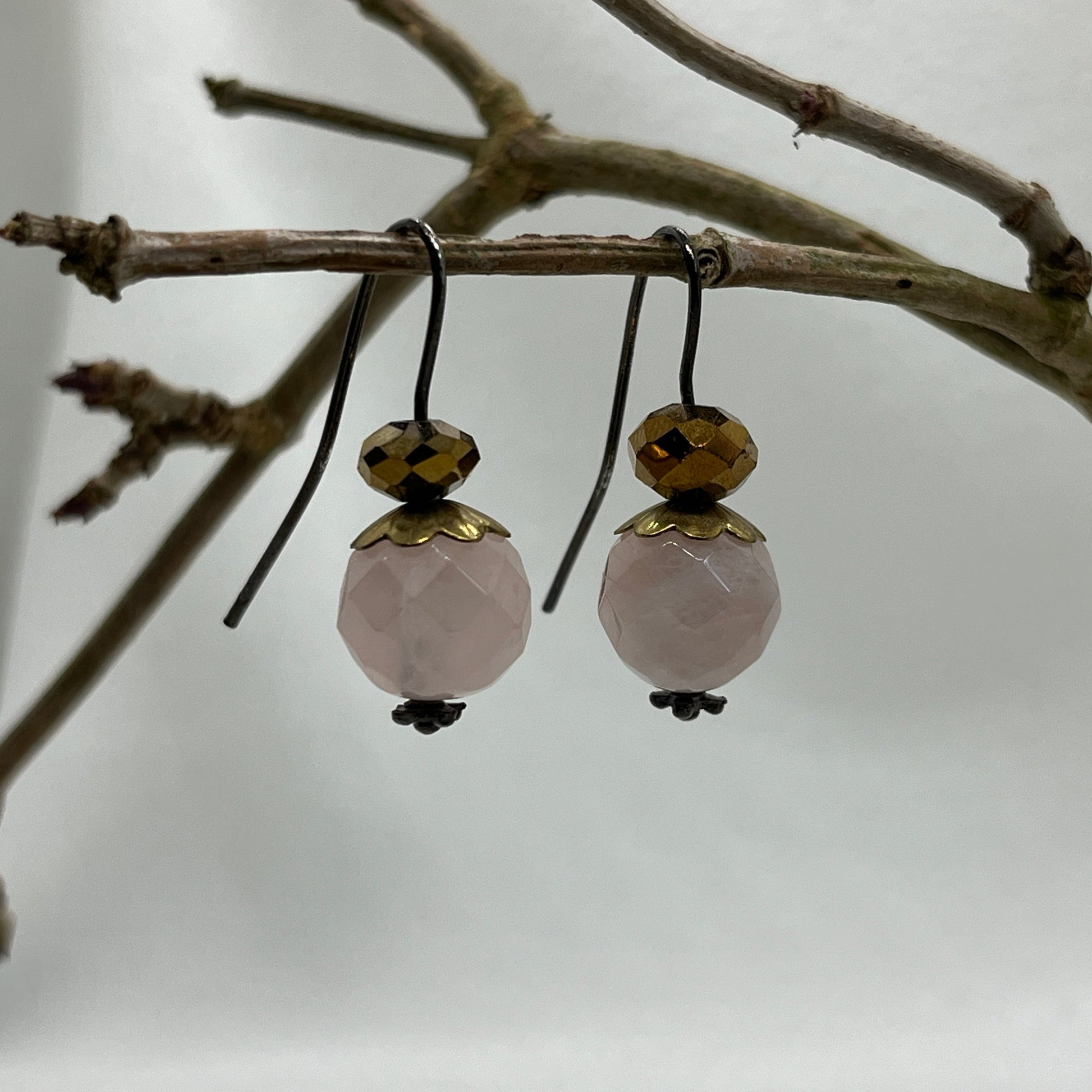 Meget yndige øreringe i gunmetal, med facetteret guldperle, guldhætte og den smukkeste facetterede Rosenkvarts på 12 mm.