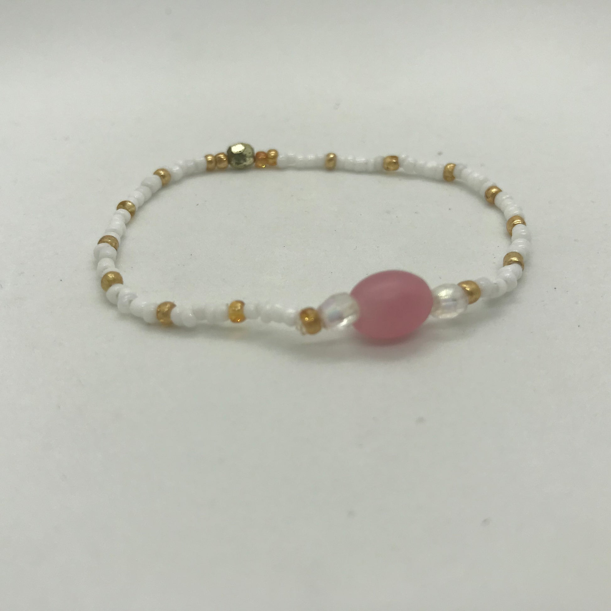 Helt enkelt armbånd med hvide og guld-klare seedbeads. Der sidder et par enkelte klare akryl perler sammen med stor rosa oval akrylperle.