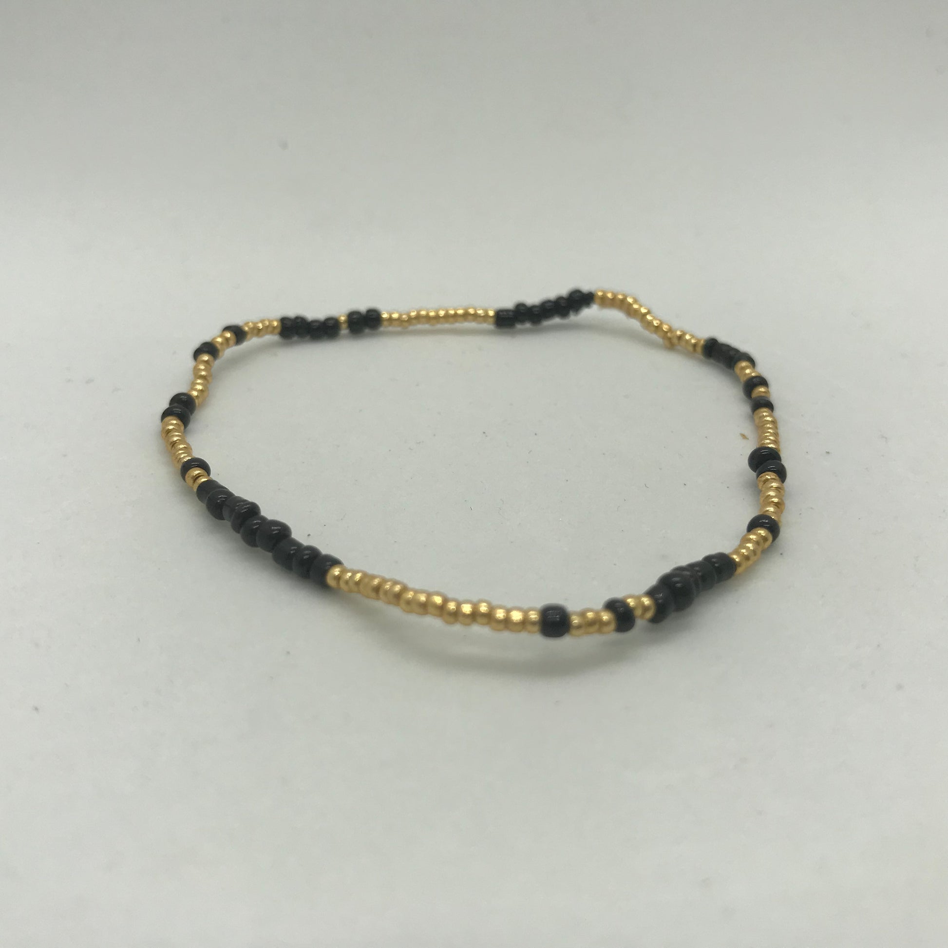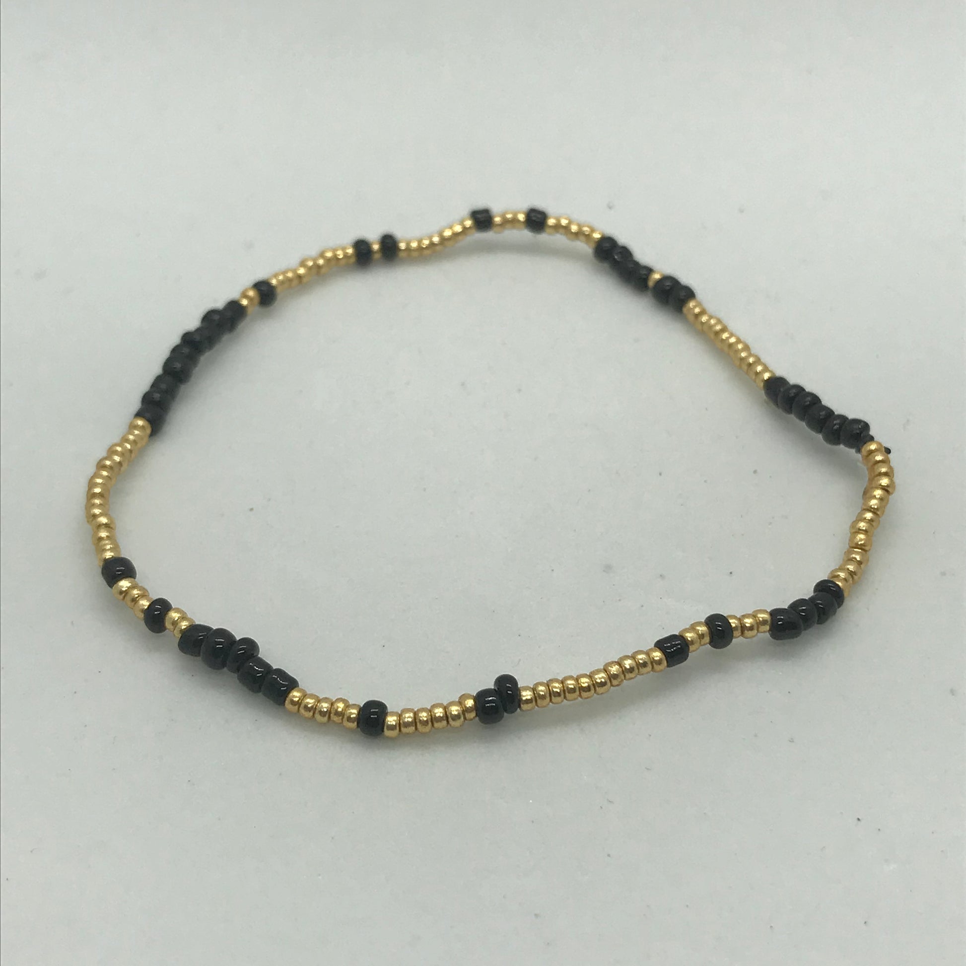 Flot armbånd med lidt større sorte seedbeads og guldbelagte seedbeads.