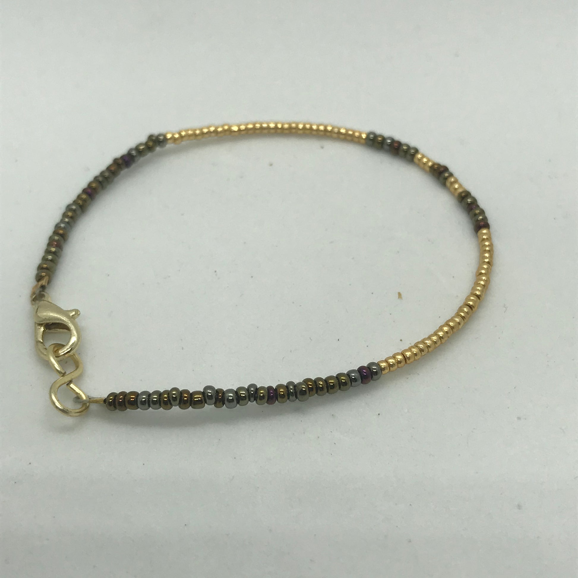 Armbånd på wire med guldbelagte seedbeads og brunmetallic farvede seedbeads.