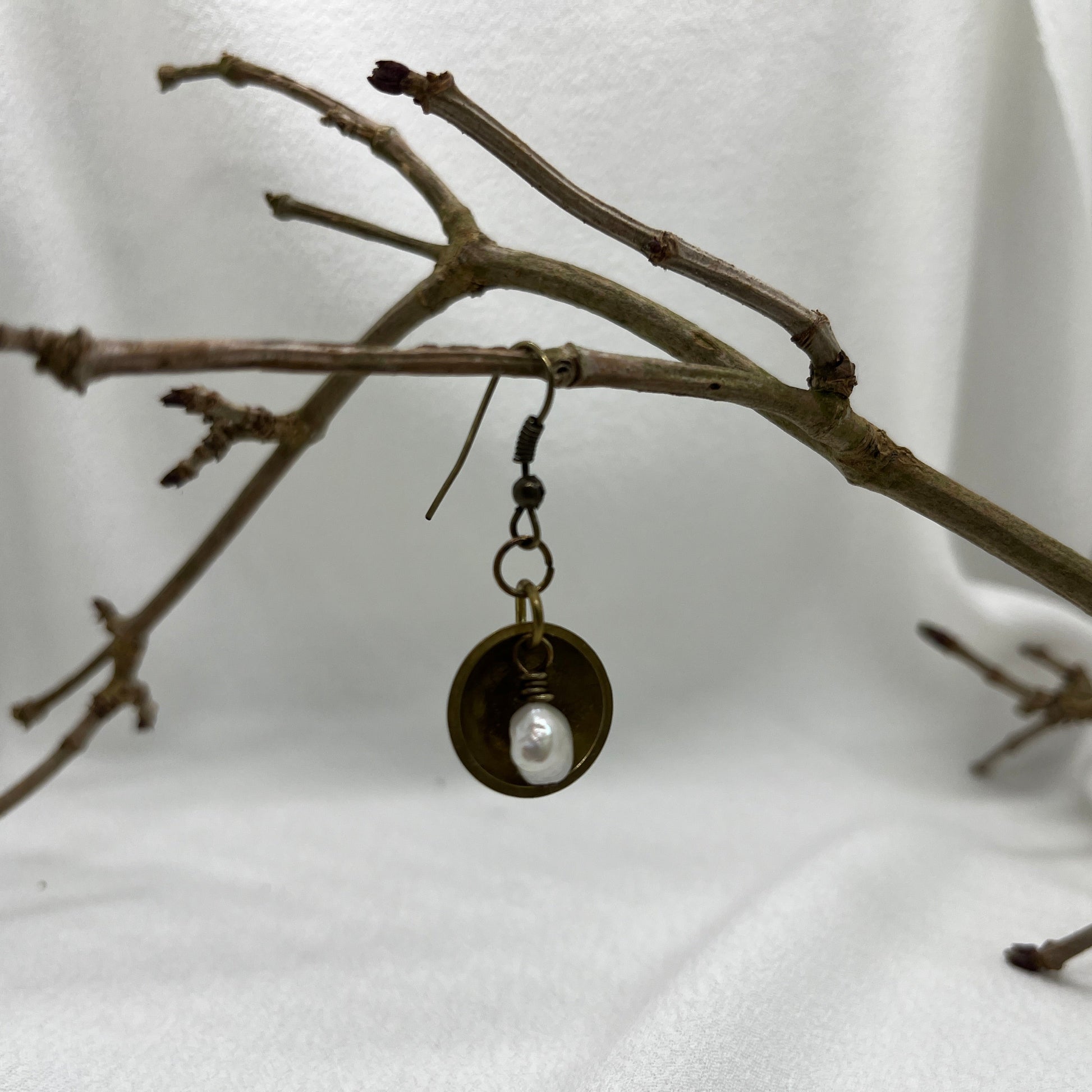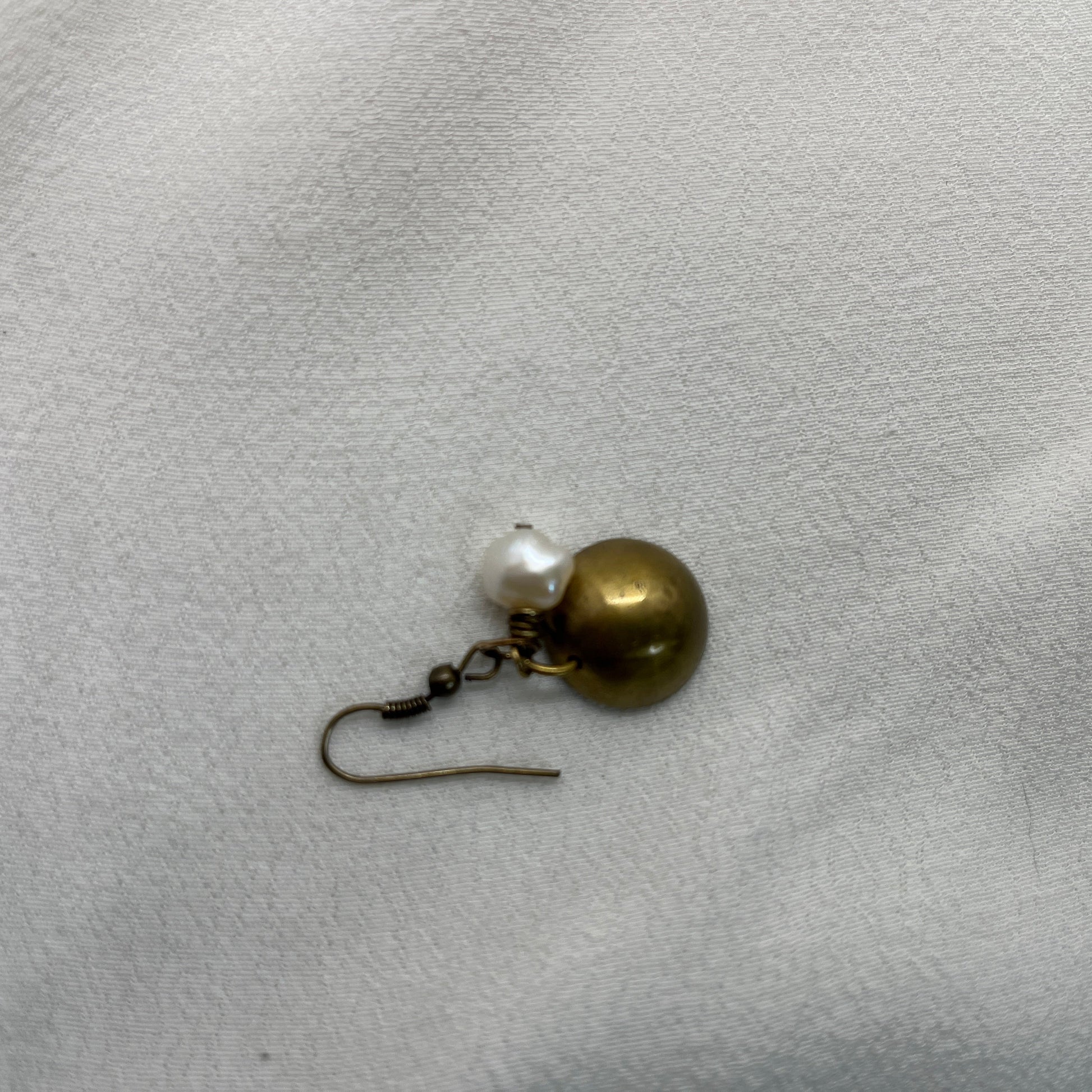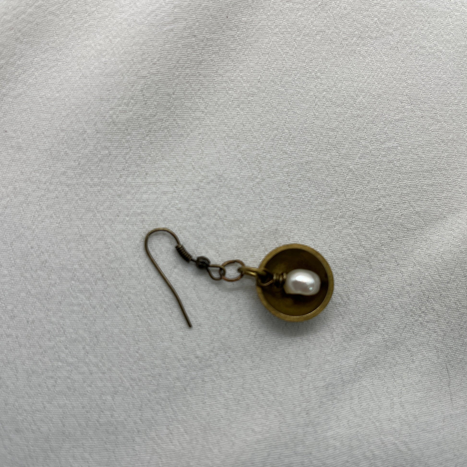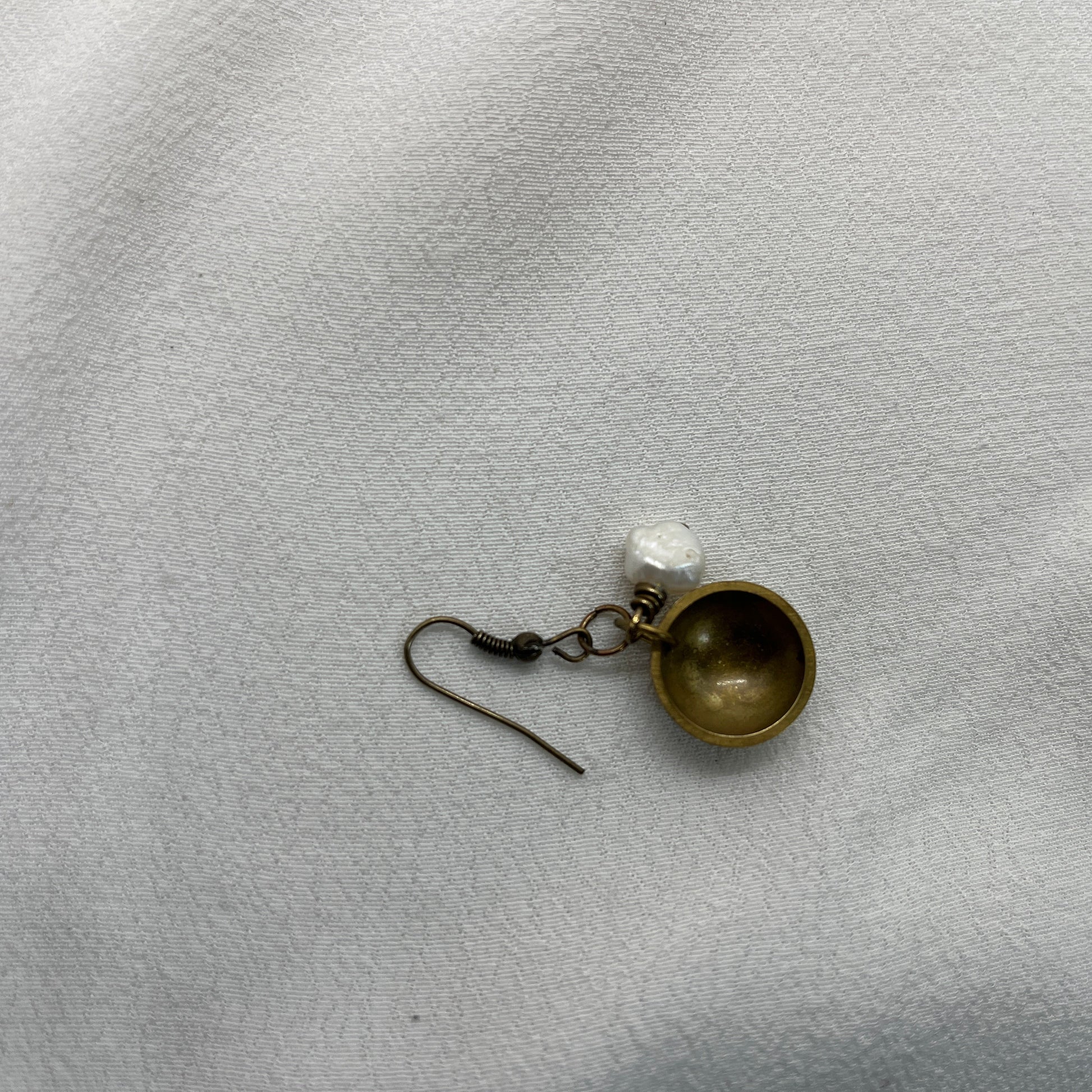 Speciel single ørering i antik messing. Der er en smuk hvid ferskvandsperle på messingtråd der ligger inde i en halvkugle af messing. En helt igennem unika ørering.
