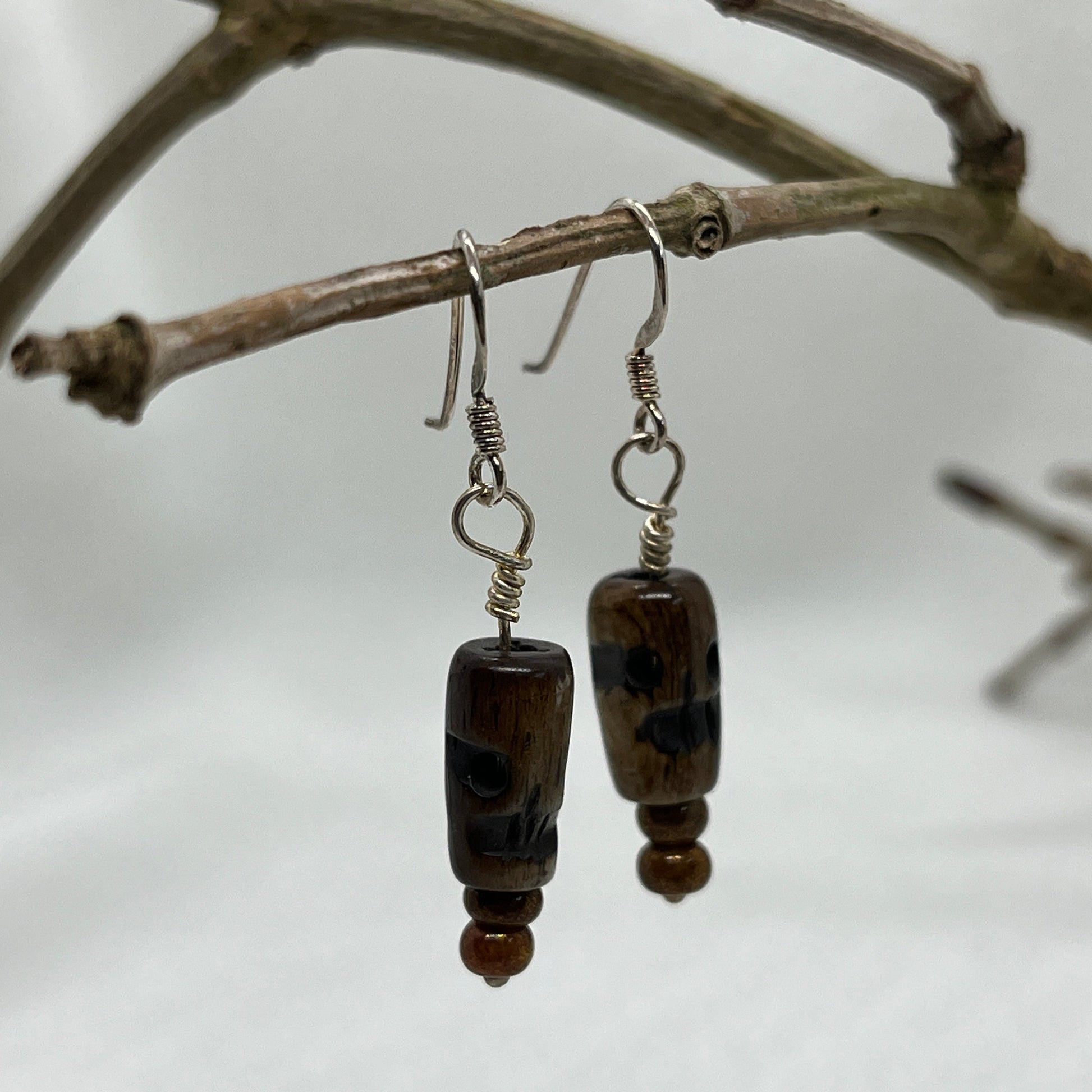 Rigtig halloween kobber øreringe med Tigerøje kranium og brune seedbeads på kobber perlestilk.