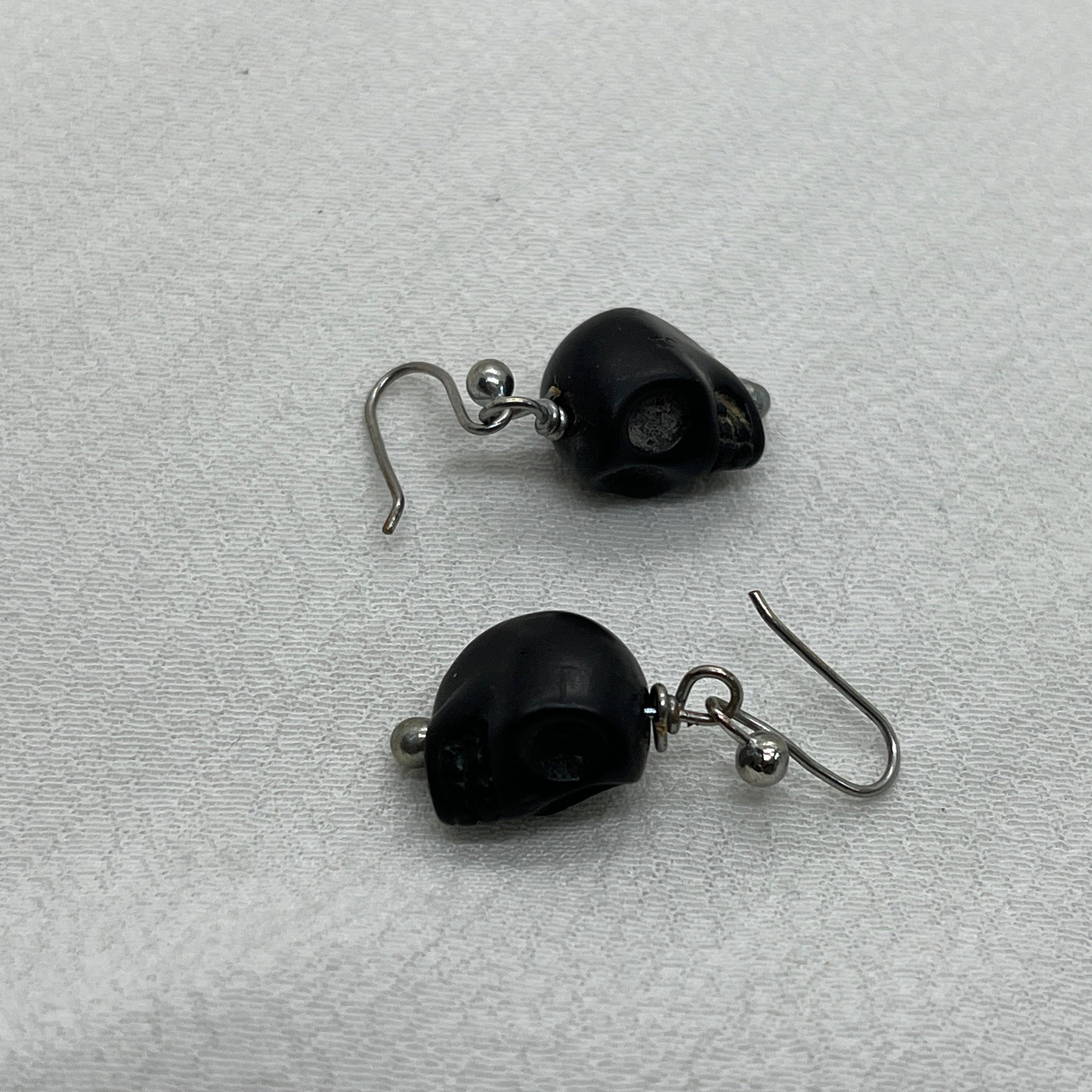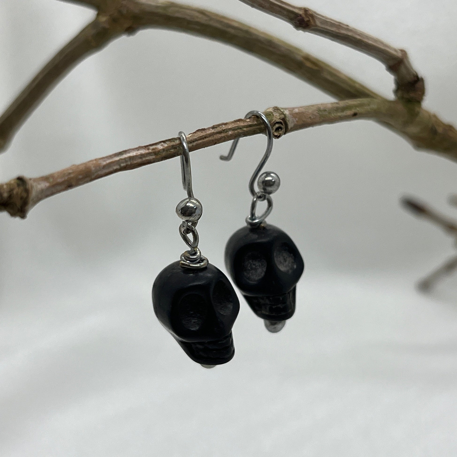 Rigtig halloween sølv øreringe bukket af en sølv perlestilk og med et sort kranium.