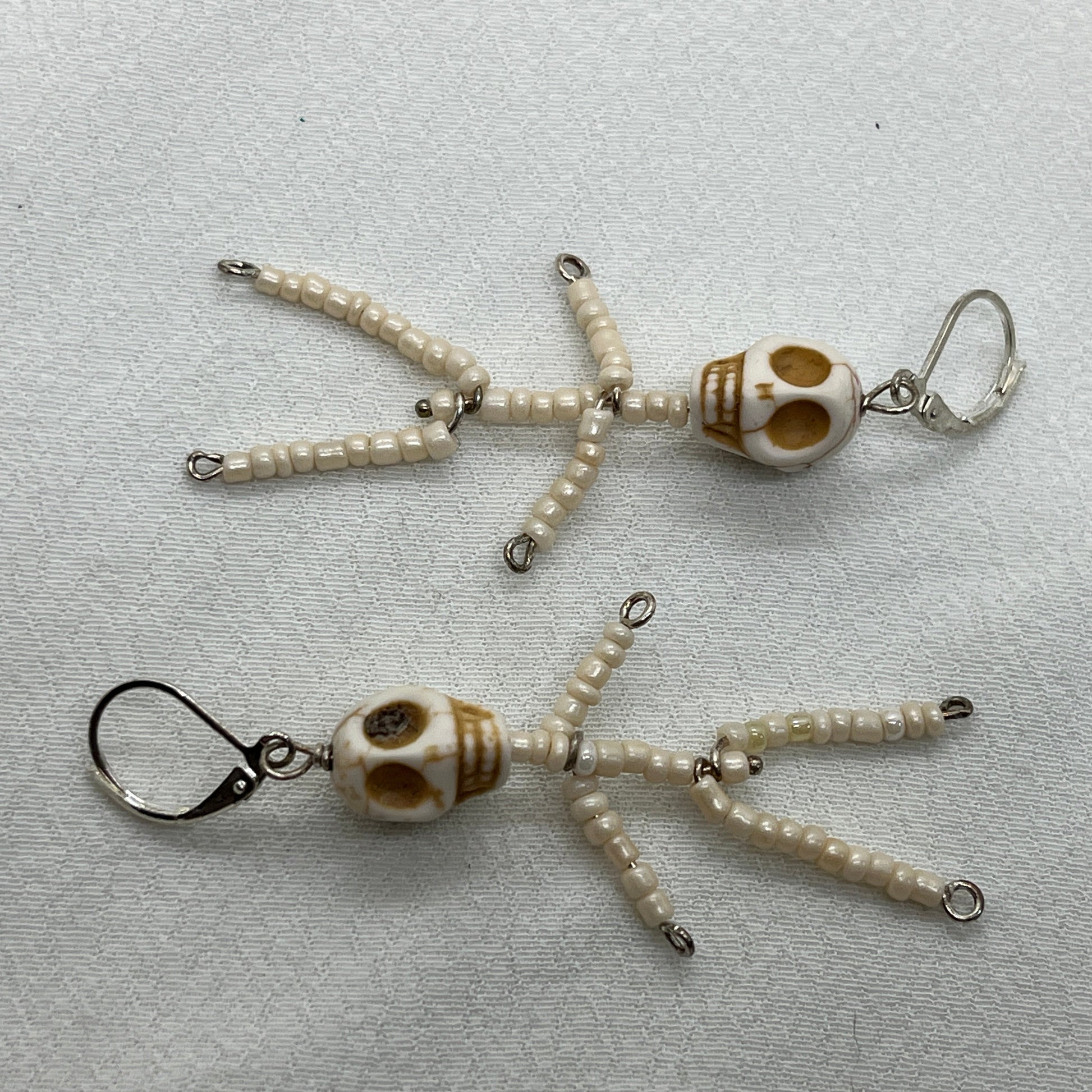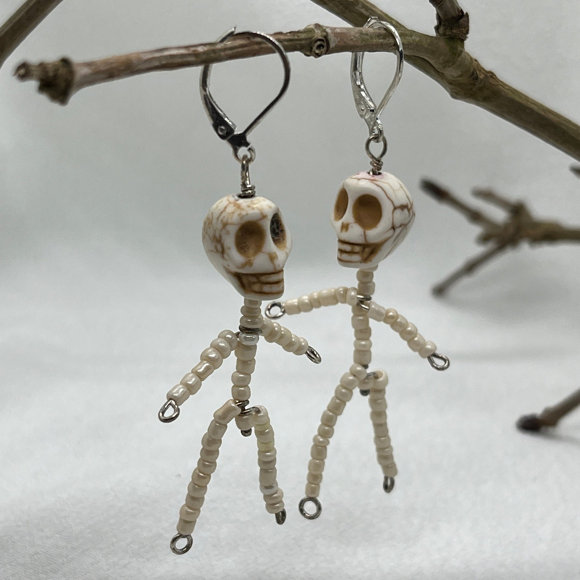 Brioche sølv øreringe. Rigtig halloween ørering i sølv med hvidt kranium og små hvide seedbeads der er samlet som et skelet.. Cool øreringe.
