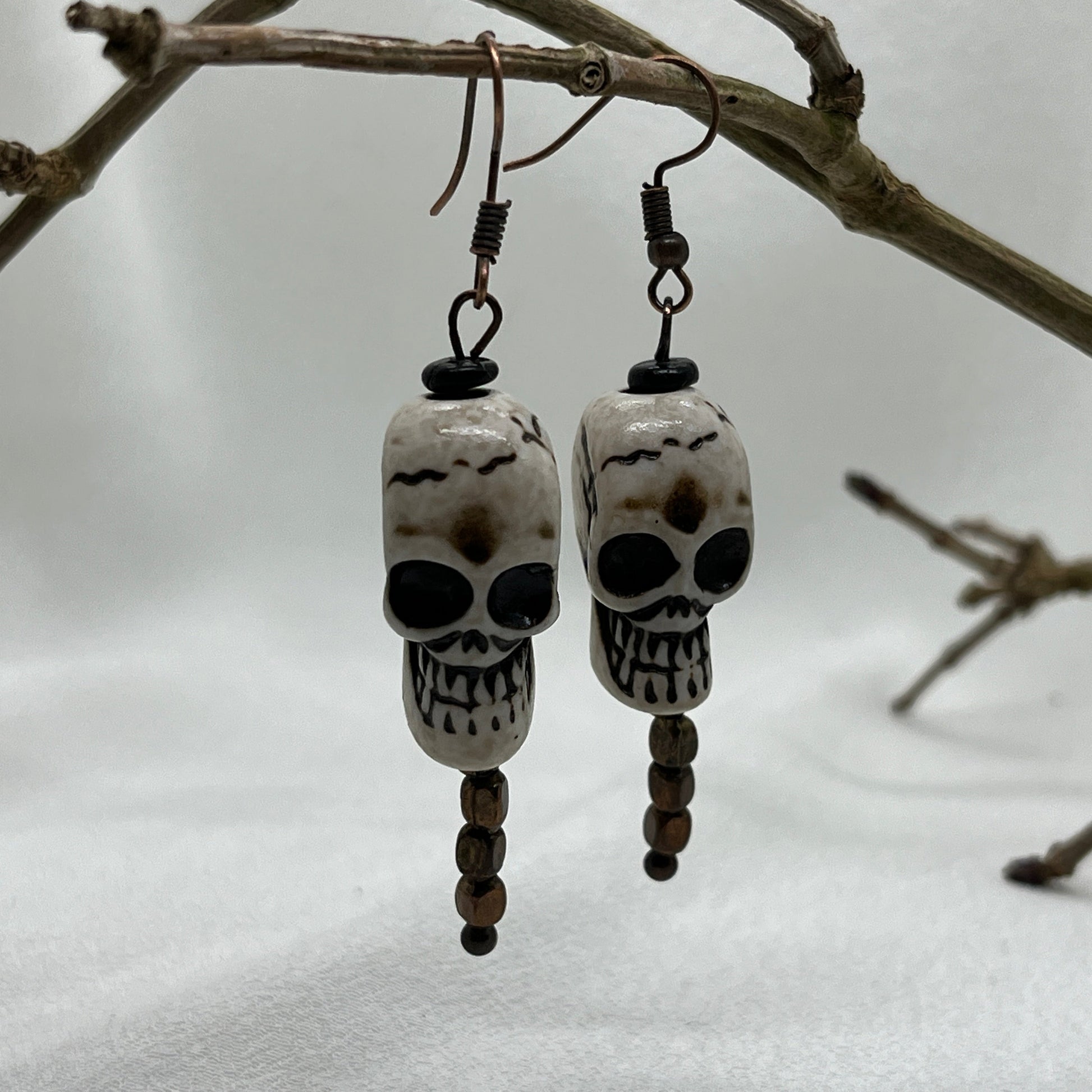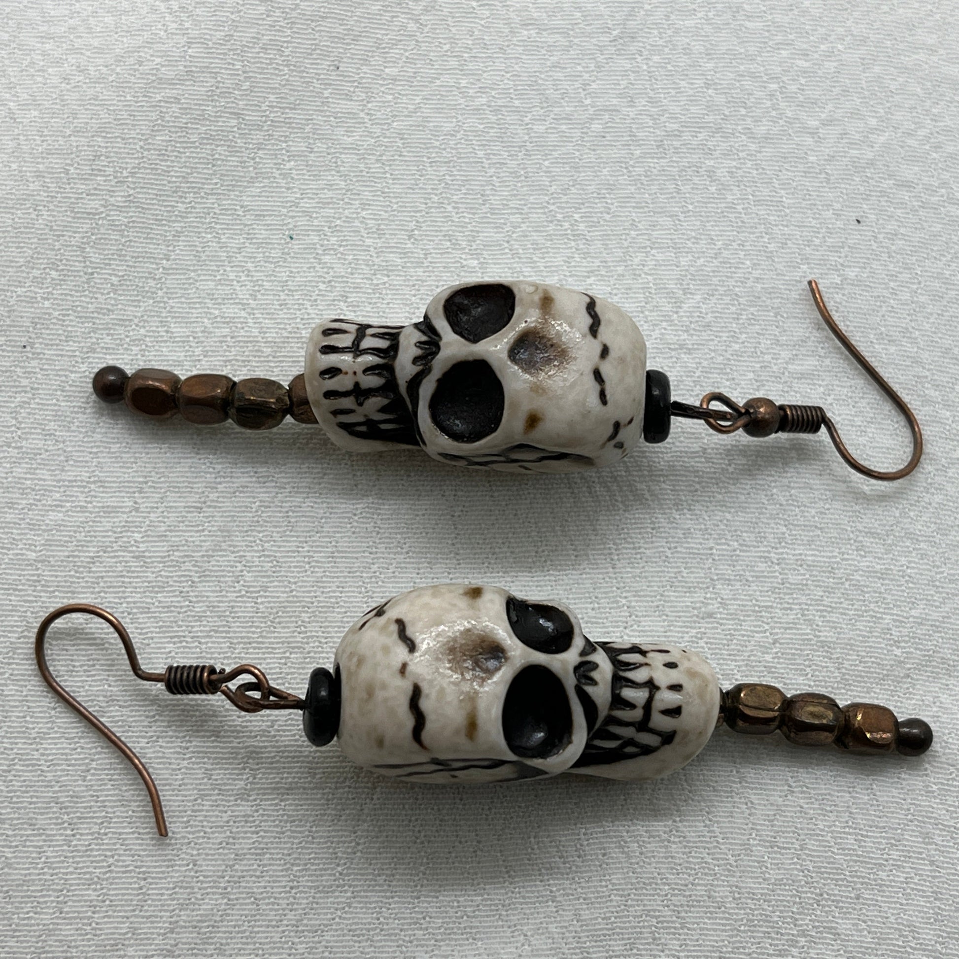 Kobber øreringe. Rigtig halloween øreringe med et stort hvidt kranium med sorte og kobberfarvede perler.. uhhhhhh.