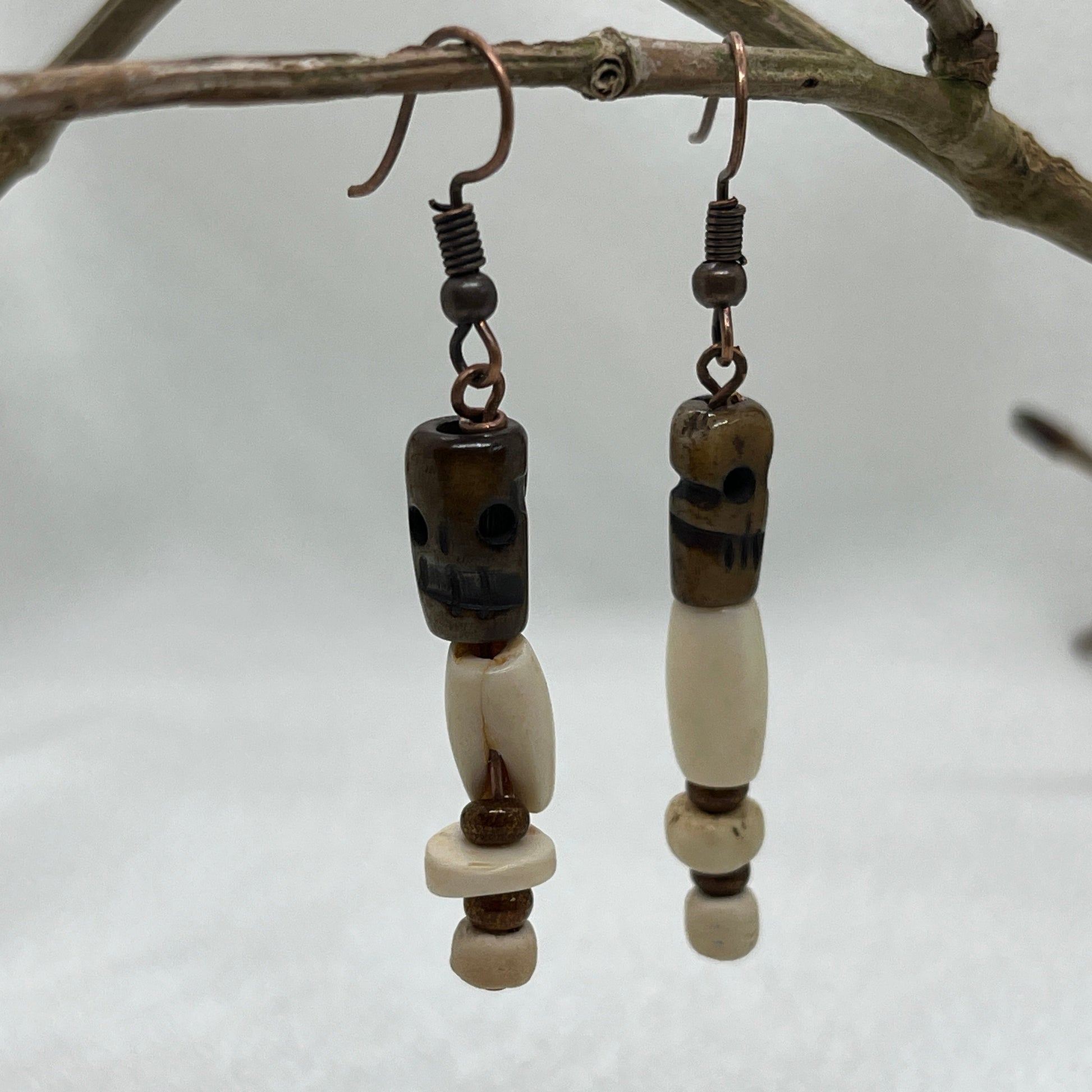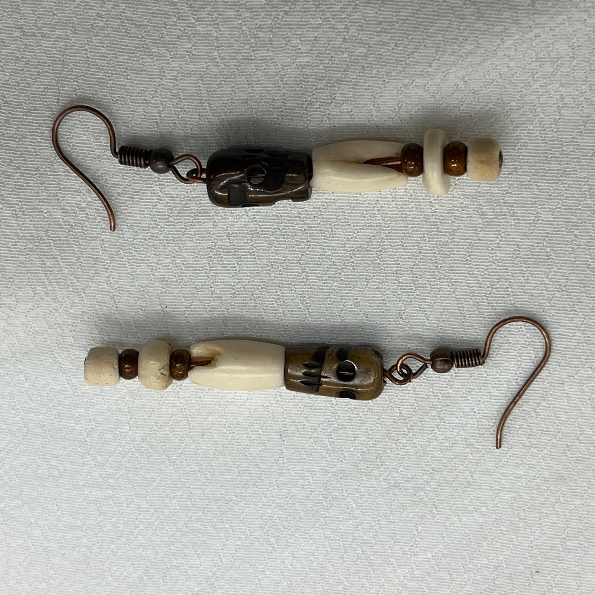 Rigtig halloween øreringe i kobber med et Tigerøje kranium og hvide træ og koralperler sammen med brune seedbeads.