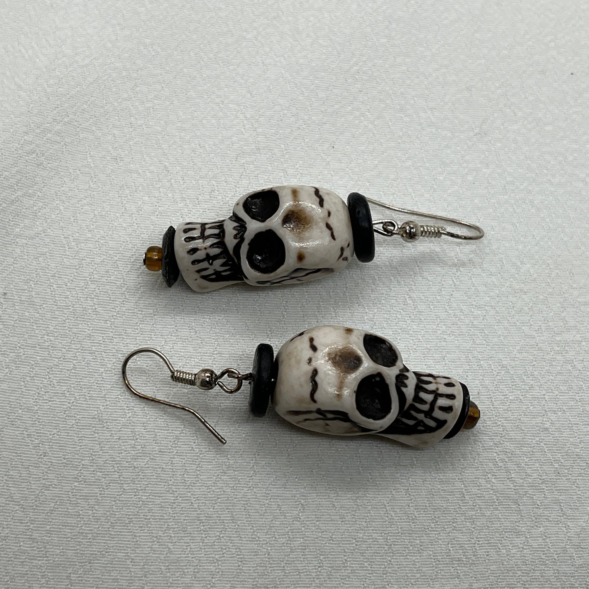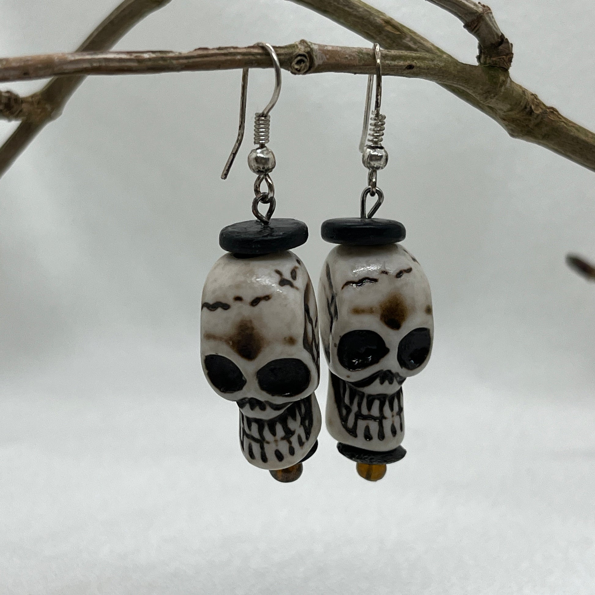 Øreringe i sølv. Rigtig halloween ørering med et stort hvidt kranium og med sorte træperler over og under kraniet... virkelig uhyggelig!