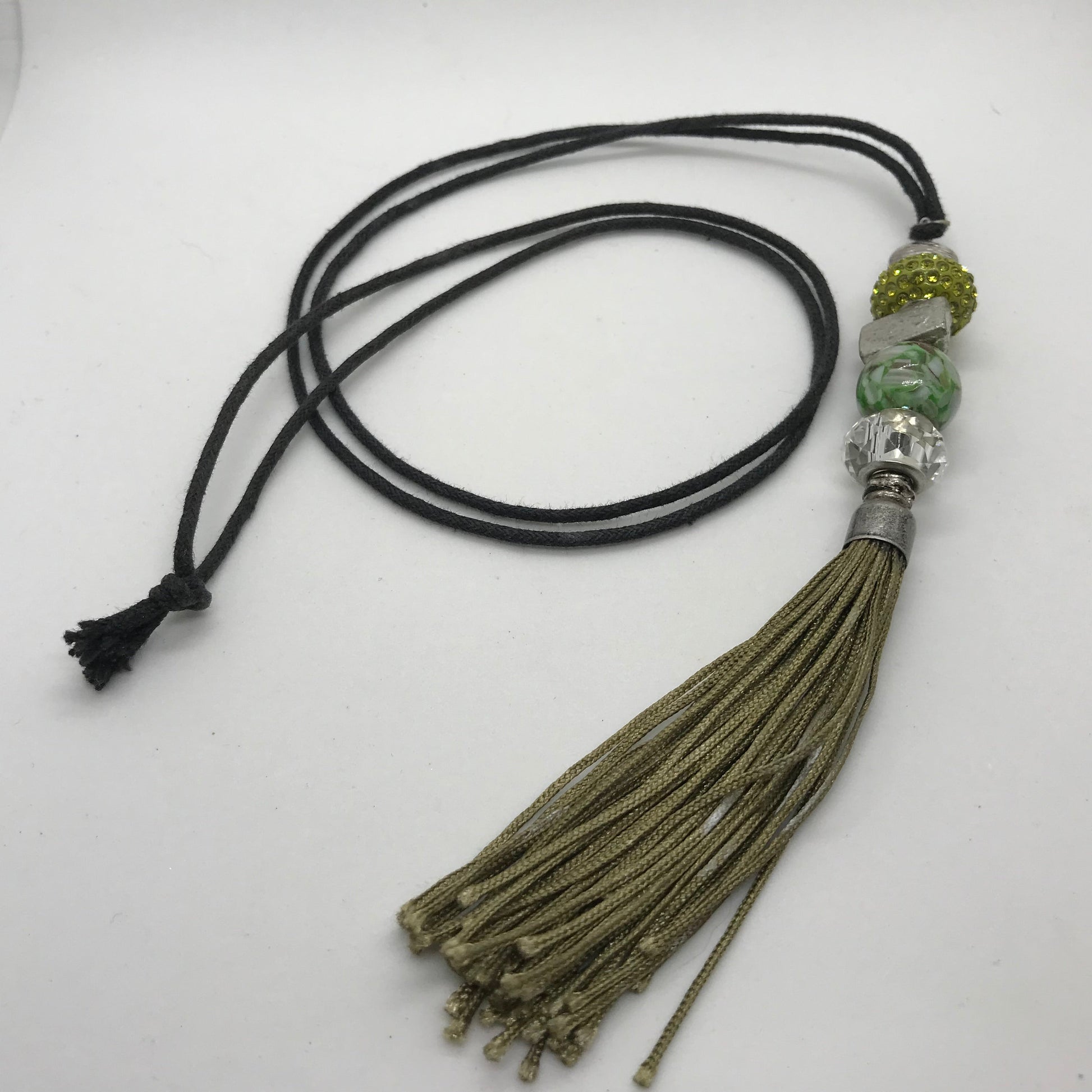 Halskæde i sort polyestersnor, hvorpå der sidder både metalperler, glasperle og perler der ligner troldkugler. Afslutningsvis sidder der en smuk grøn polyester kvast.