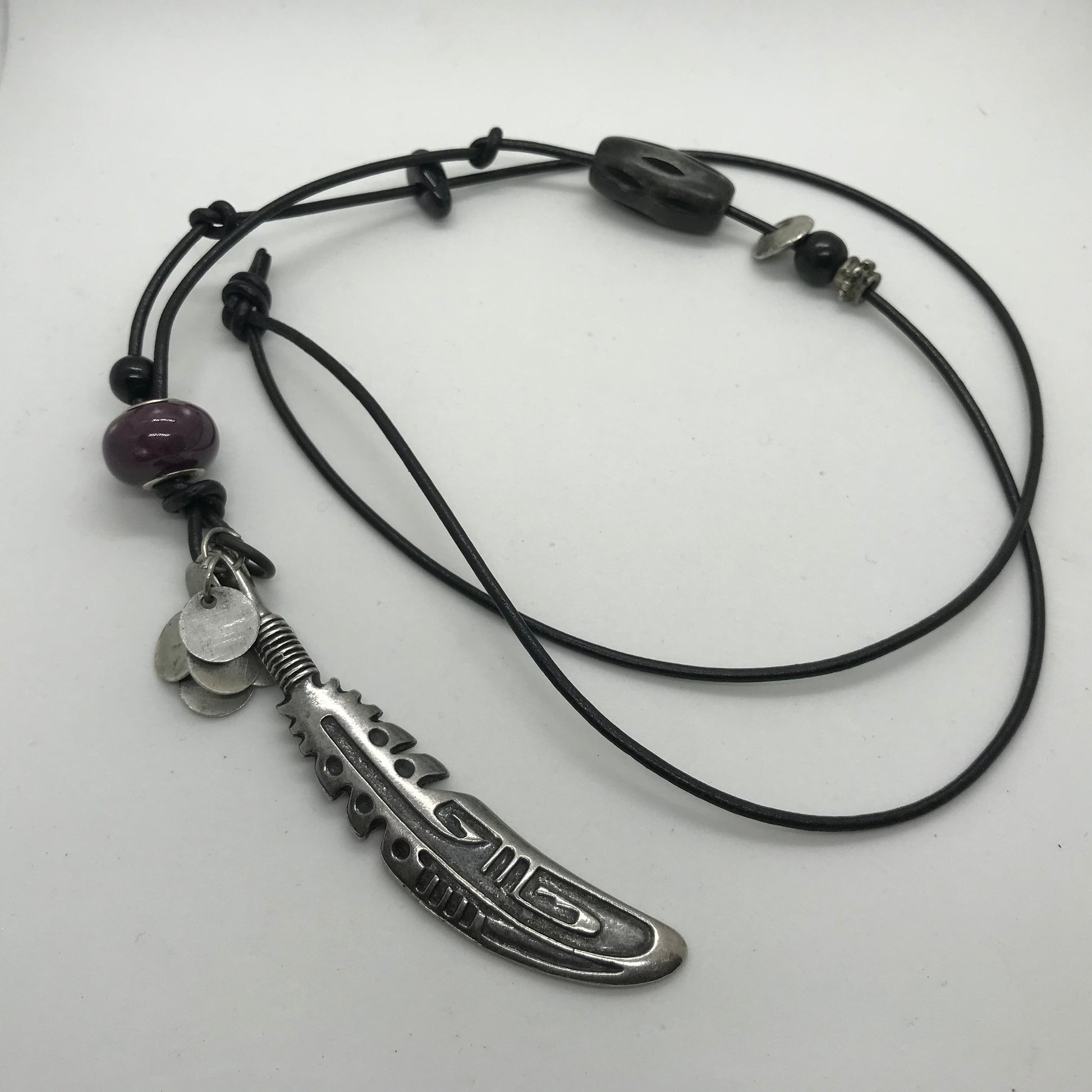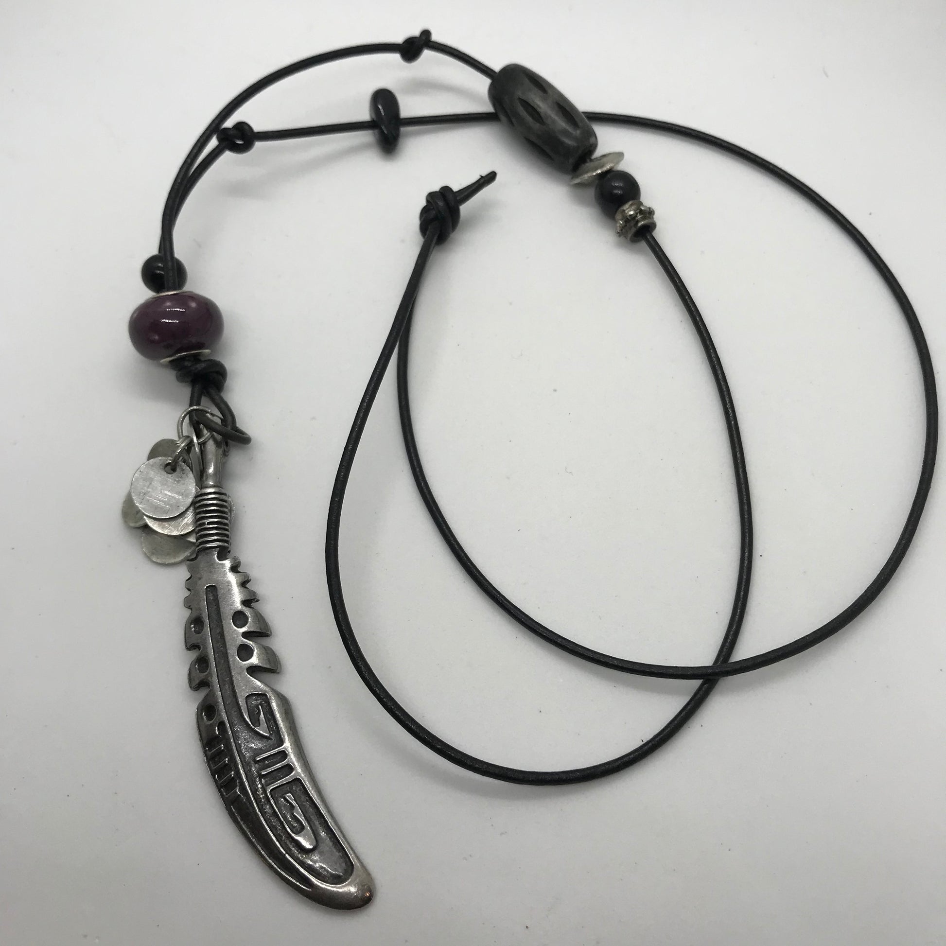 Halskæde i læder med lilla perle og sabel