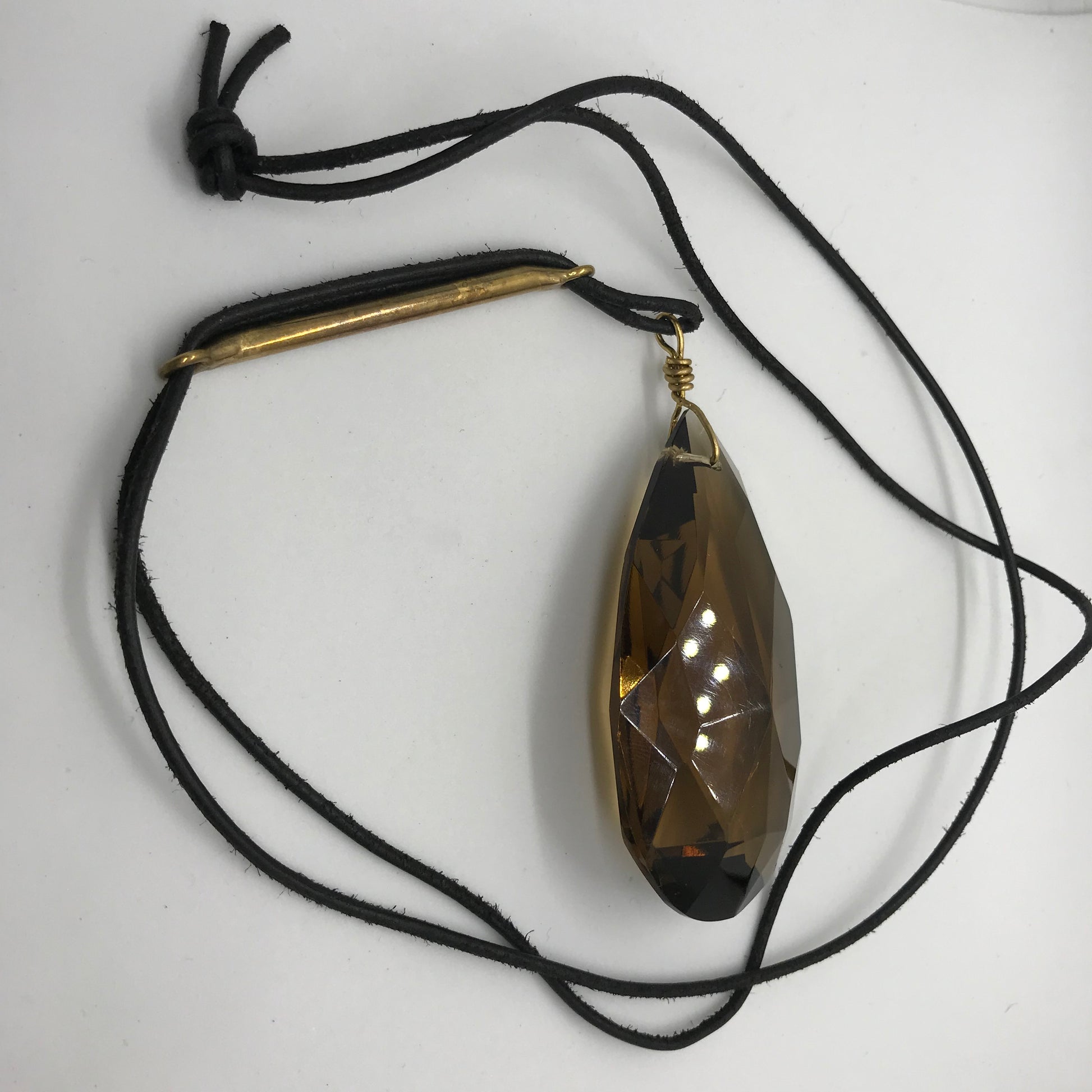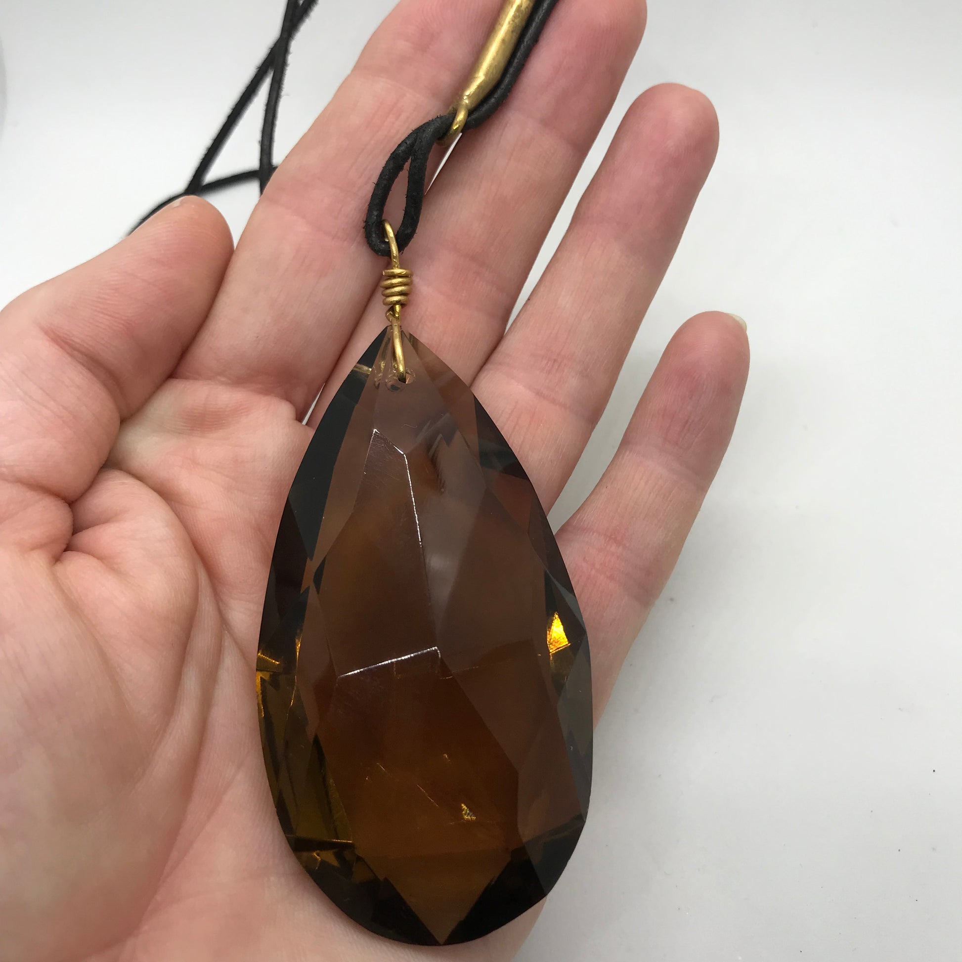 Wow med wow på !! Her er et sjældent smykke der er helt sit eget. Denne store røgfarvede facetterede glas prisme er helt ustyrlig smuk. Den har engang haft et liv som en del af en lysekrone, lige indtil jeg fik fingerne i den.
