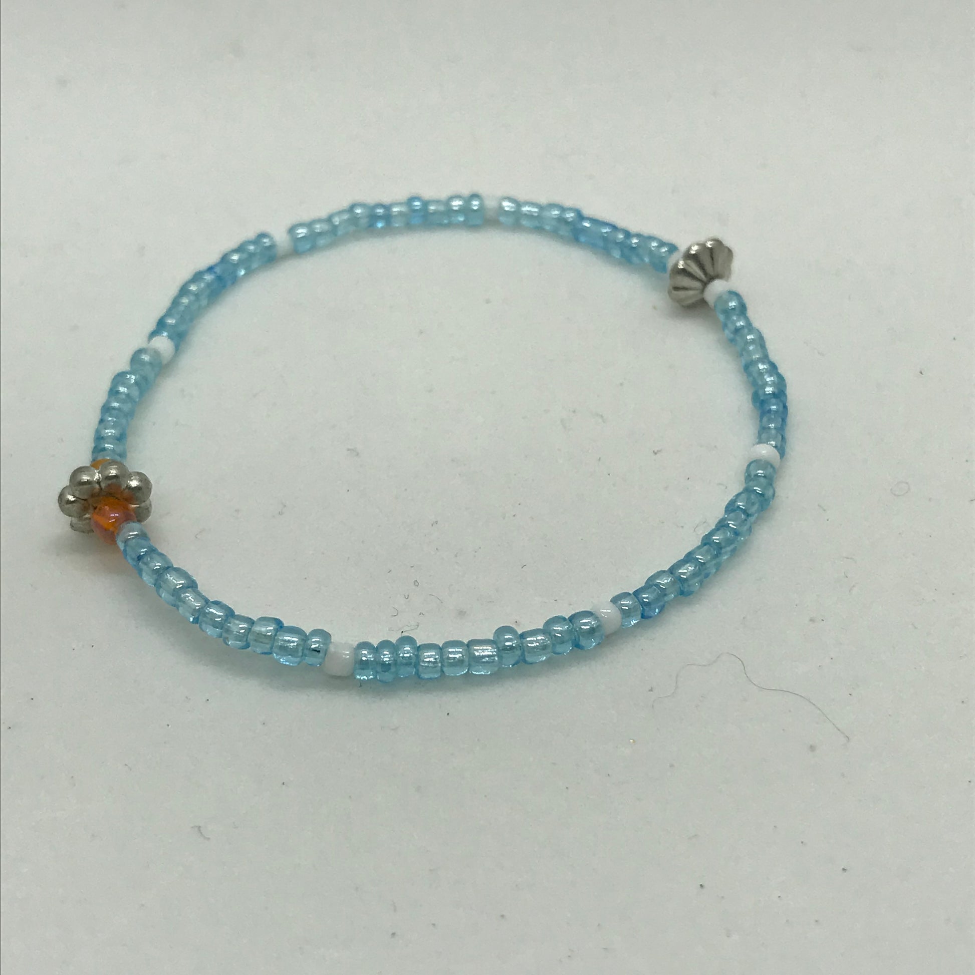 Super fint armbånd med blå seedbeads, blandet med lidt orange og hvide farver, og tilsat 2 små metal perler.