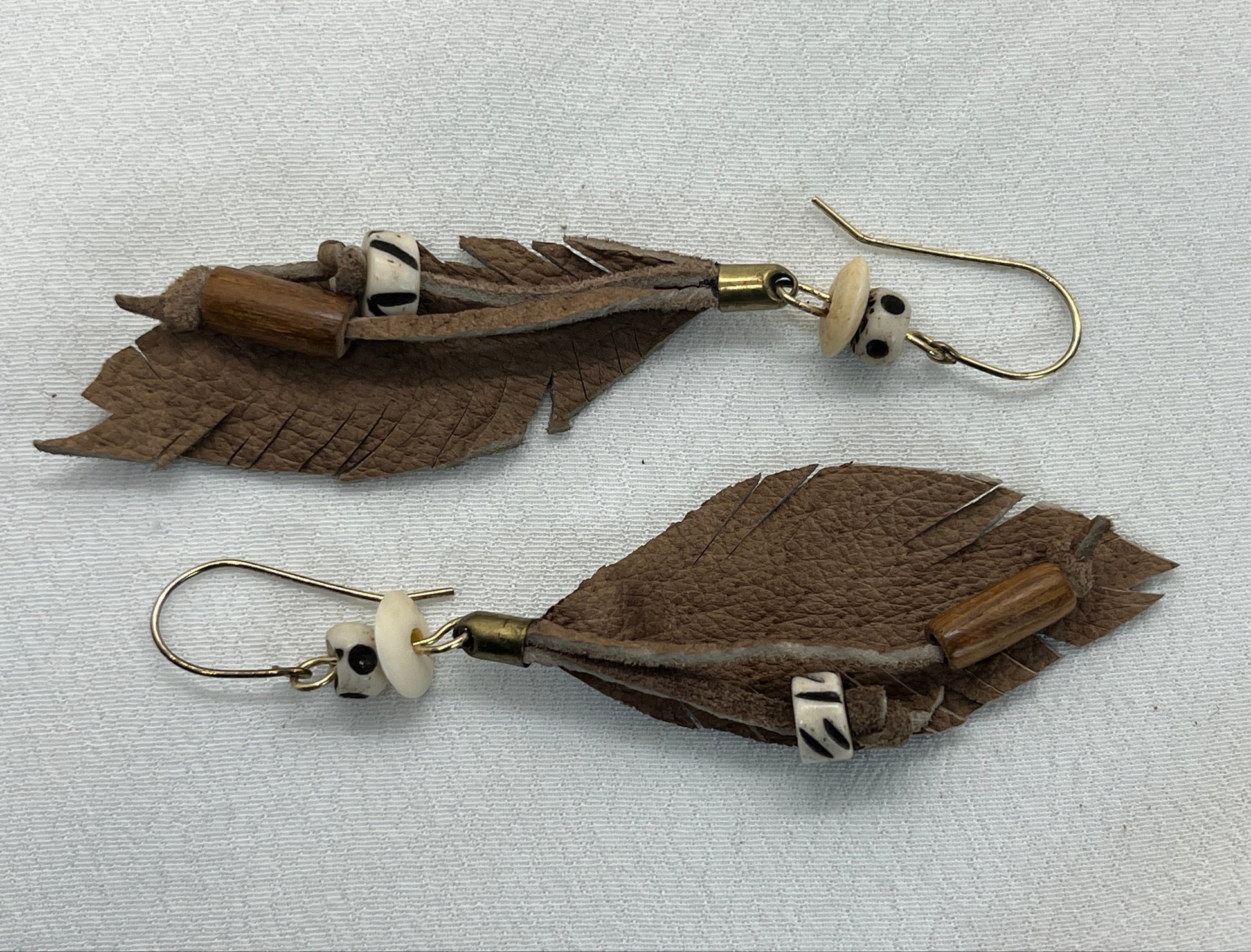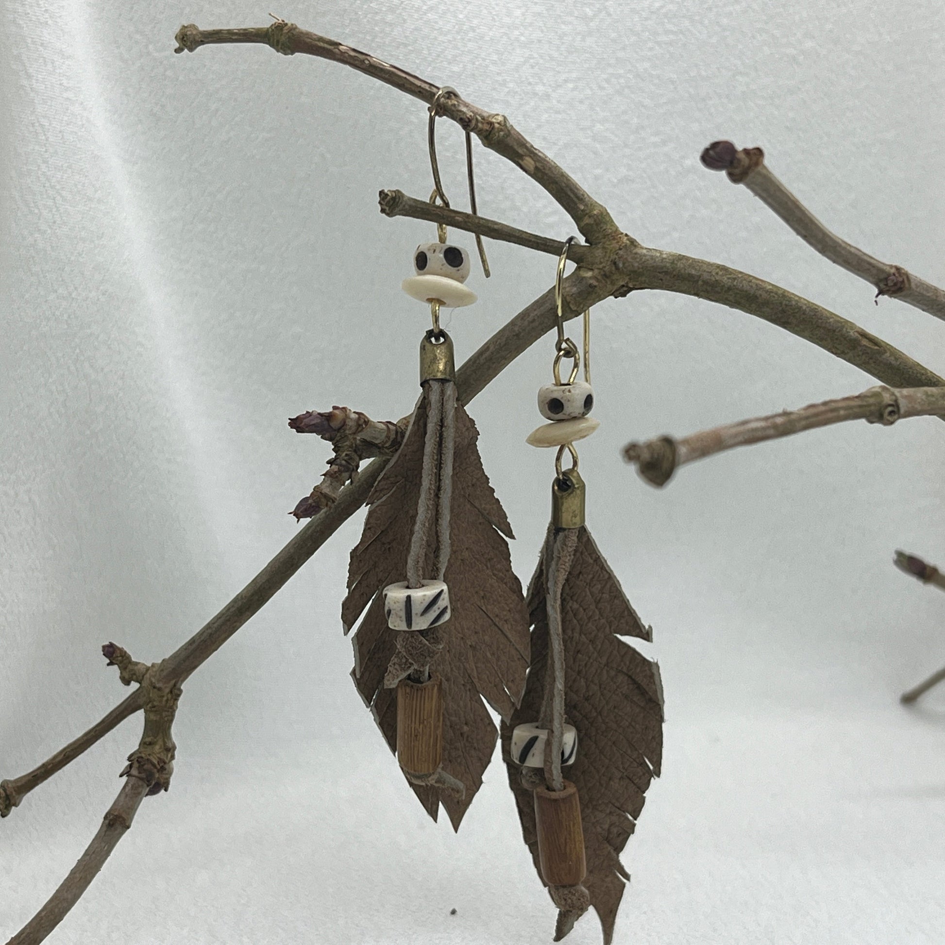 Messing øreringe med skind der er klippet som fjer. Der er påsat benperler og vedhæng med træ og ben. Super cool øreringe.