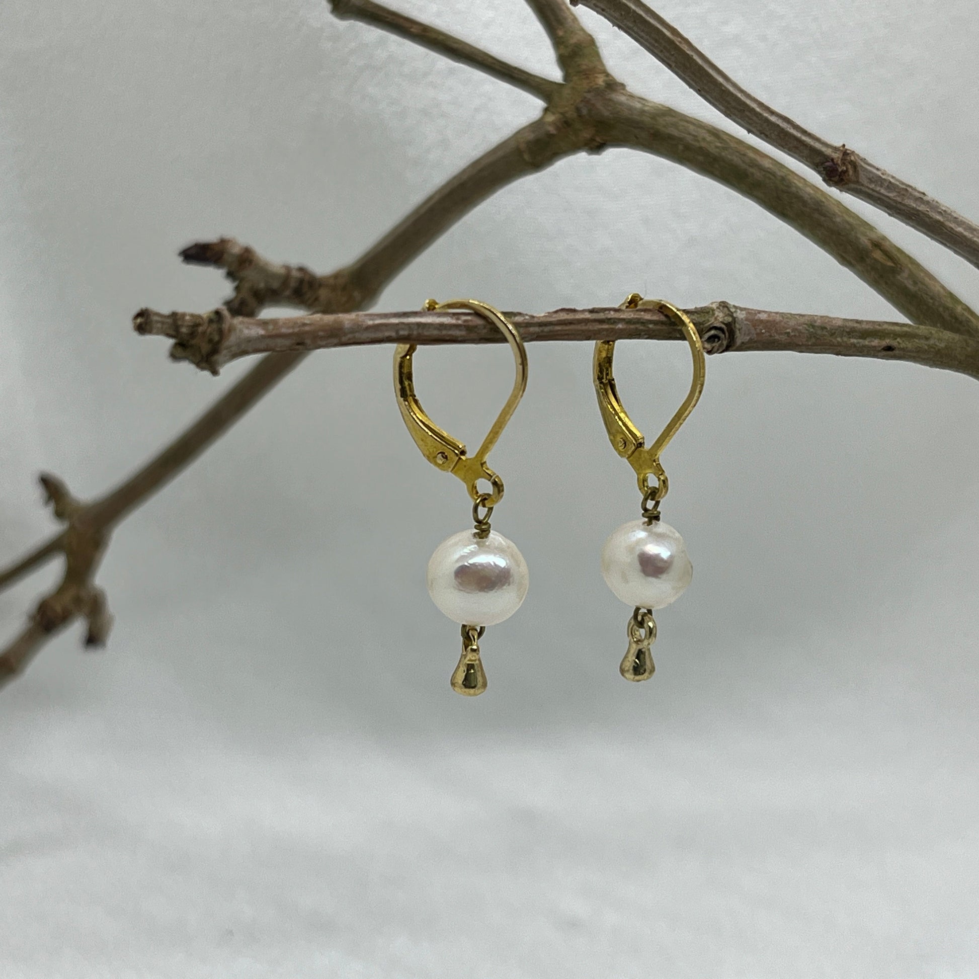 Søde brioche messing øreringe med en smuk Ferskvandsperle og en lille dumbell i forgyldt messing som afslutning.