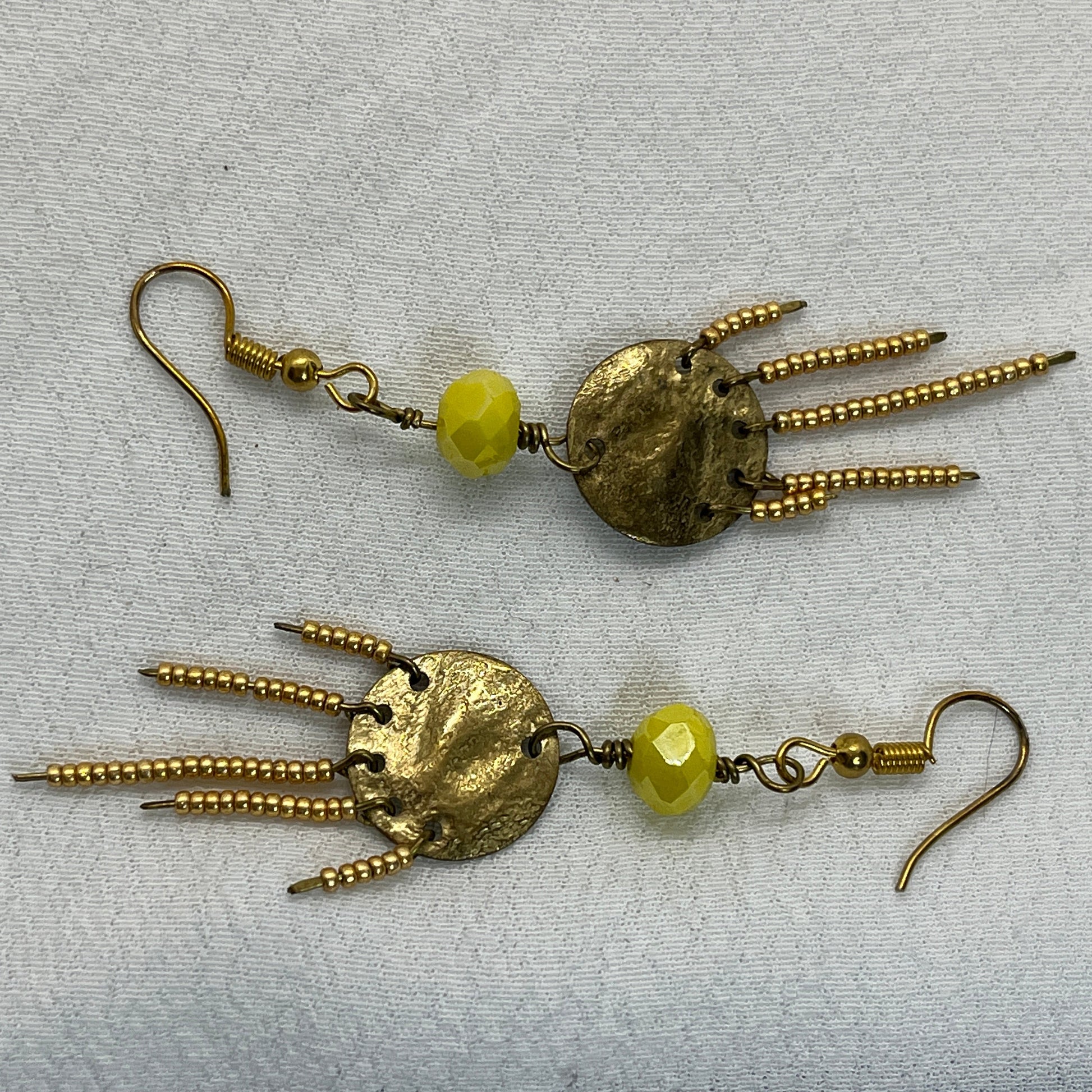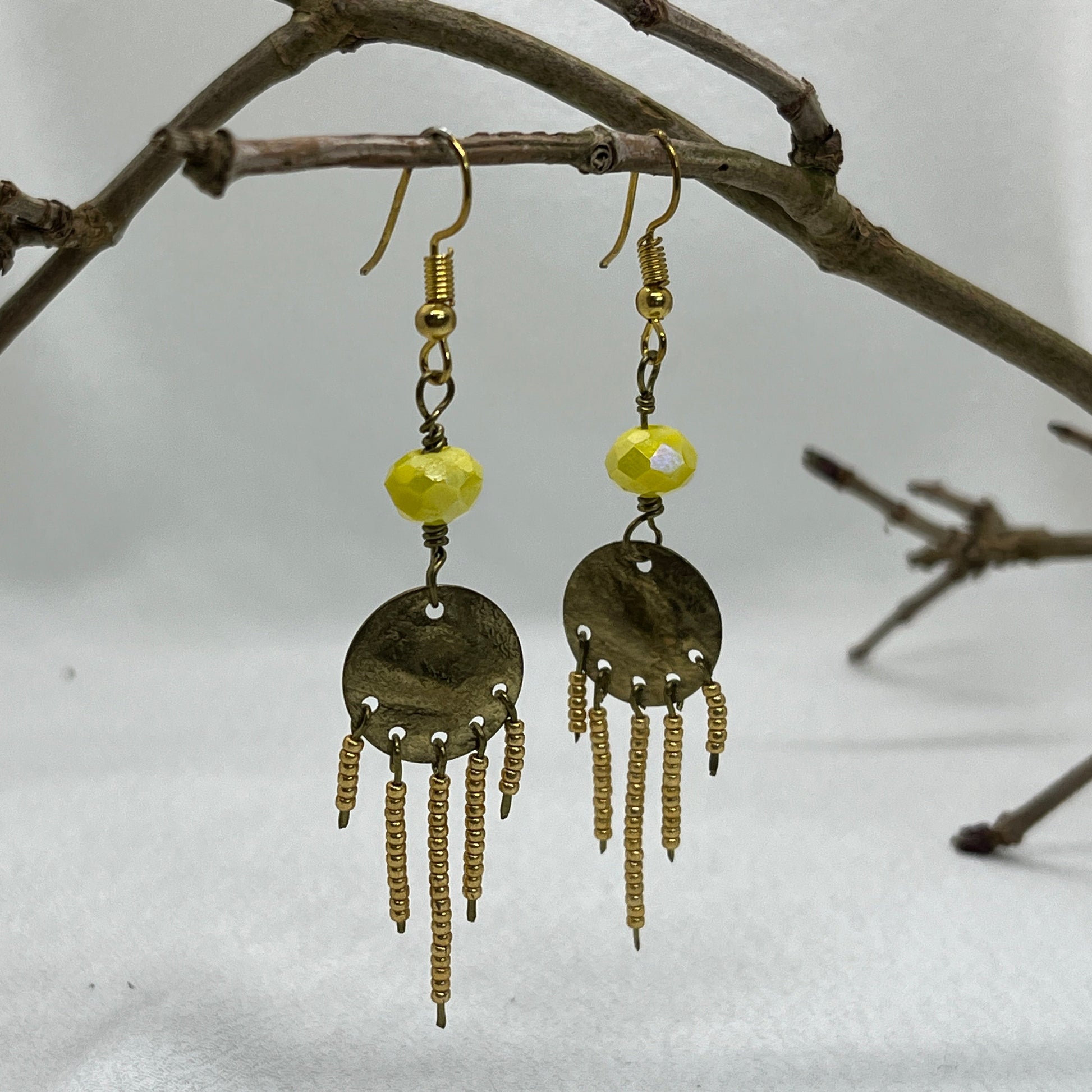 Øreringe i messing med et super flot vedhæng af gul facetteret stenperle. Herefter er der en messing plade med 5 grene messingtråde med små perler belagt med ægte guld.