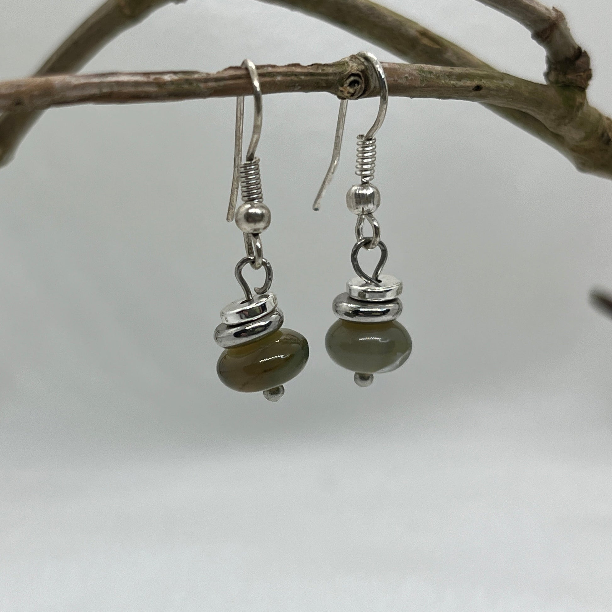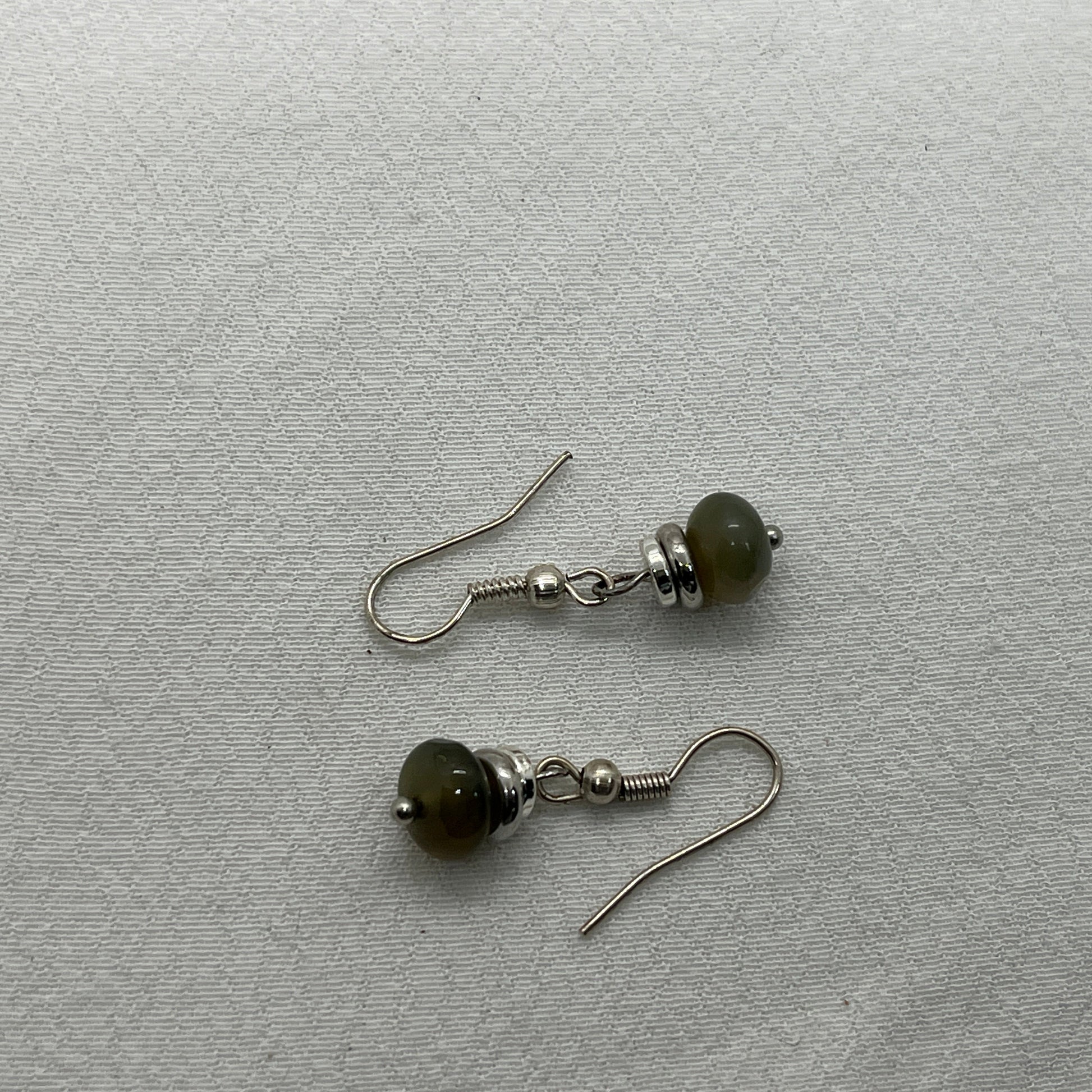 Øreringe i sølv med elipseformet vissengrøn glasperle på sølvstilk samt et par møntformede metalperler.