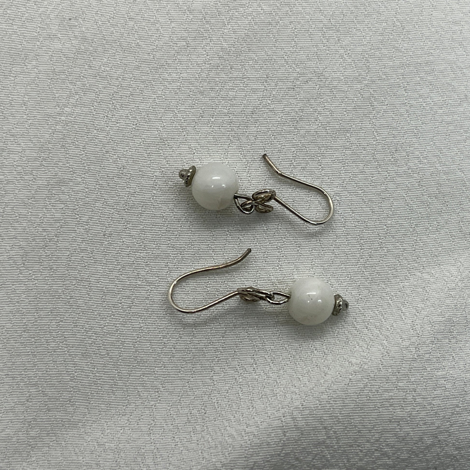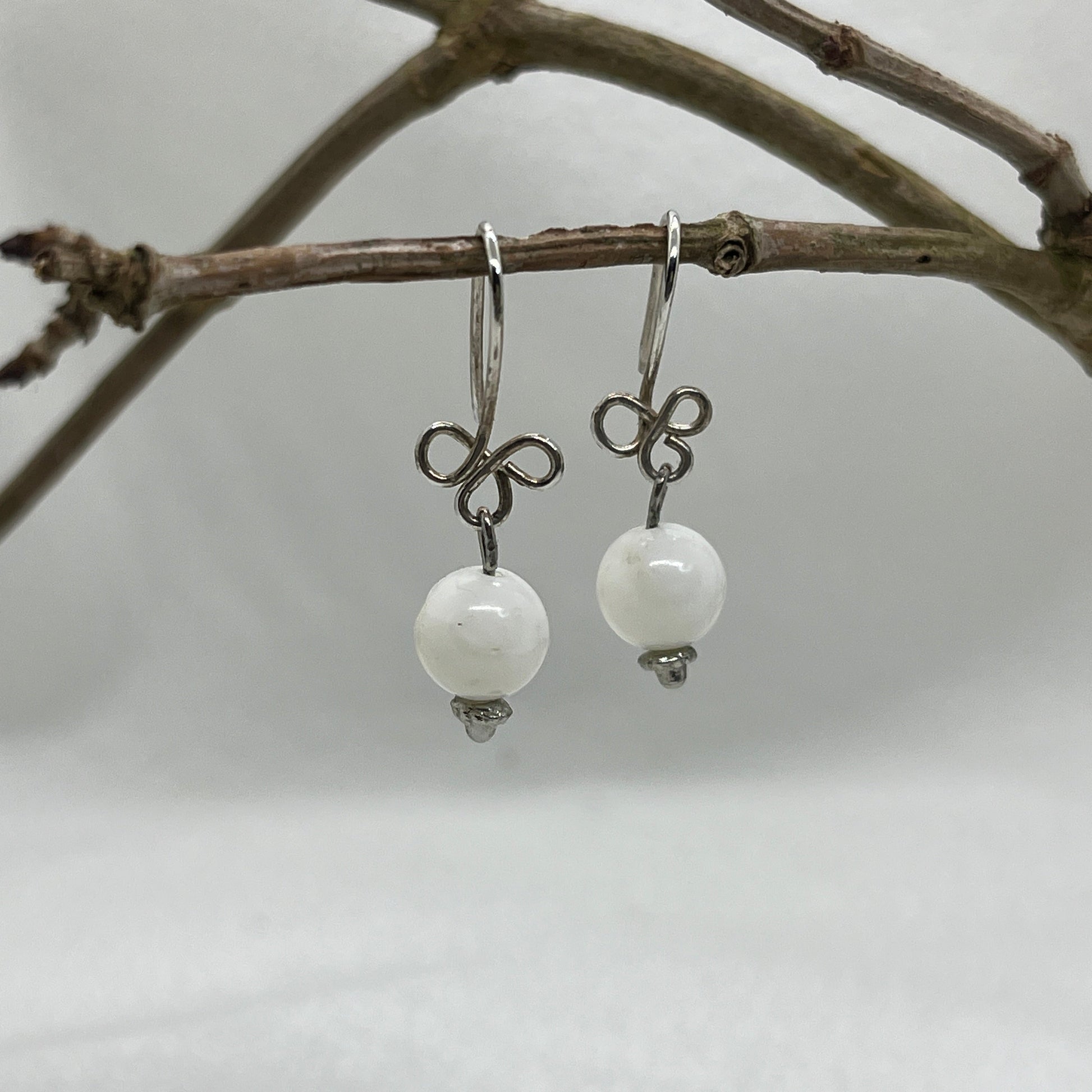 Smukke øreringe i ægte sølv. Sølvtråden er bukket som et trekløver og der er hængt en fin hvid Jade på med en ægte sølvperlestilk.