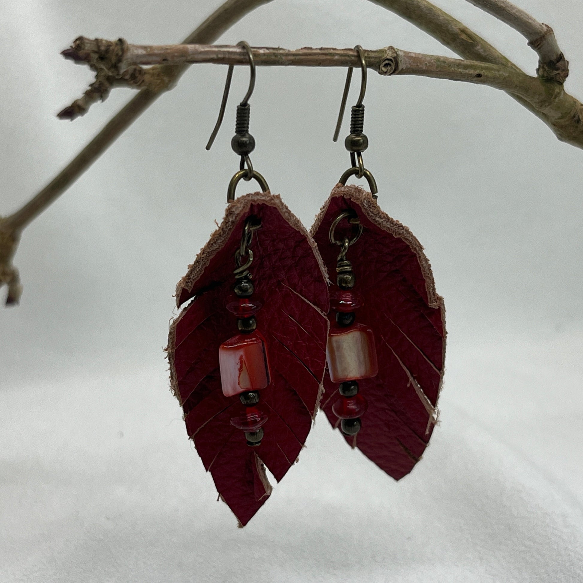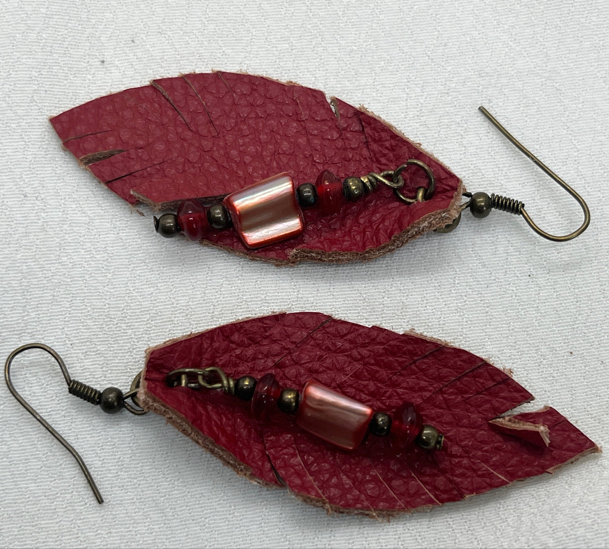 Antik messing ørering med vedhæng i rødt skind, klippet som en fjer. Som vedhæng inde i fjeren er der både røde og antikmessing perler på en messing tråd. Rigtig hippiestyle.