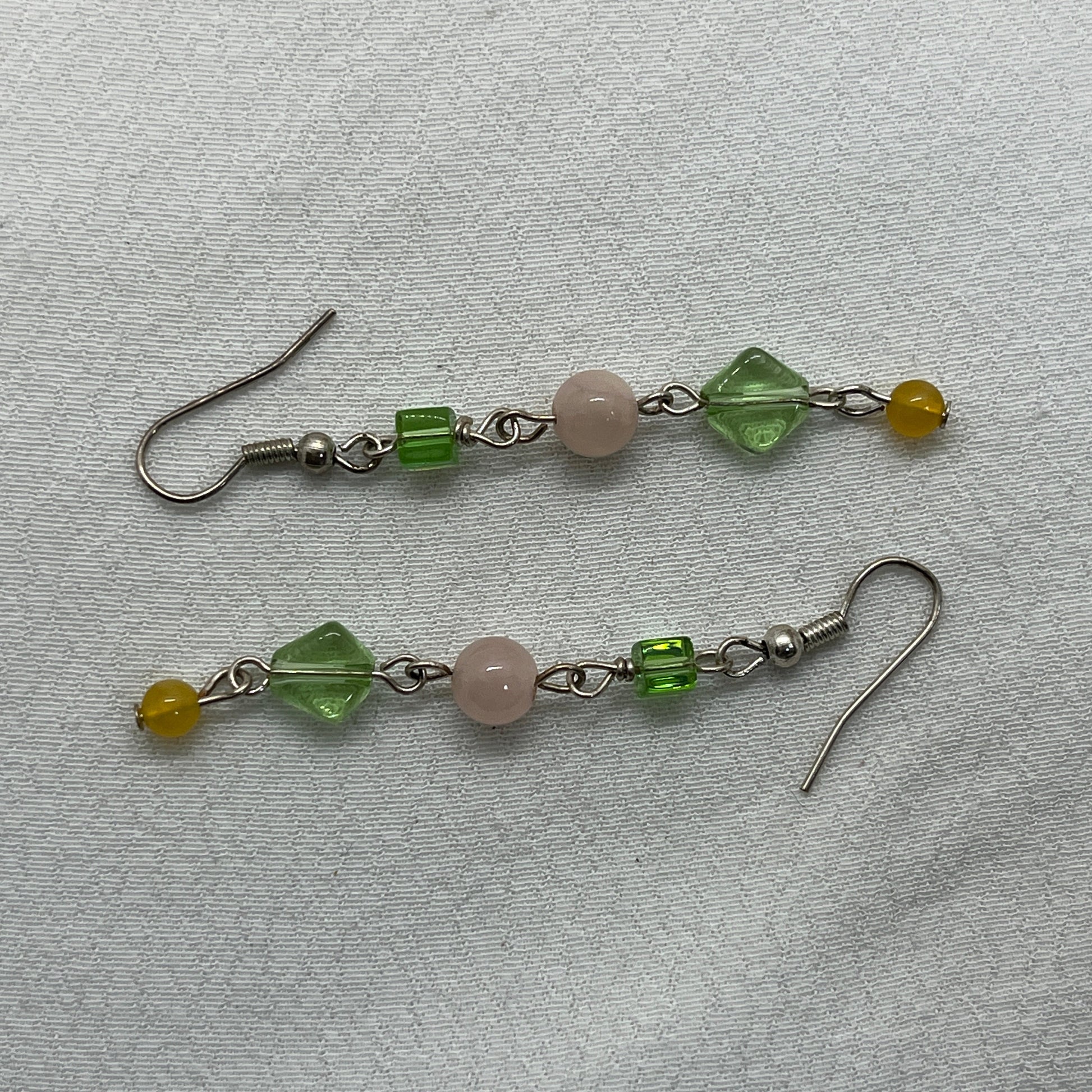 Øreringe i sølv med de fineste grønne akryl perler, en lille Rosenkvarts og afsluttet med en indfarvet gul Jade. Meget fine øreringe