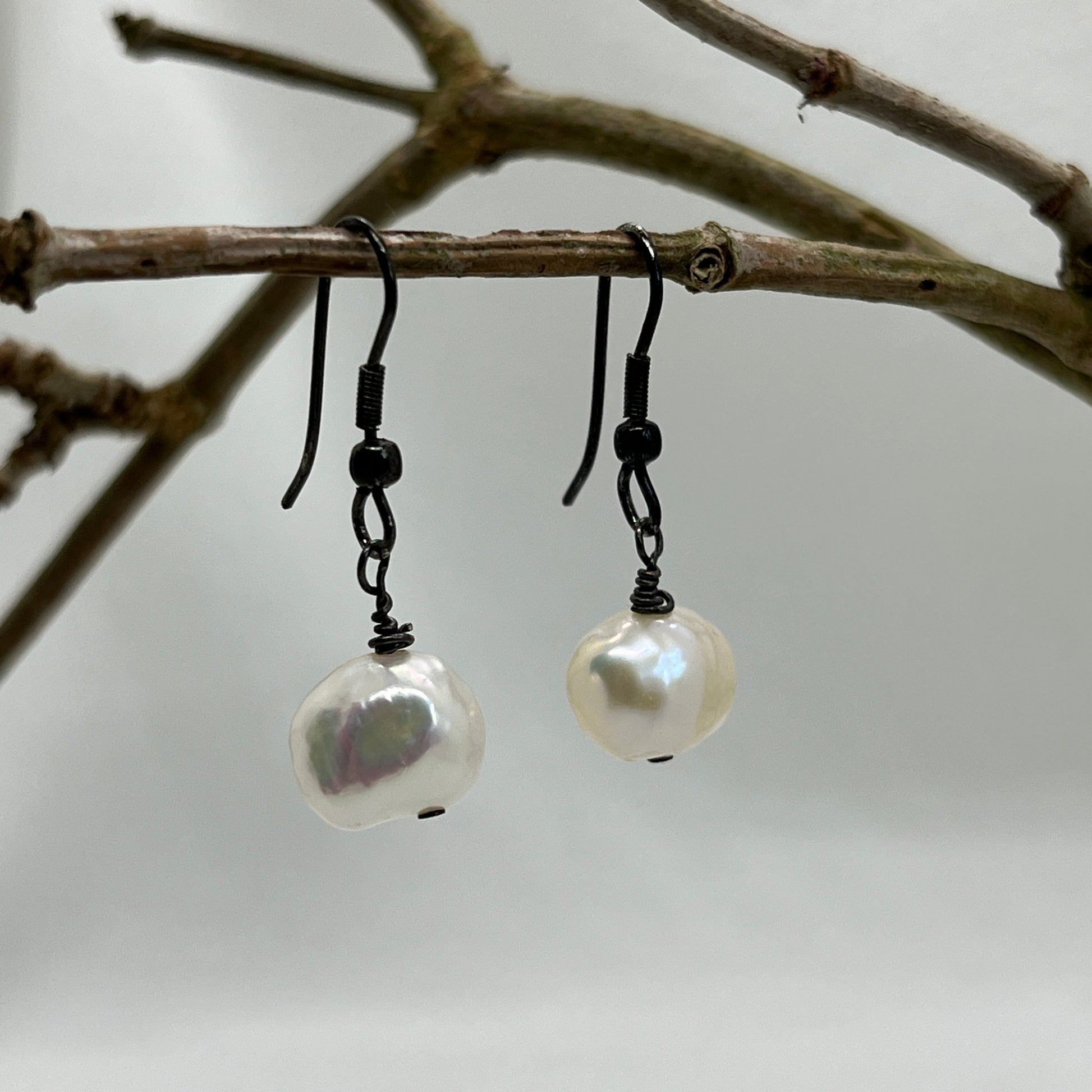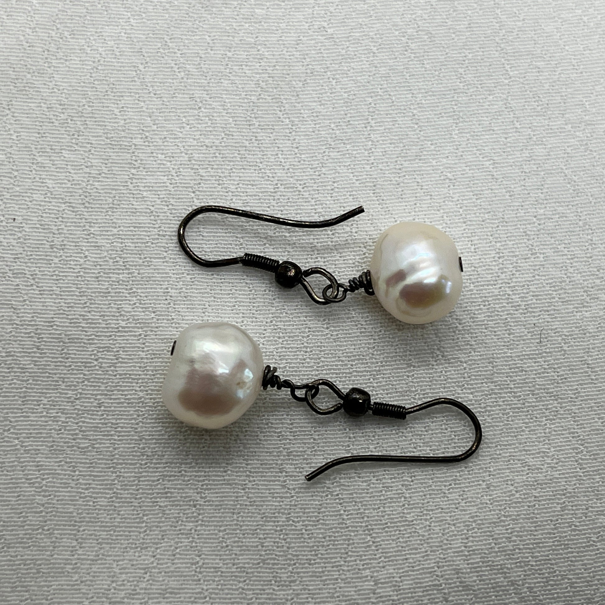 Smukke ferskvandsperler på sort gunmetal ørekrog, sort perlestilk holder den store 0.8 mm Ferskvandsperle på plads.