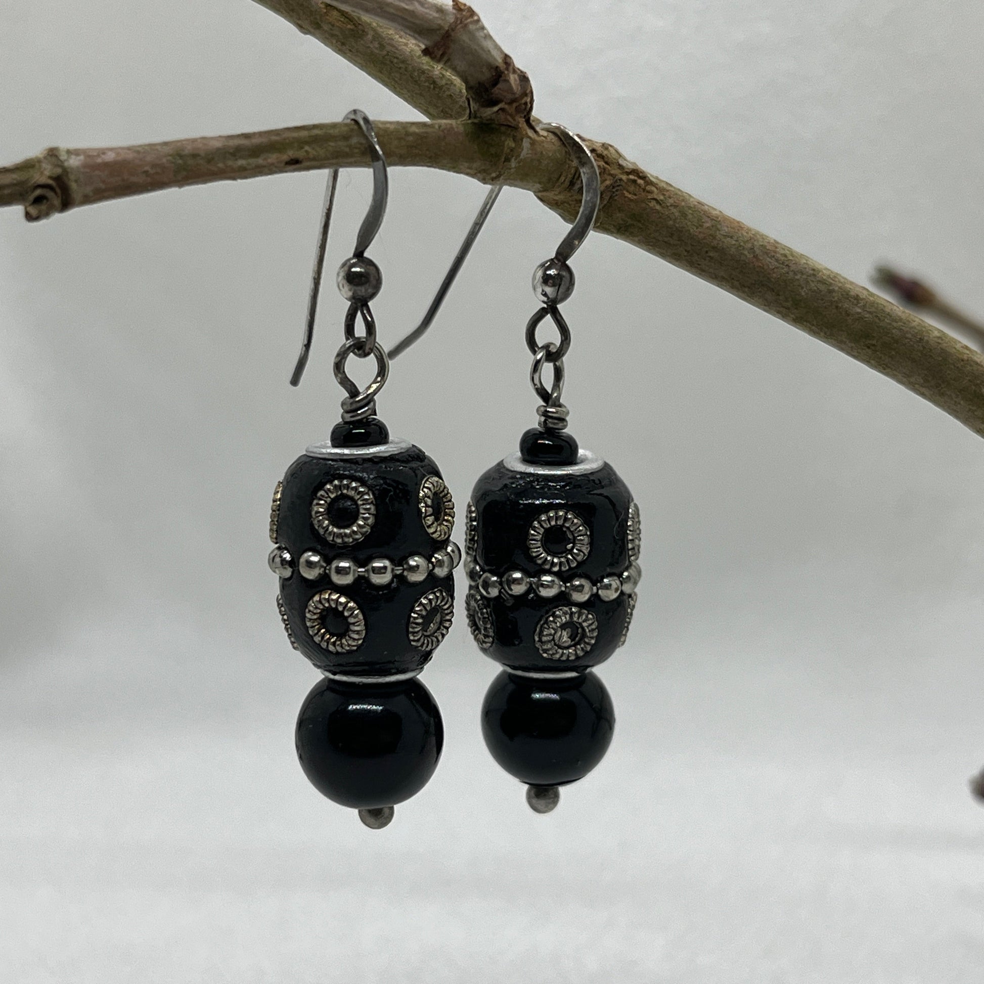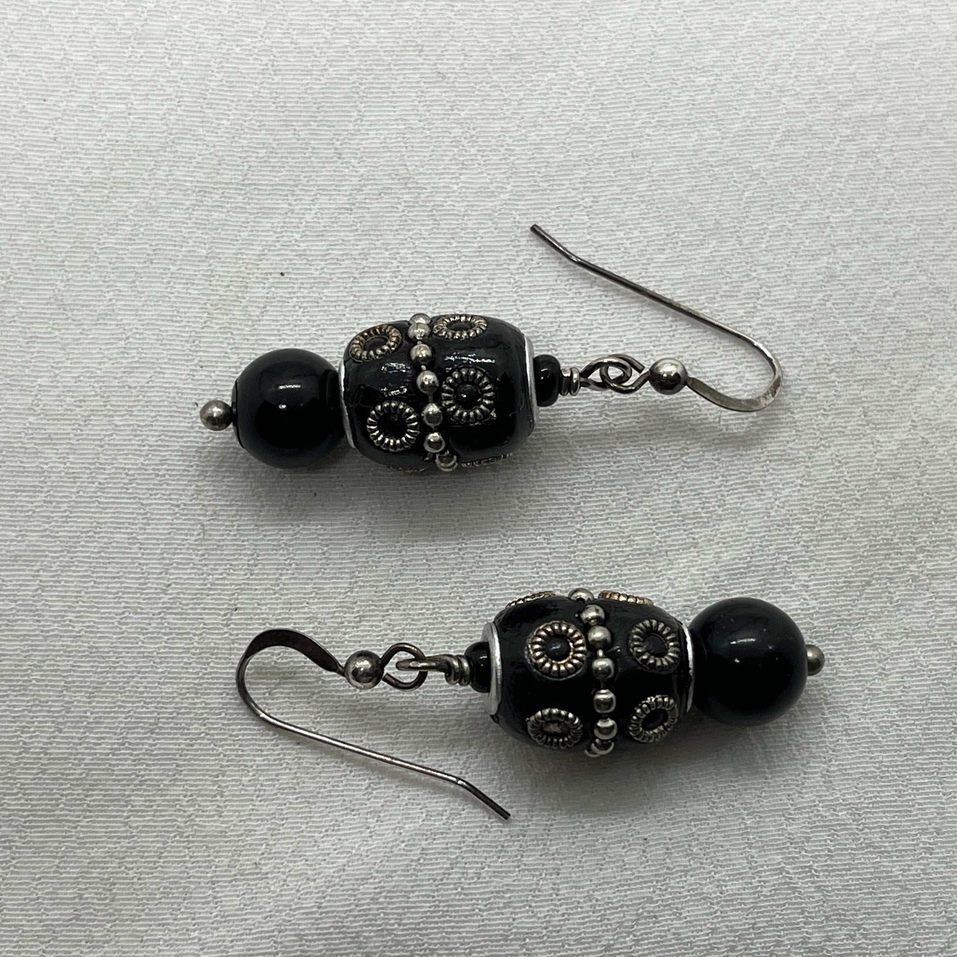 Smuk og speciel ørering i ægte sølv med en stor sort perle med sølvornamenter på. Perlen er købt i Østen for år tilbage. Øverst er en lille sort seedbead og nederst en stor sort sten perle, altsammen sat på en sølv perlestilk.