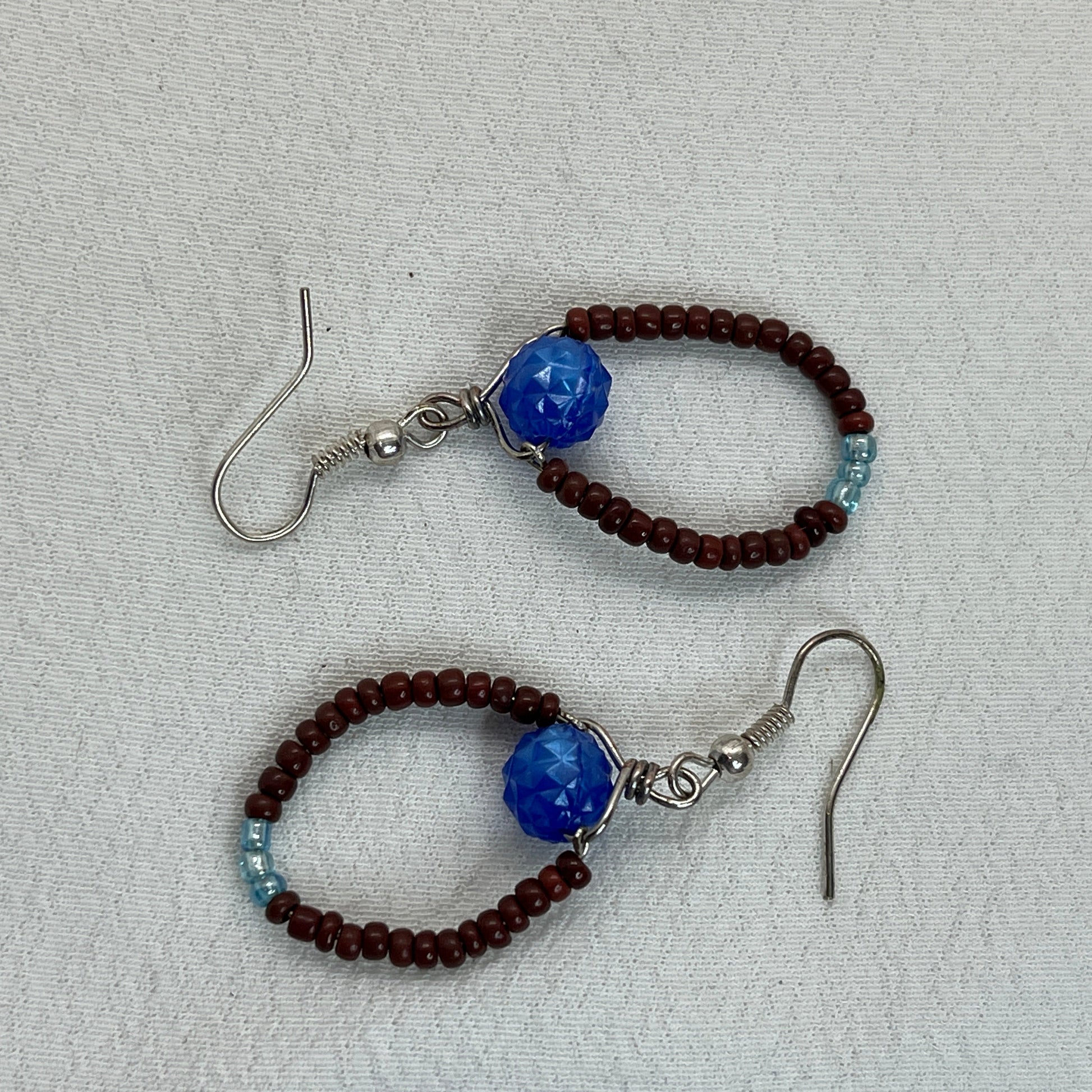 Øreringe i sølv med brune seedbeads og en klar blå perle i midten, altsammen sat på ægte sølvtråd. Gode farver sammen.