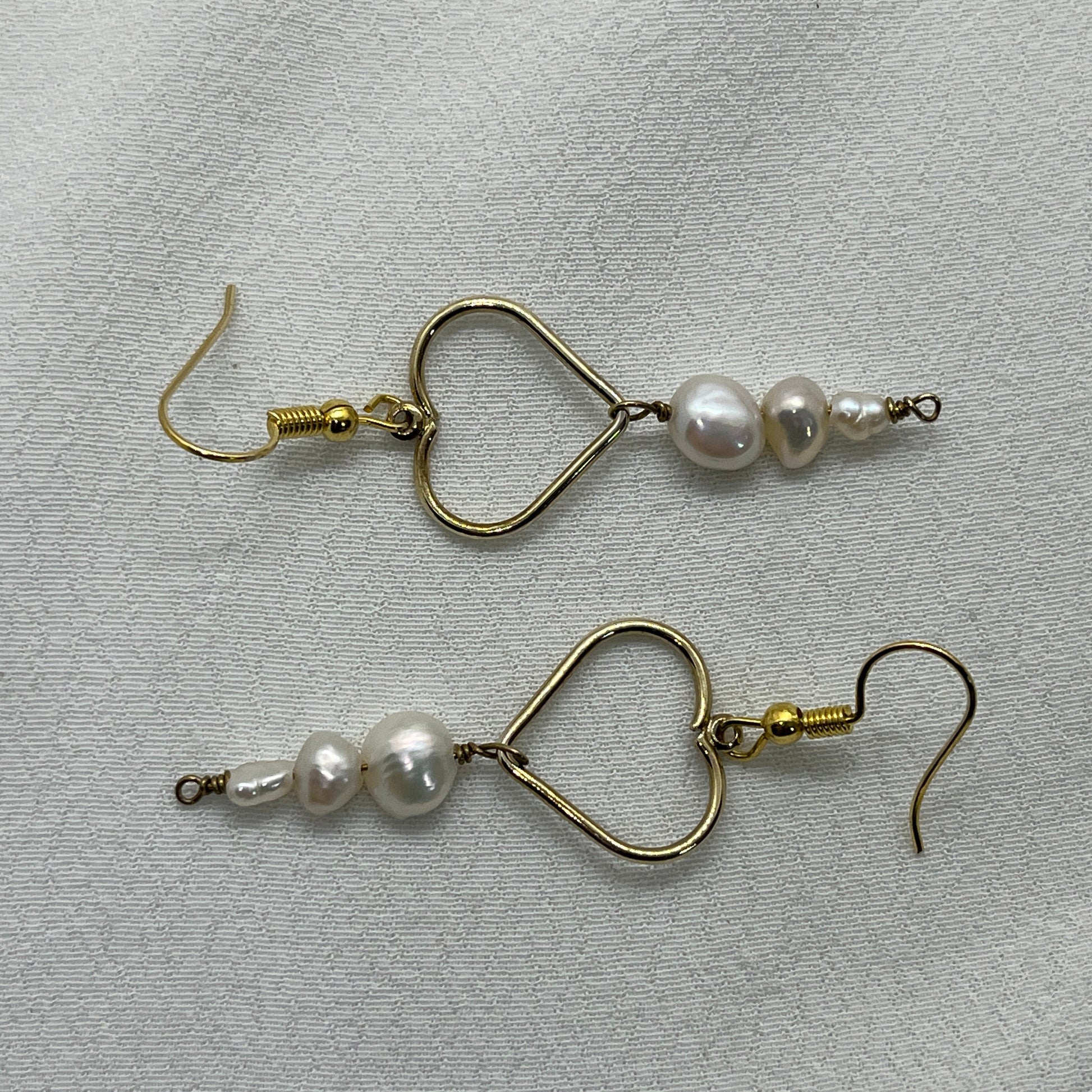 Meget feminine messing øreringe med et hjertevedhæng i messing og 3 flotte Ferskvandsperler i varierende størrelse.
