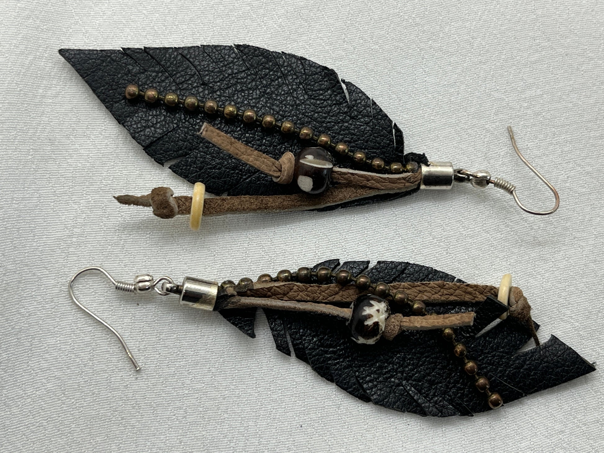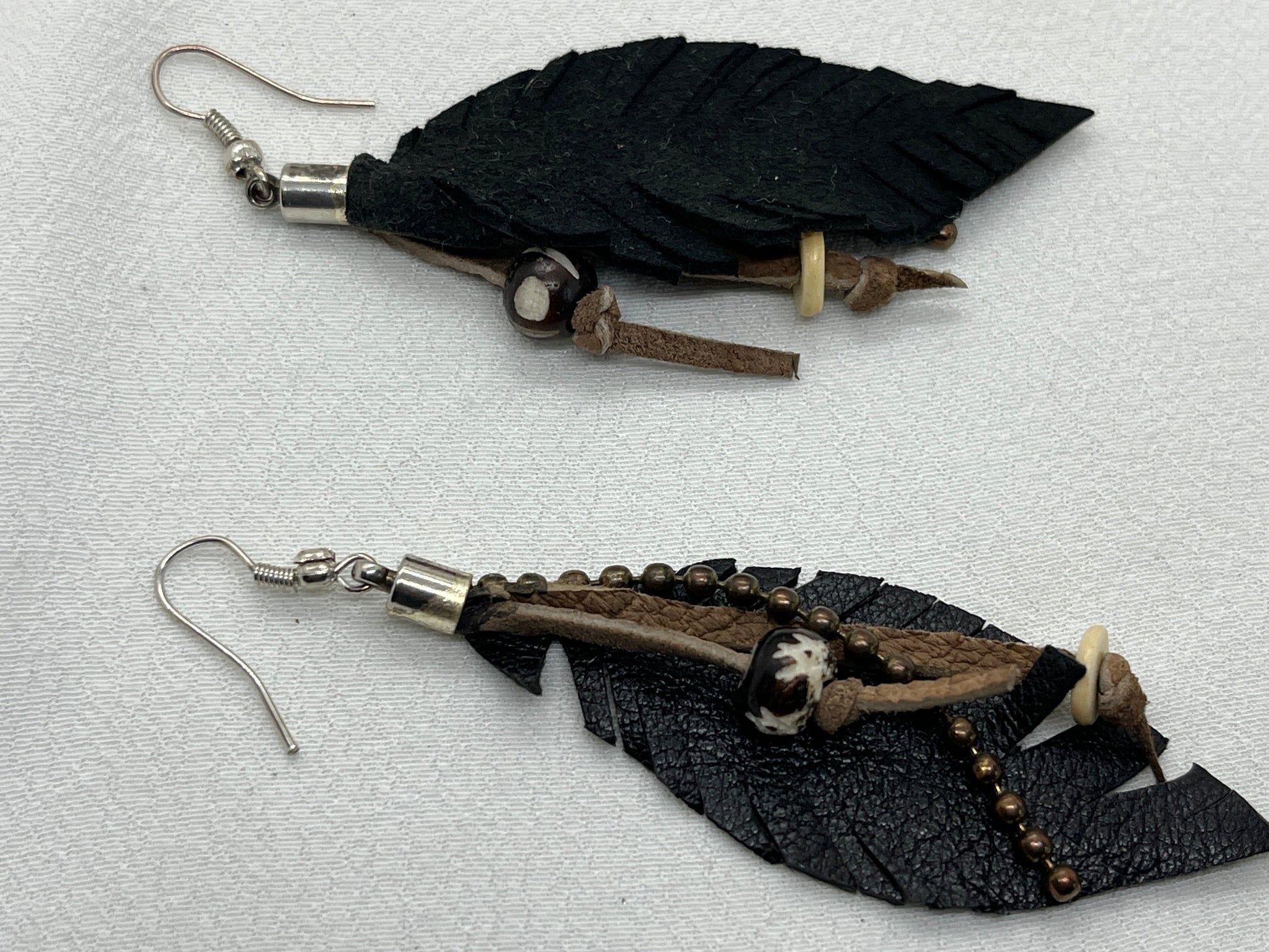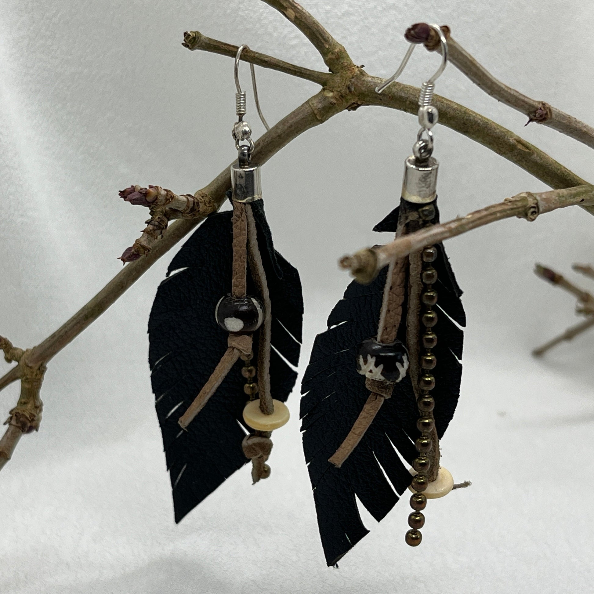 Ørering i sølv med vedhæng i sort skind klippet som fjer, og med xtra vedhæng i skind og bronzekæde og benperler