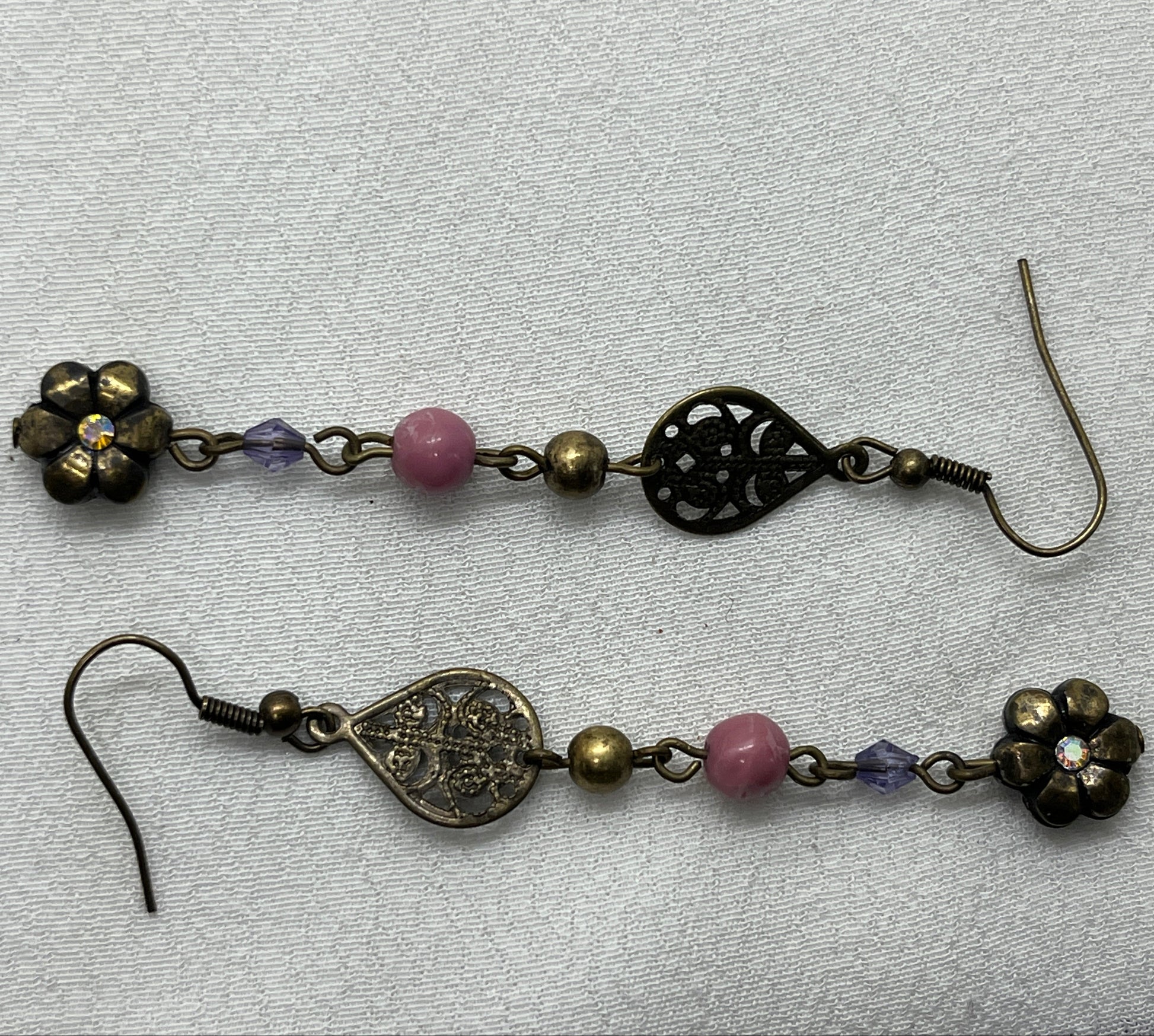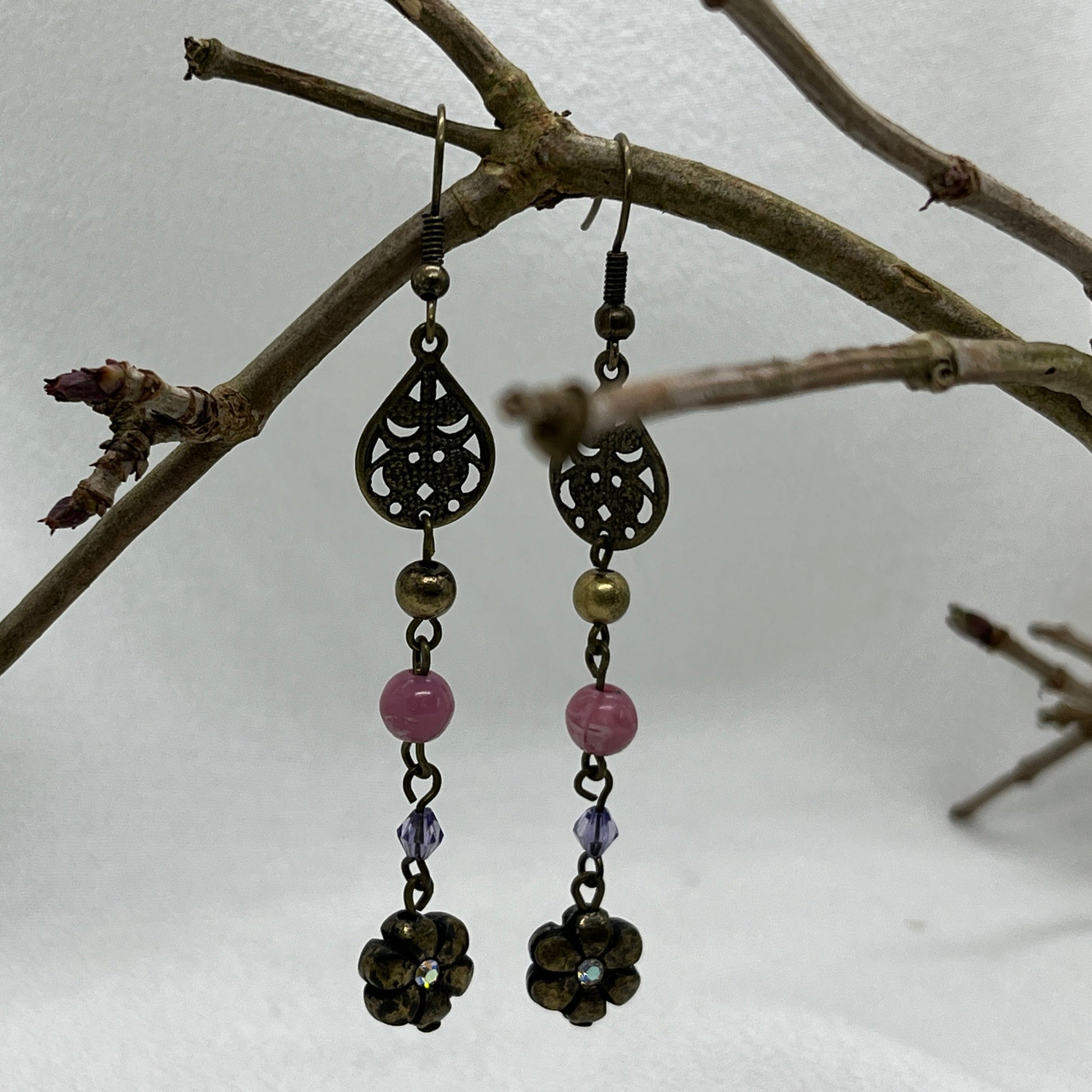 Ørering i antik messing med langt vedhæng. Der er en flad antik messingdråbe med mønster og en antikmessing perle. Rosa perle og facetteret lilla rombe i glas, samt afsluttet med antik messingblomst med similisten.