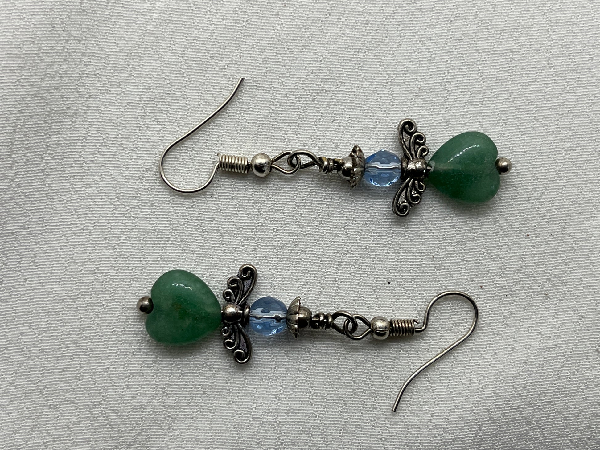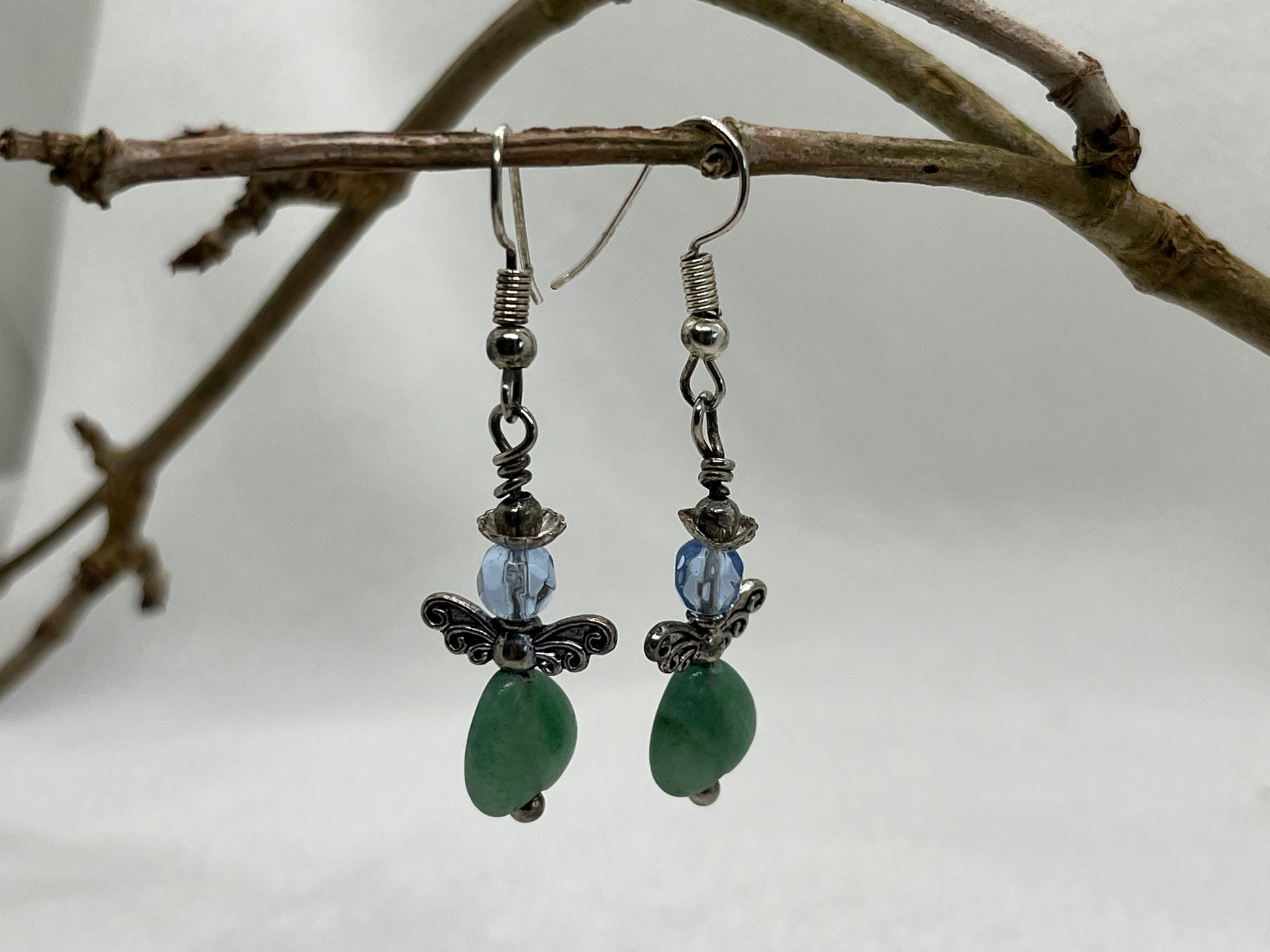 Ørering i sølv med lille engel med sølvvinger, blå facetteret glashoved og grøn Chrysopras kjole, altsammen sat på en sølvpin.