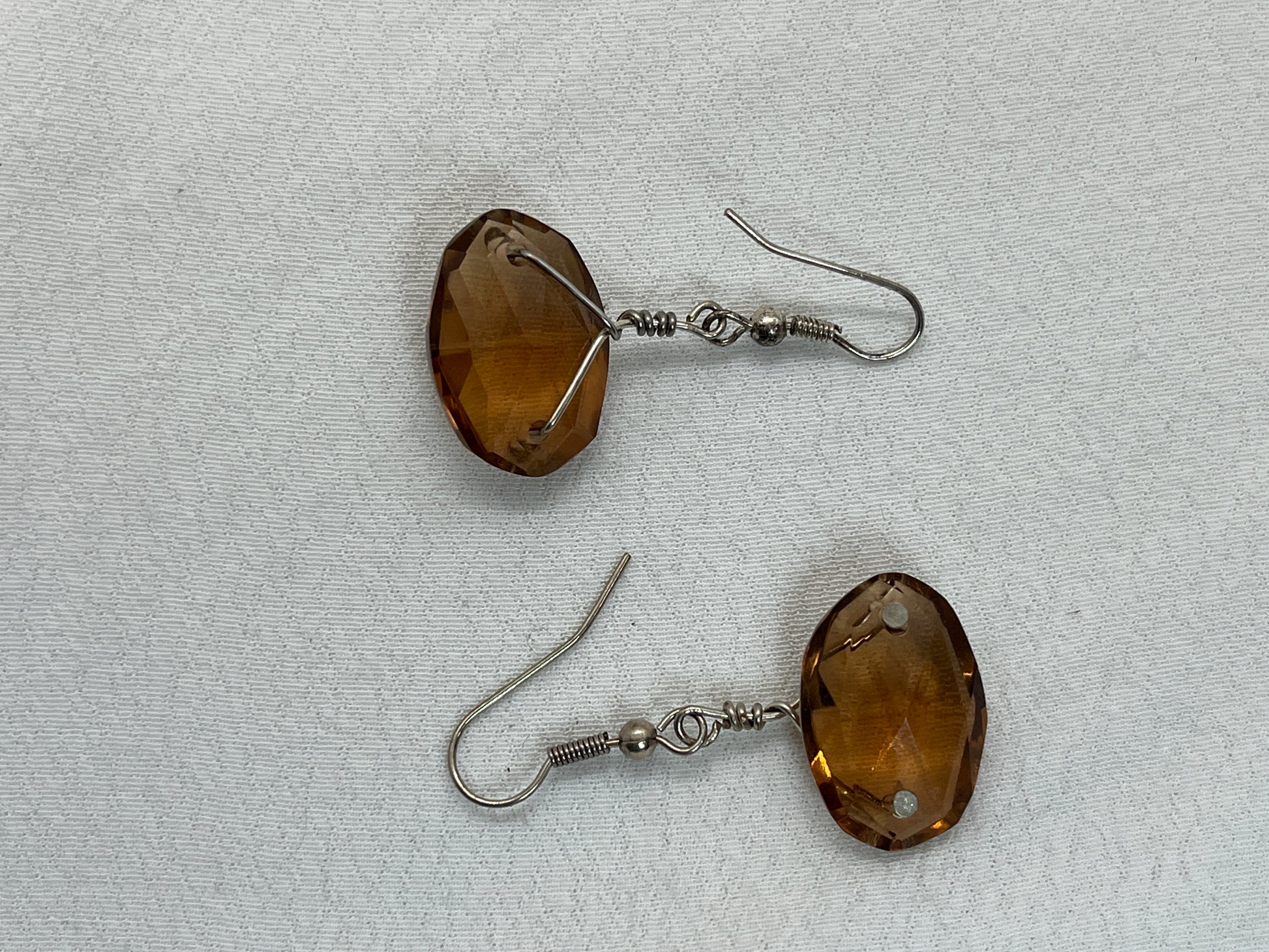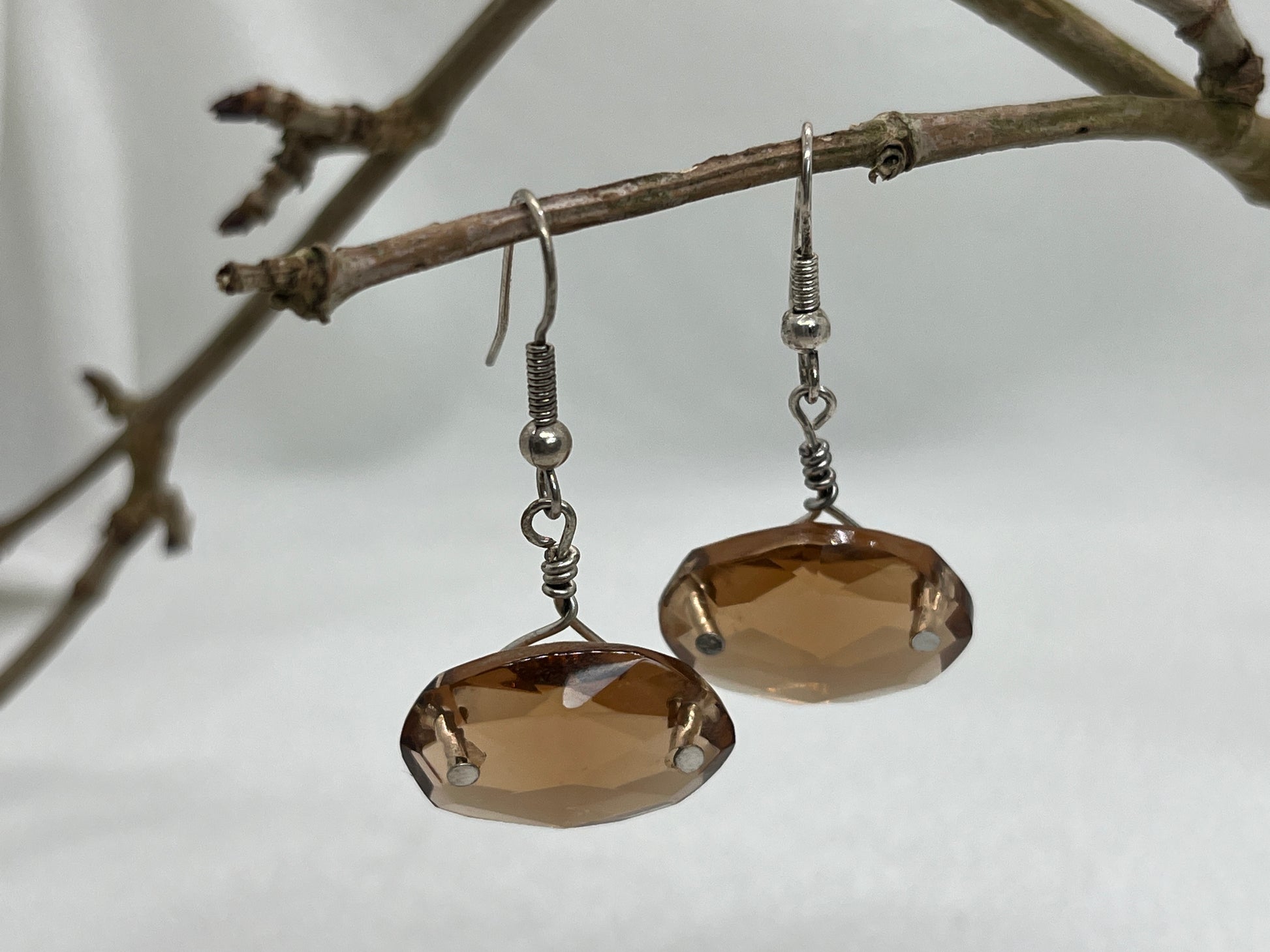 Øreringe i sølv med en kvart lysekrone :).. Denne smukke røgfarvede facetterede prismekrystal har engang været en del af en lysekrone. Den er sat på en sølvørering med sølvtråd.