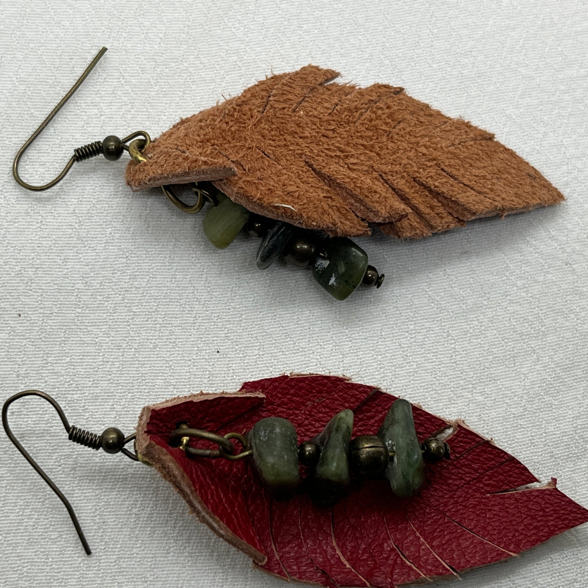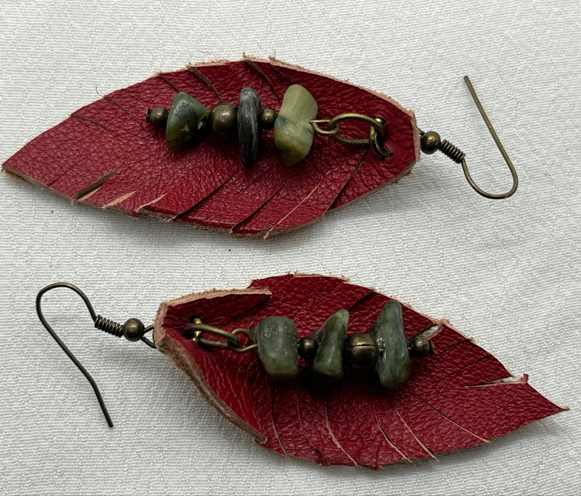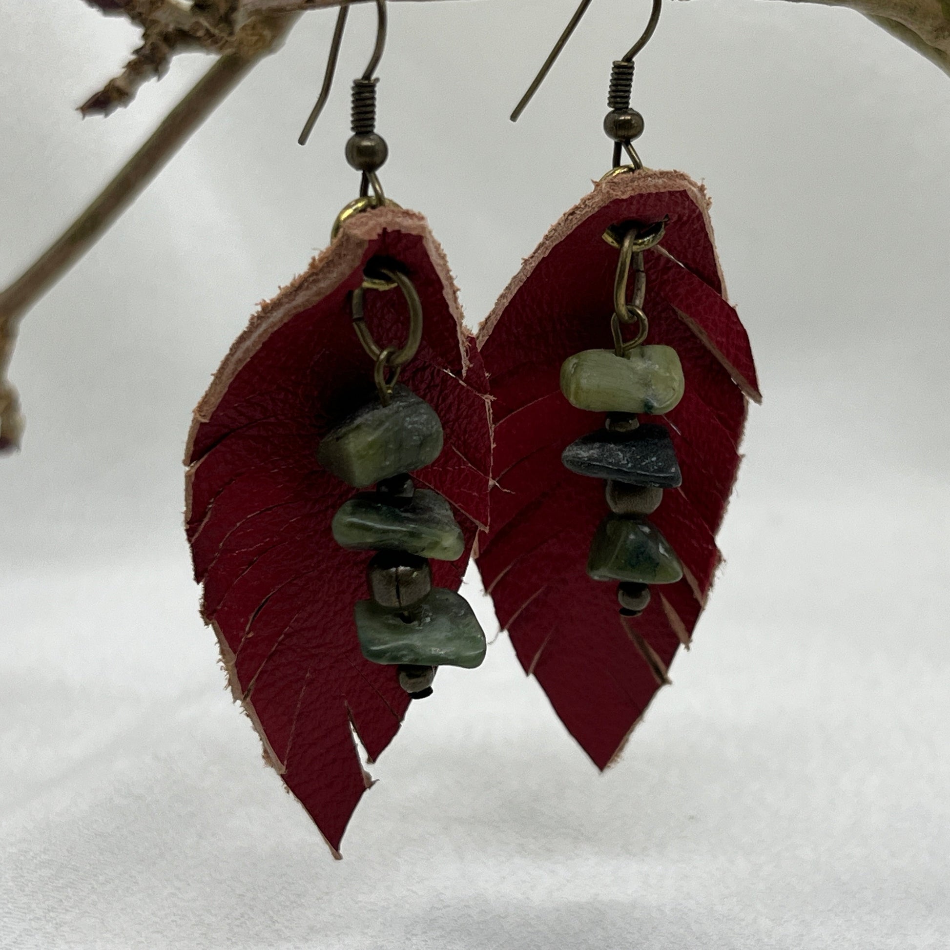 Ørering i antik messing med vedhæng i rødt skind klippet som fjer, og med grønne Chrysopras chips og messingperler som xtra vedhæng foran fjeren.