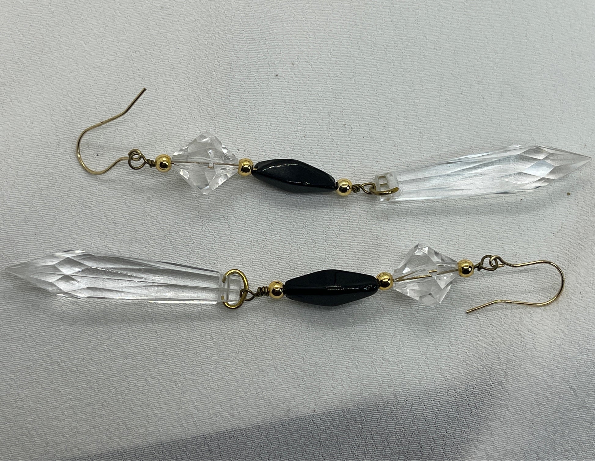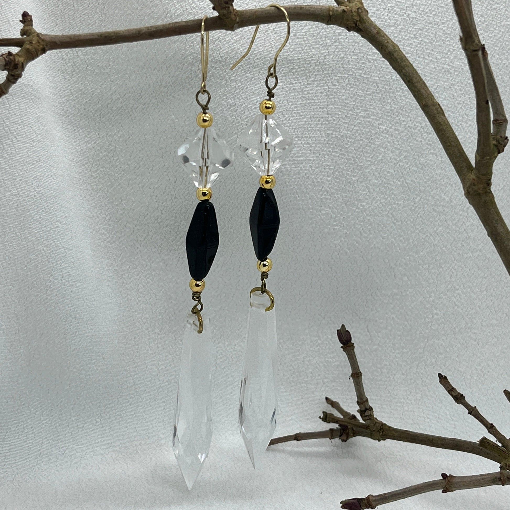 Virkelig smukke øreringe i messing, med den vildeste længde. De har guldperler, facetteret klare akryl perler, guldperler igen, sorte firkantede glasperler, flere guldperler og til slut mega lange facetterede akryl prismer. De gør sig godt til de festlige middage.