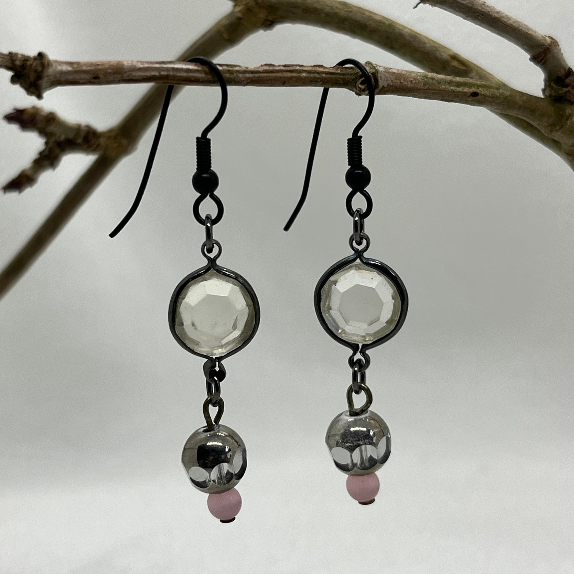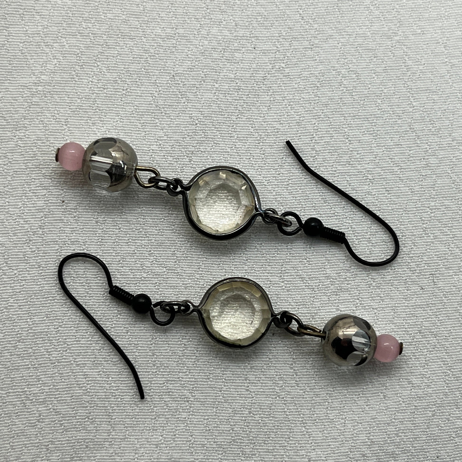 Fine øreringe i gunmetal og vedhæng i sølv og glas, samt metal/glasperle og lille rosa Cateye perle som afslutning.