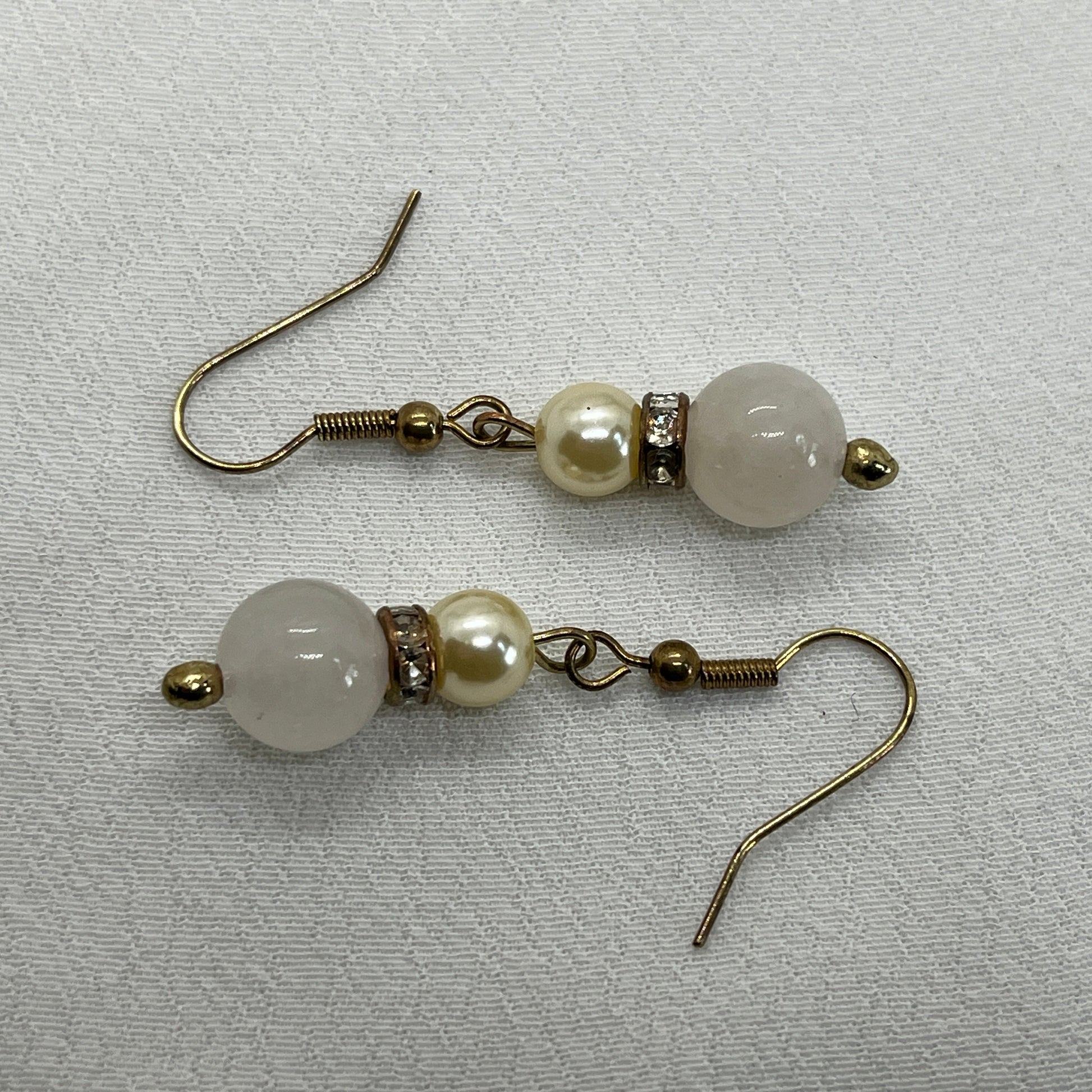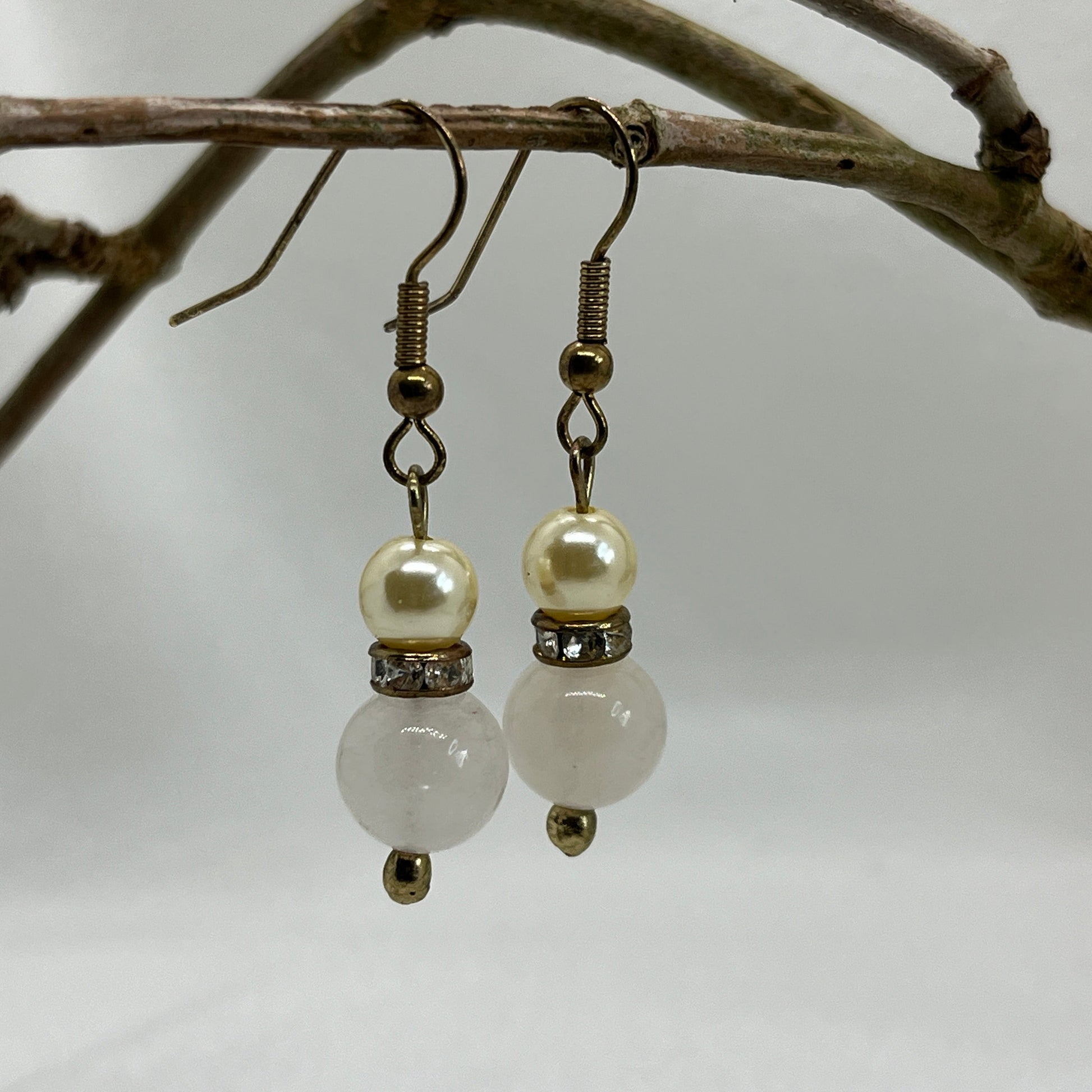 Smuk 10 mm stor Rosenkvarts på messing ørekrog, den har selskab af en fin indfarvet gylden Ferskvandsperle og en messingrondel m. similisten.