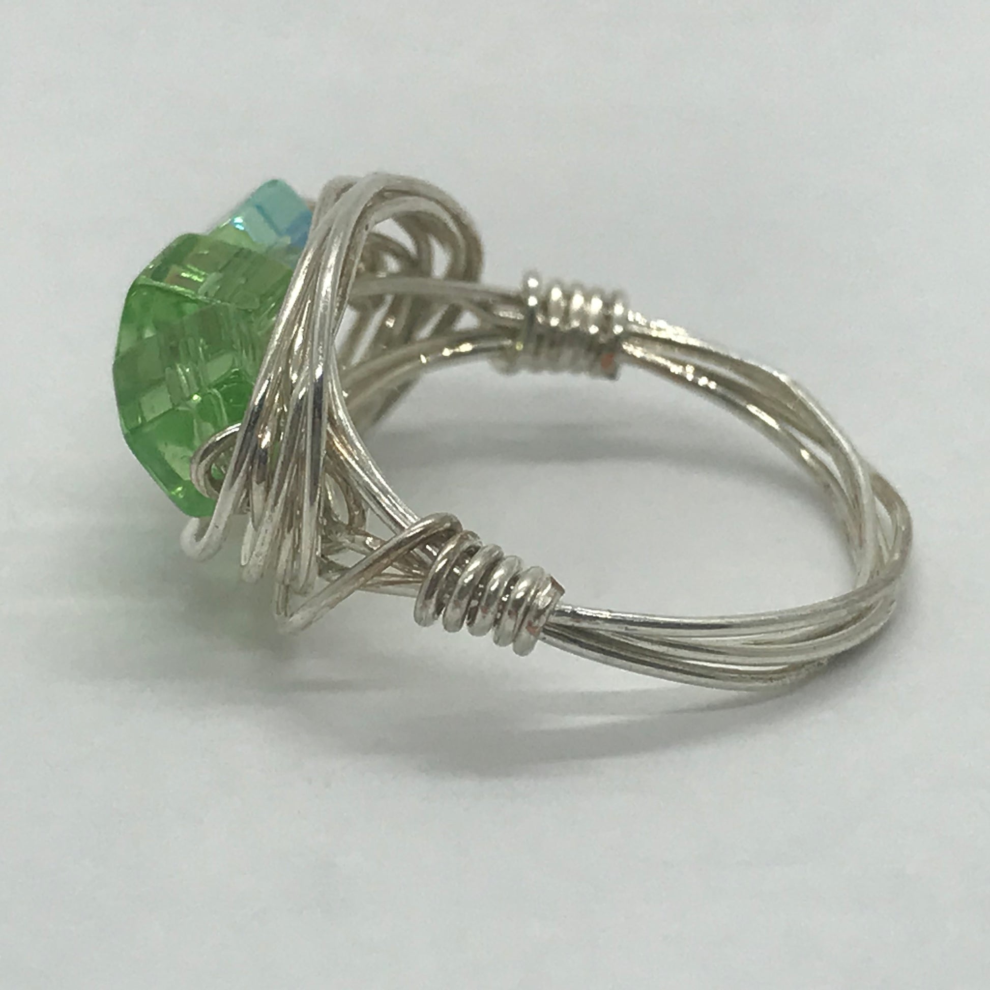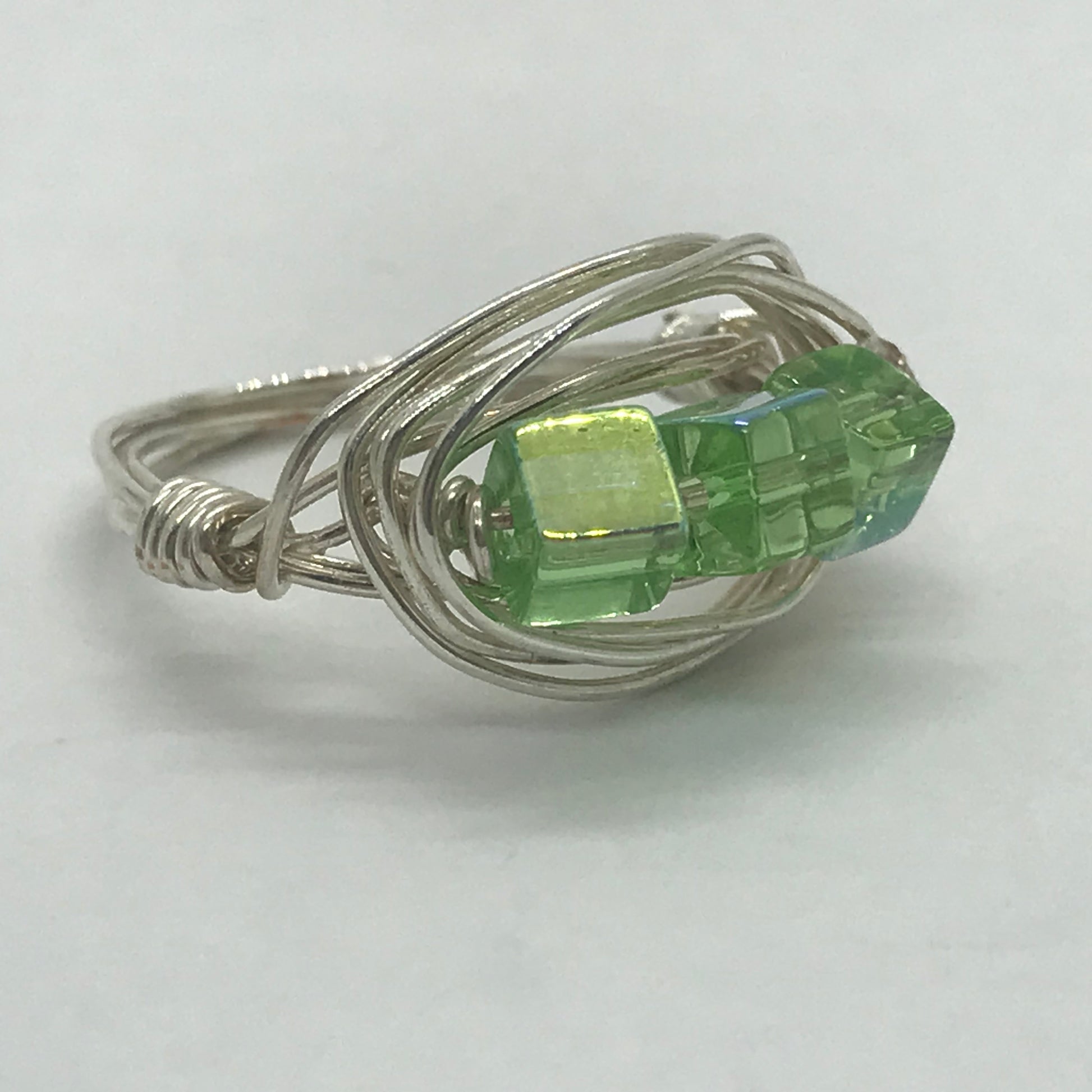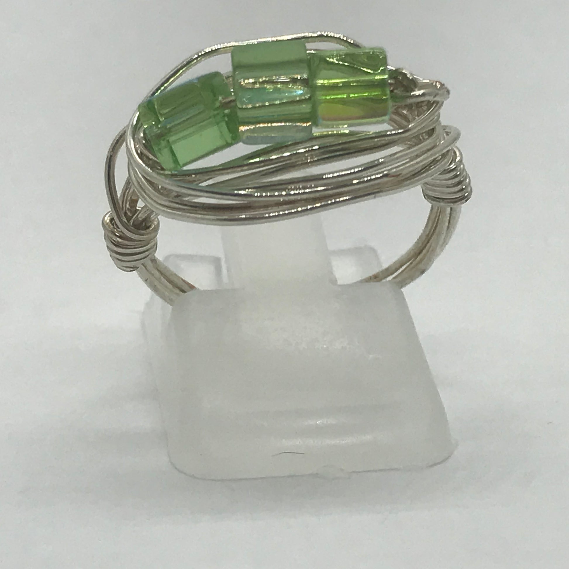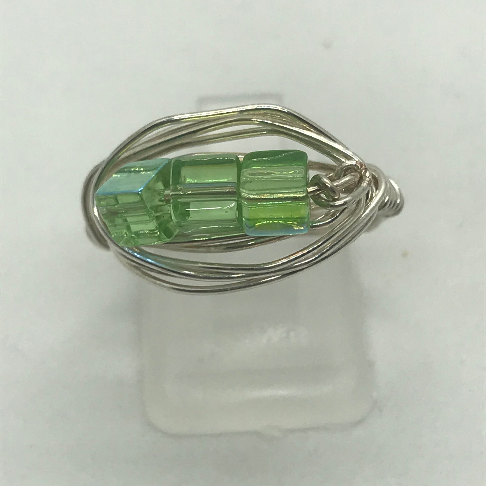 Smuk fingerring i ægte sølvtråd. Trådene er viklet om 3 smukke kvadratiske akrylperler.