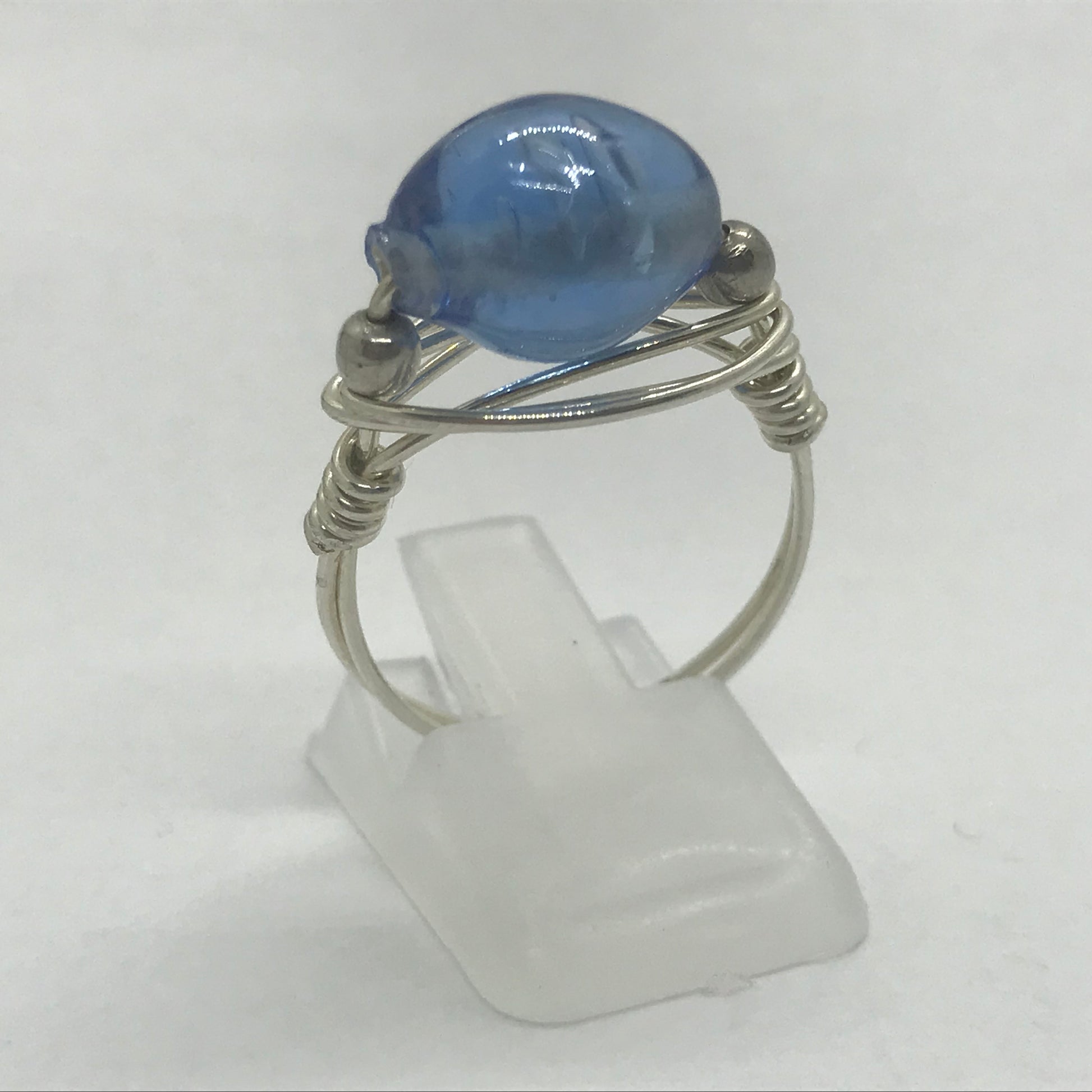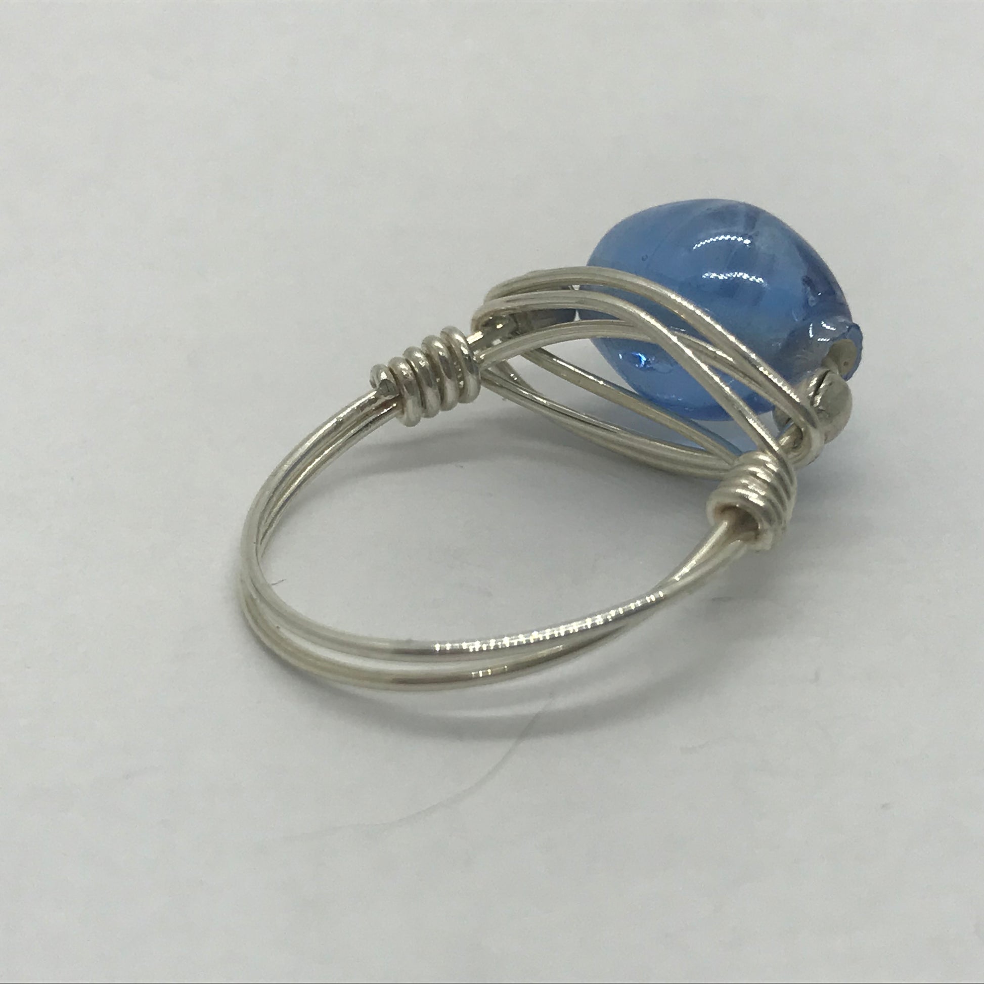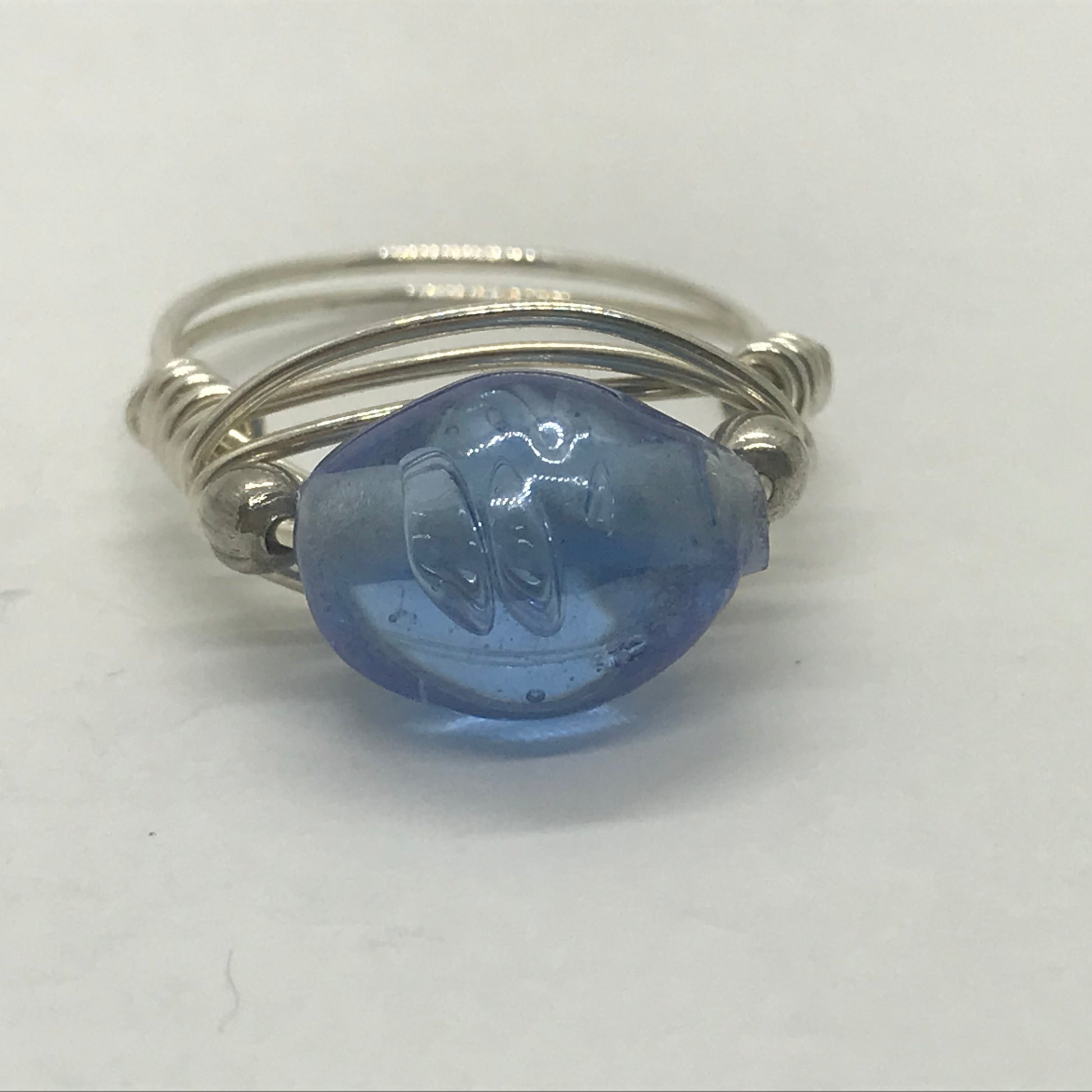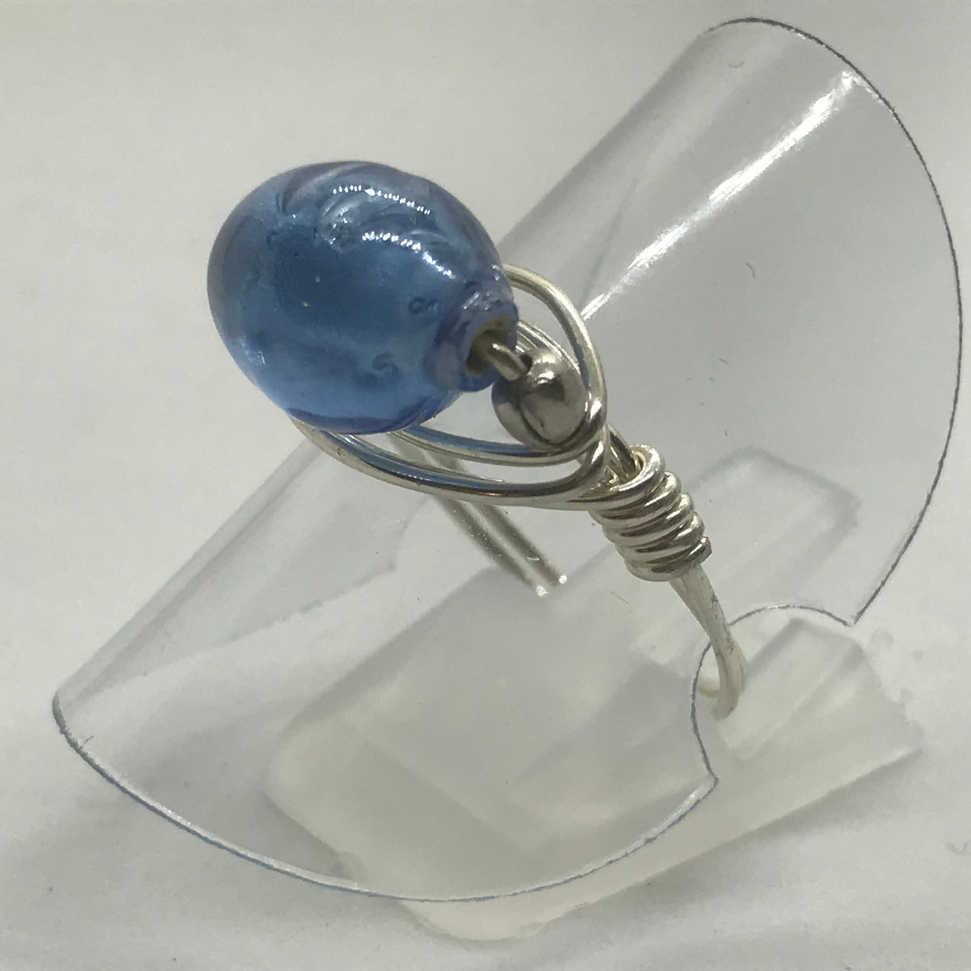 Smuk fingerring i ægte sølvtråd. Trådene er viklet om en virkelig køn lyseblå glasperle som igen er flankeret af 2 fine sølvperler.