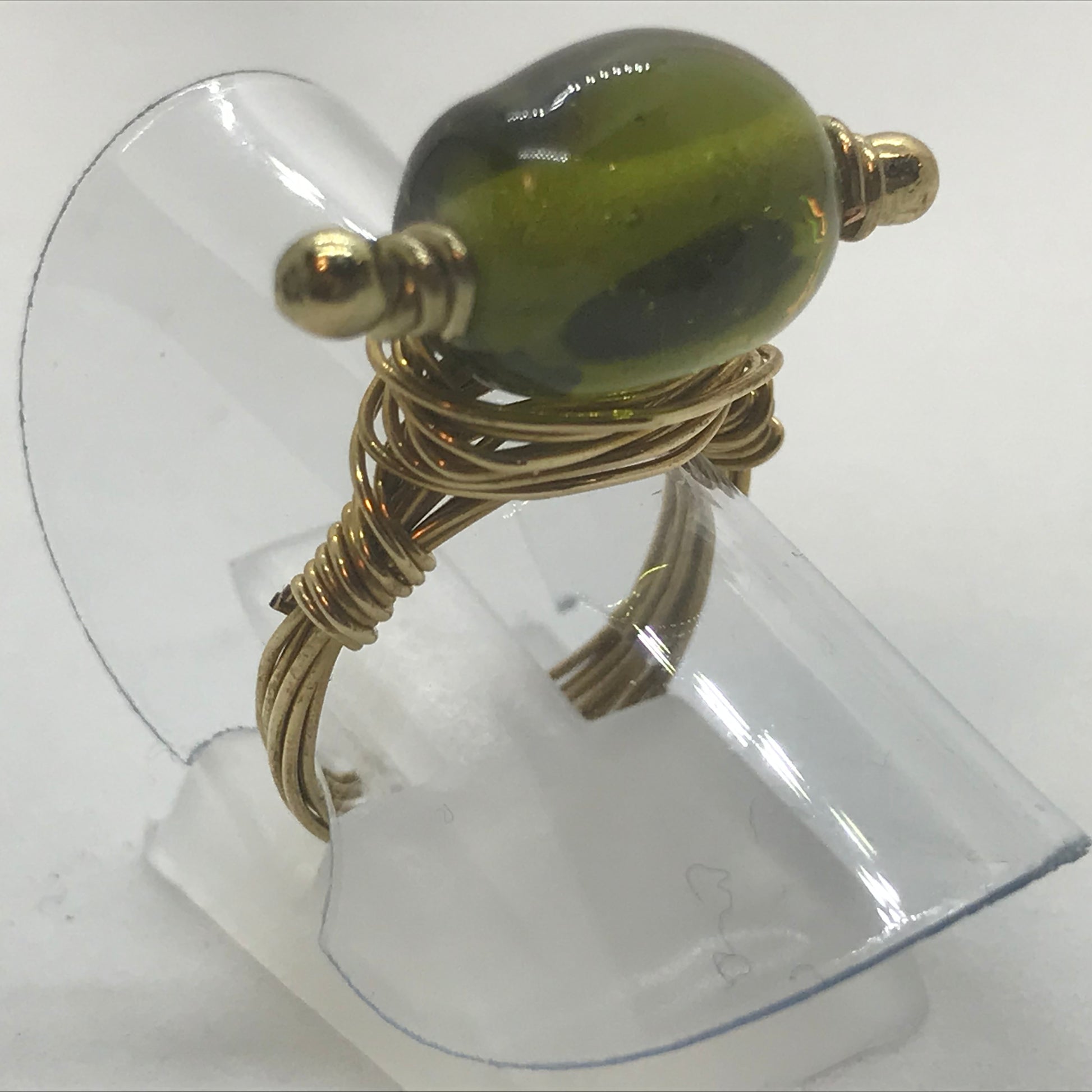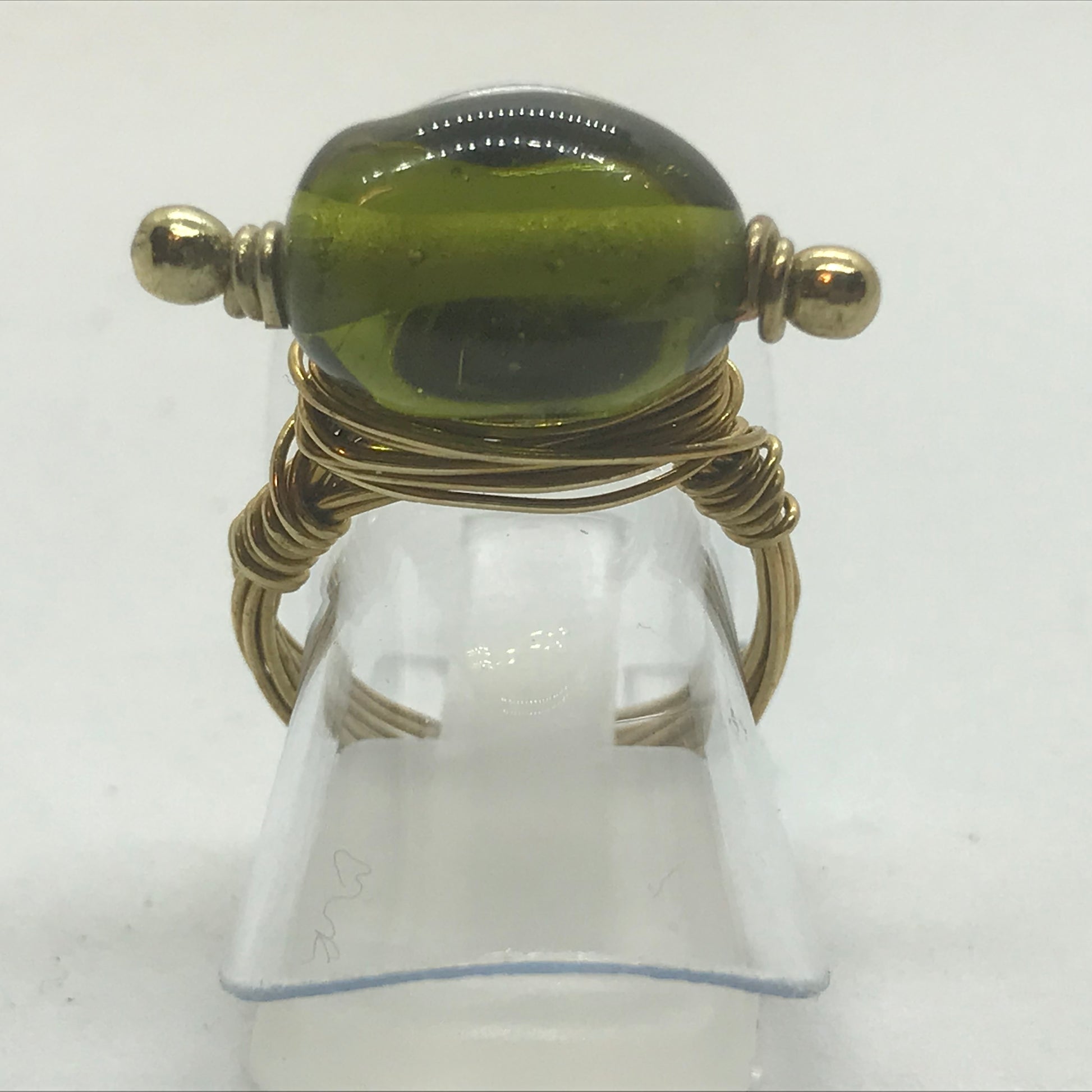 Fin og sjov fingerring i messingtråd. Trådene er viklet om en fin olivengrøn glasperle som har 2 små messingperler på hver side af hullet.