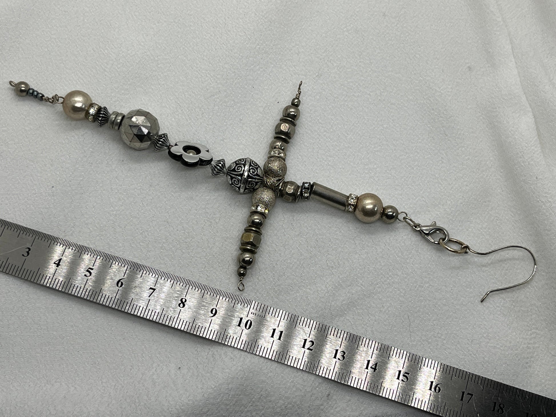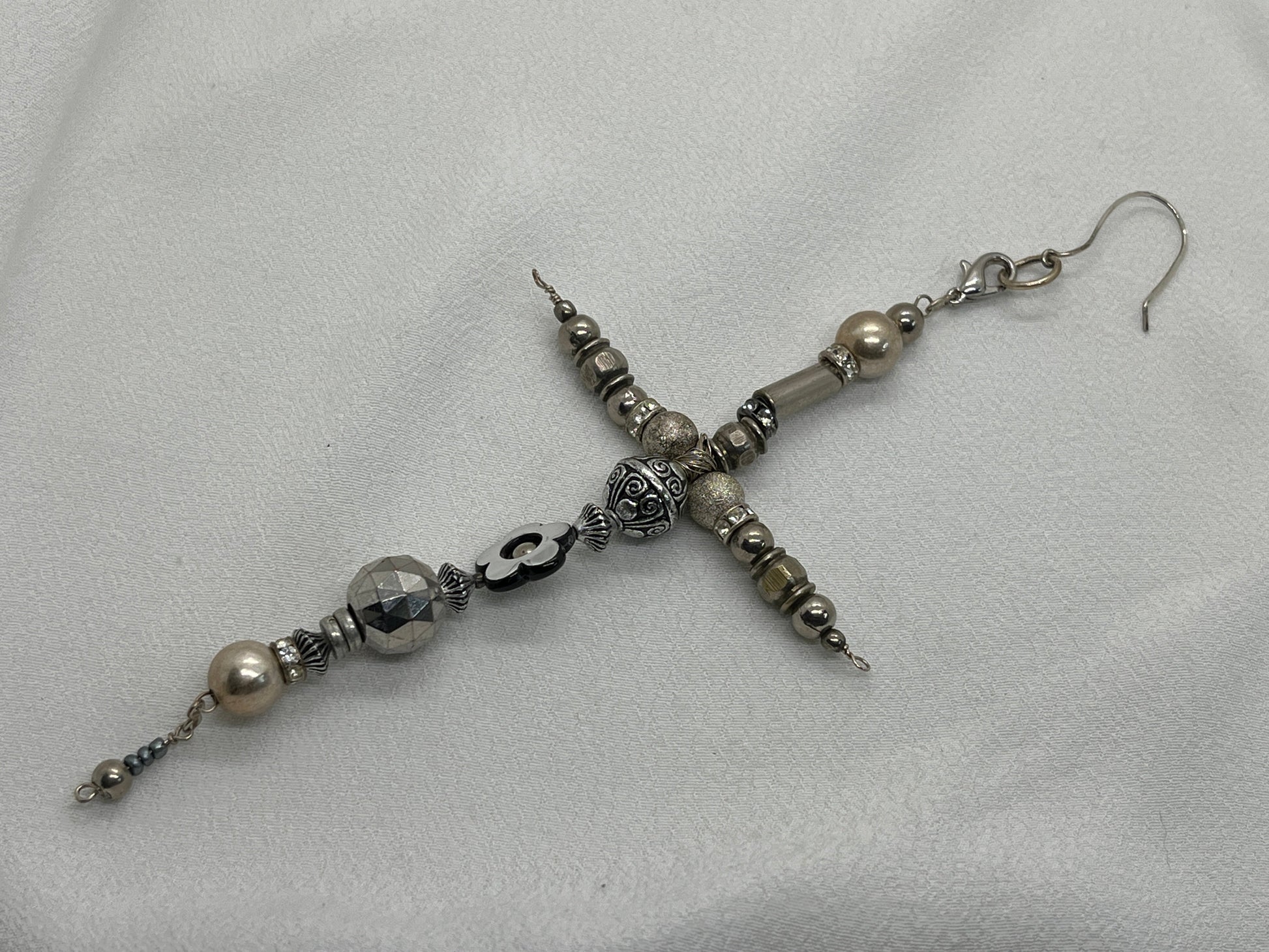 Single ørering i ægte sølv. Her kan du både vælge om du vil have den som ørering, eller klikke carabinhagen af og bruge den som et vedhæng på fx. en kæde. Det er et virkelig smukt kors i kæmpe størrelse. Der er mange forskellige perler og mellemled i både akryl, metal, similisten, altsammen sat på ægte sølvtråd.