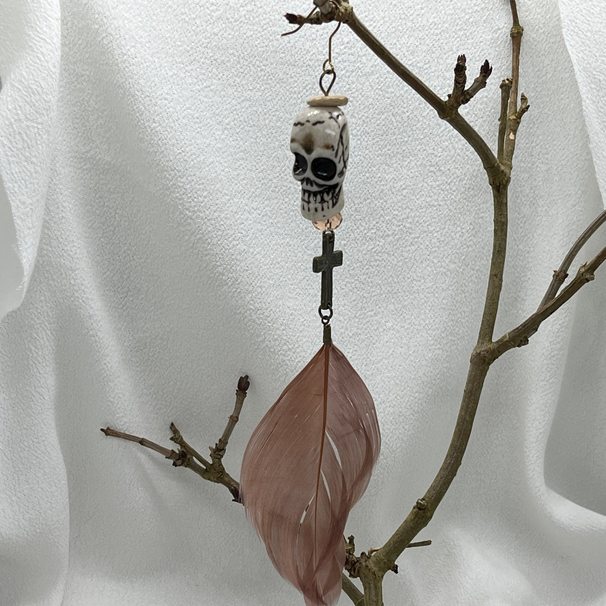 Single ørering i messing. Rigtig halloween ørering med et kæmpe kranium sat på messingtråd med en smuk rosa facetteret glasperle, et messing kors og en brun fjer som afslutning..Cool og uhyggelig på samme tid