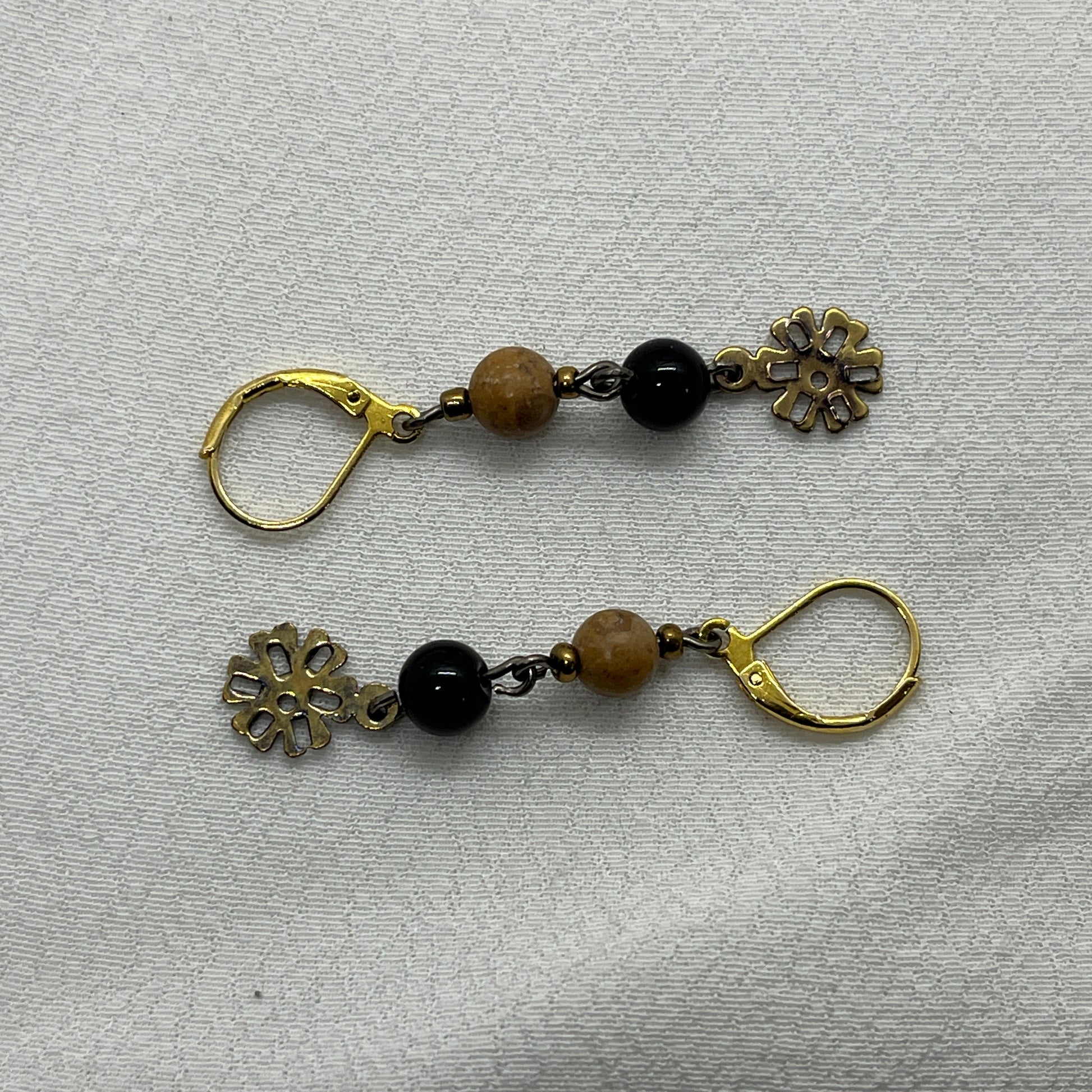 Flotte brioche messing øreringe med 6 mm Jaspis sten og 7 mm Onyx. Afsluttes med messingblomst.