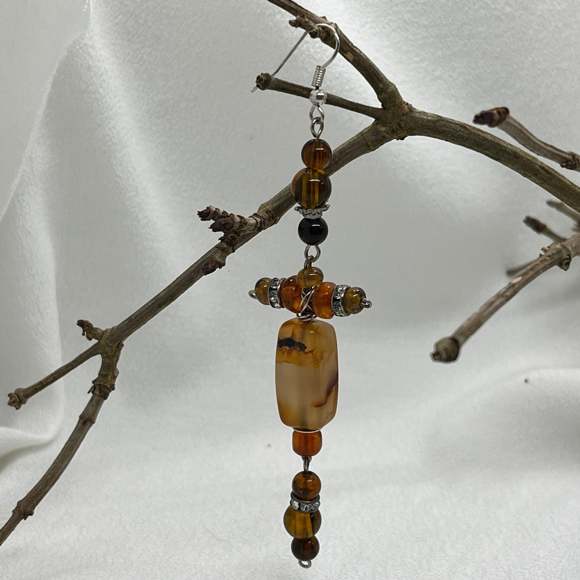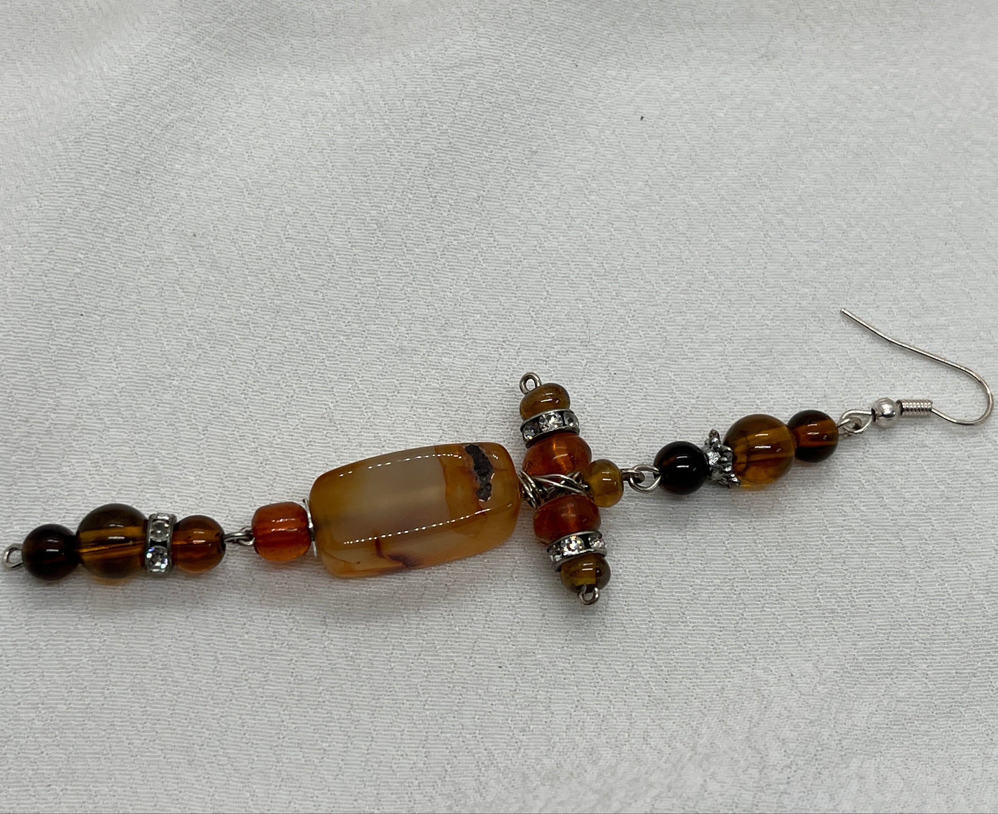 Single ørering i sølv. Her er der mange flotte brune glasperler sat sammen med forskellige metal mellemled og rondeller med similisten. Altsammen sat på ægte sølvtråd