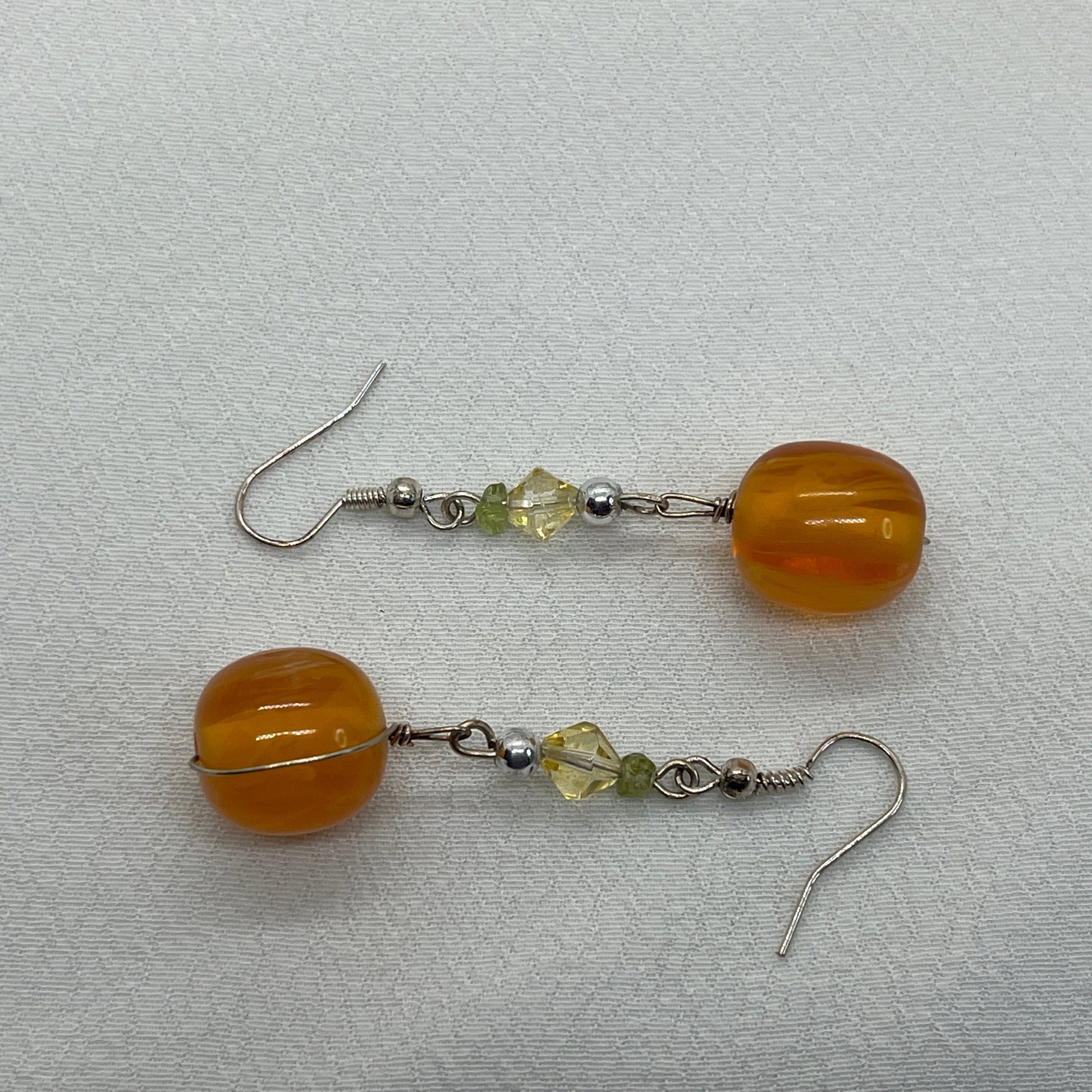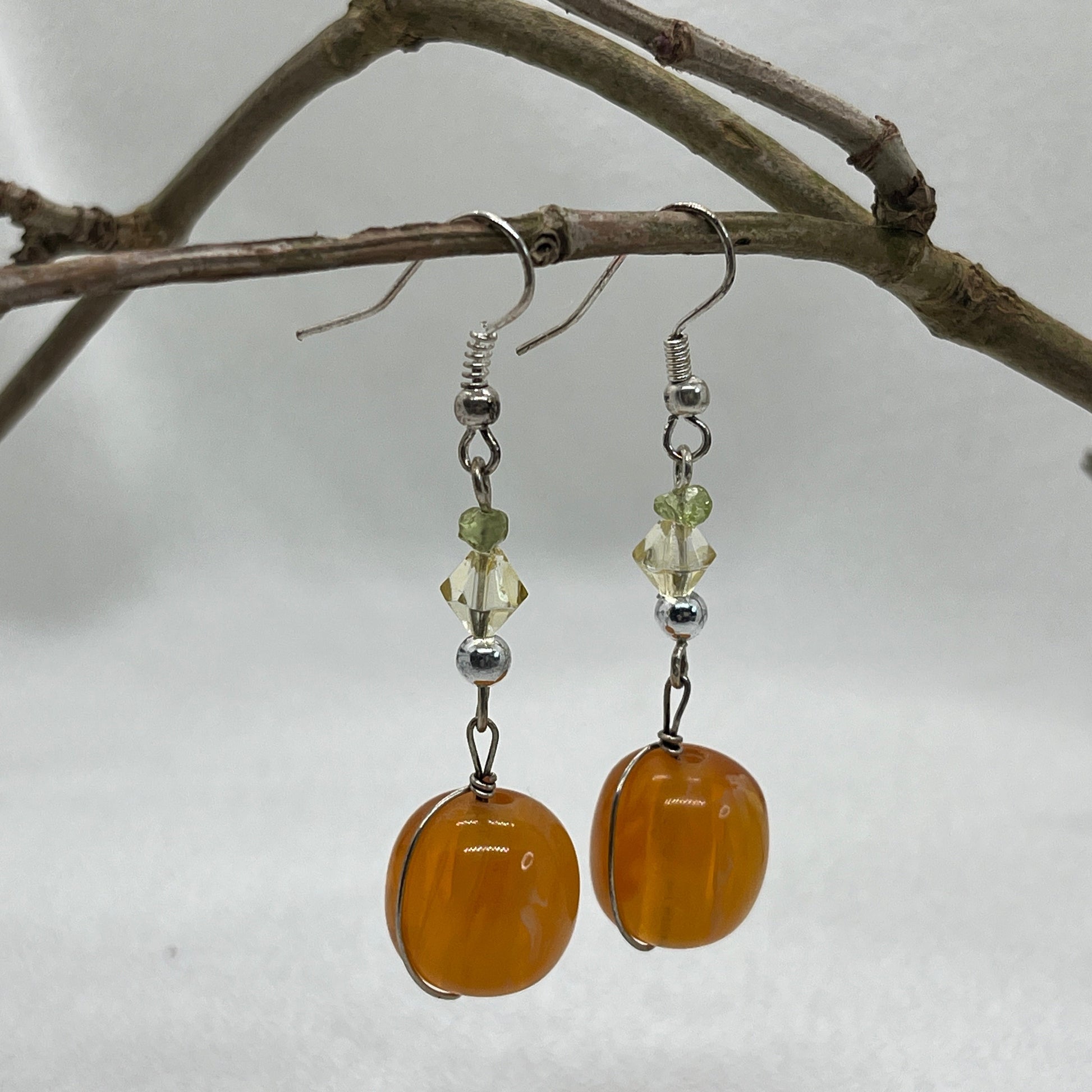 Fine sølv øreringe med ægte sølvtråd hvor der er påsat små lysegrønne glas og lysegule cones. De afsluttes så fint af Resin perler.