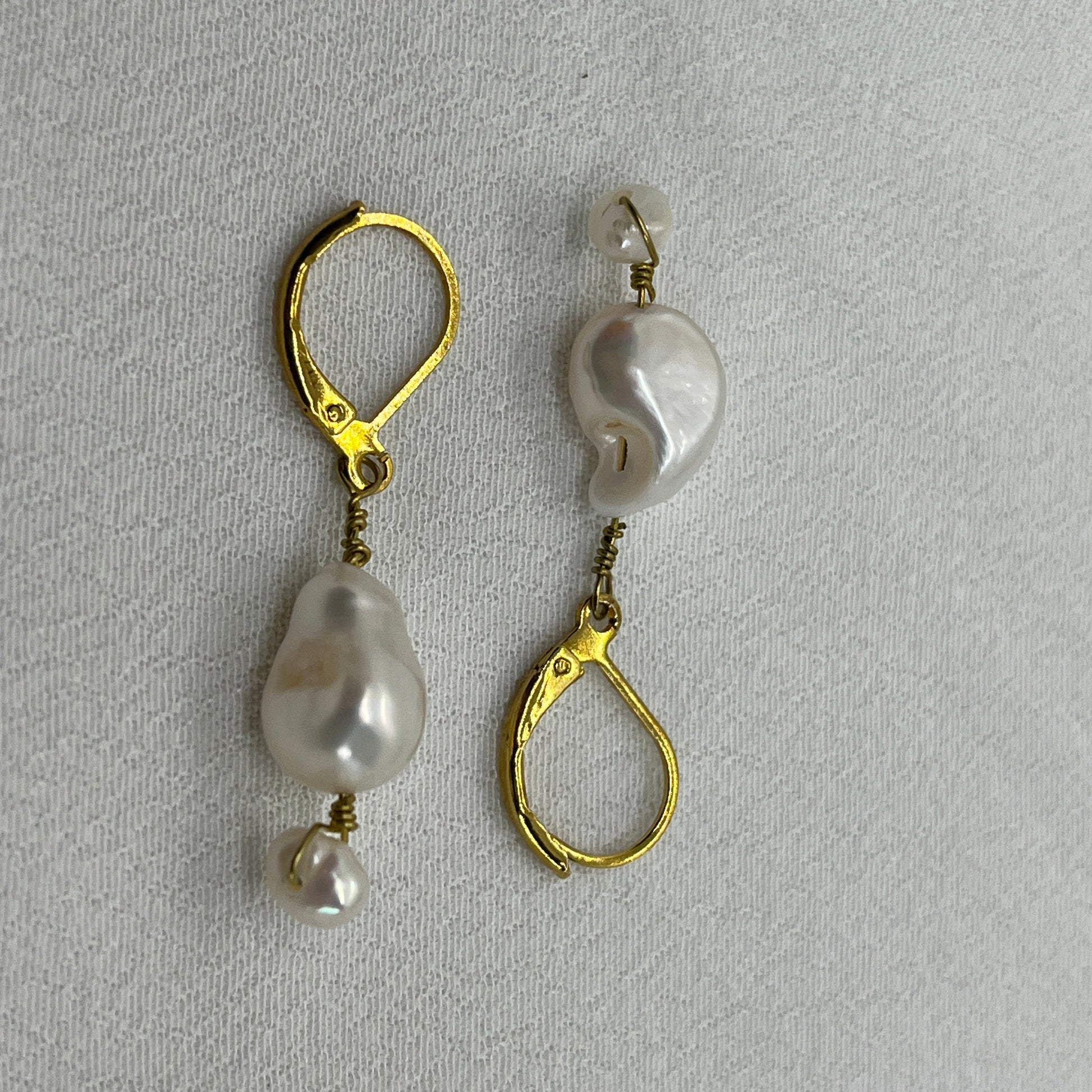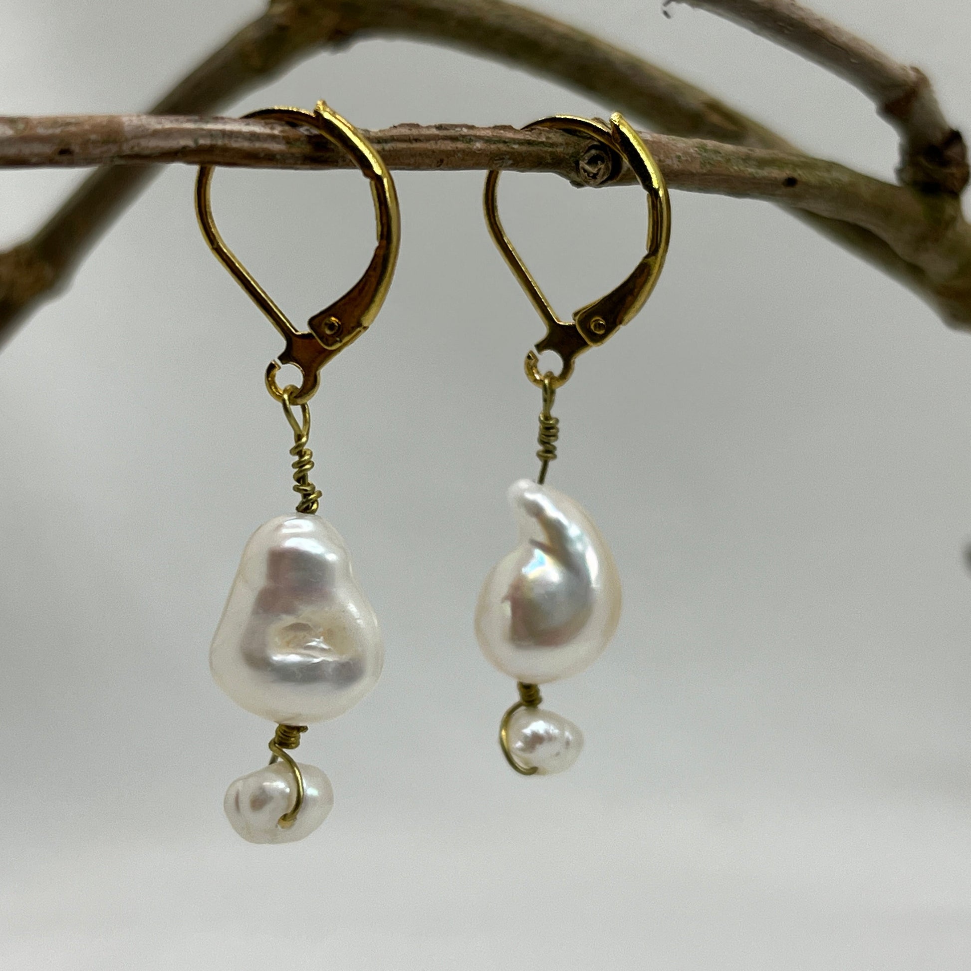 Flotte brioce messing øreringe hvor der sidder en stor 10 mm flot Ferskvandsperle på messingtråd og hvor afslutningen er en mindre Ferskvandsperle