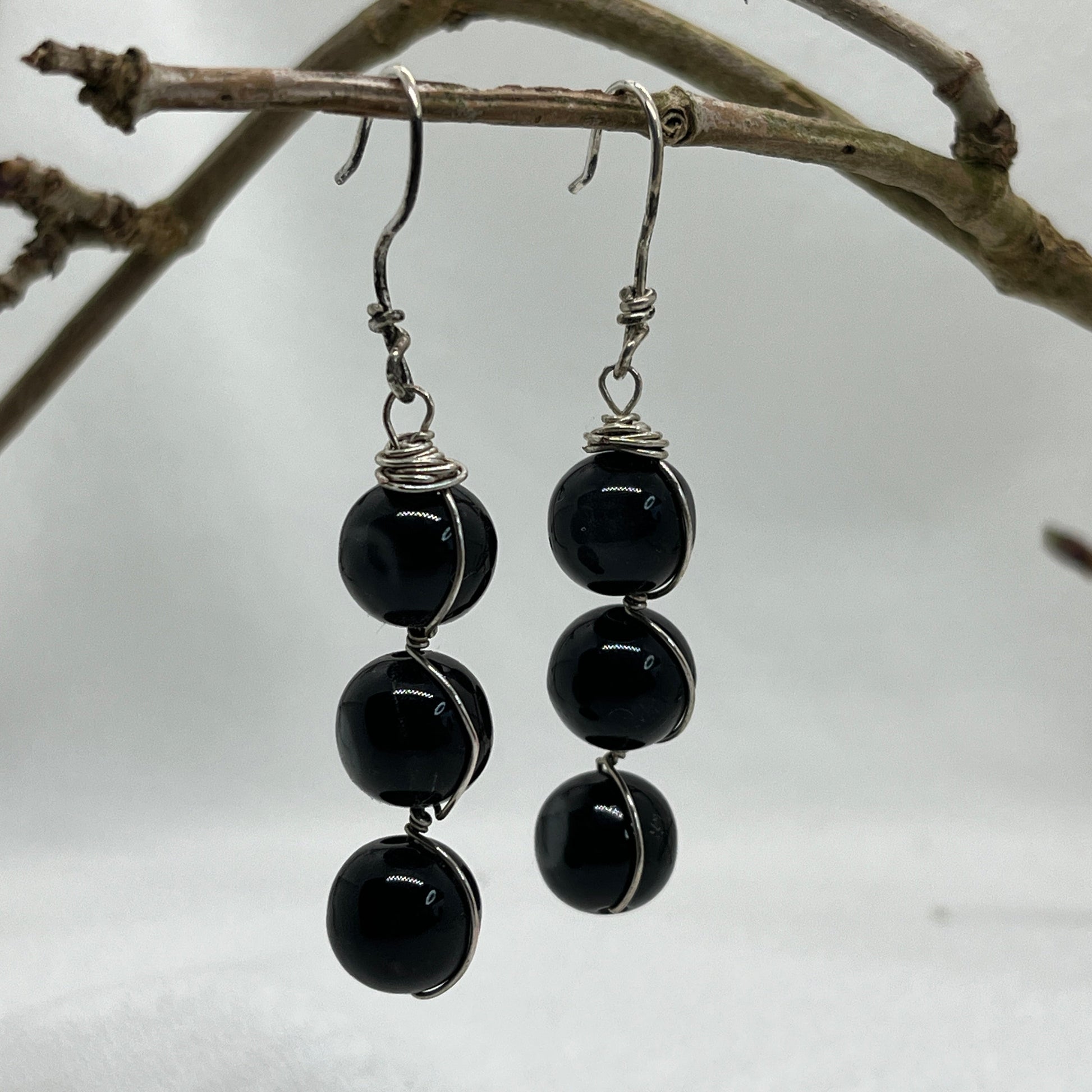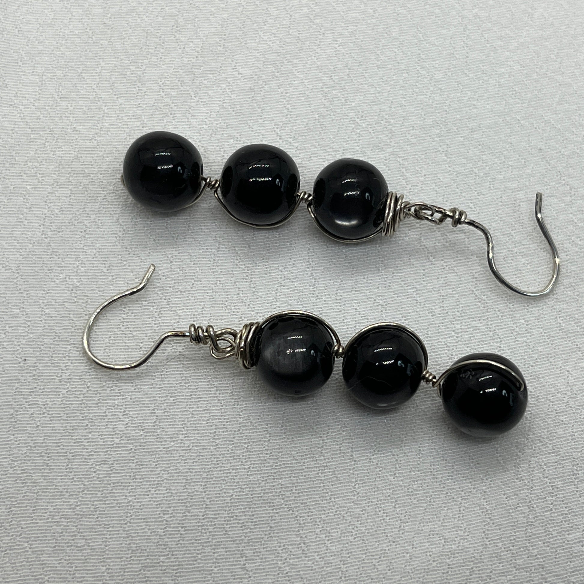 Ægte sølv ørekroge m. sorte cateye perler viklet med ægte sølvtråd