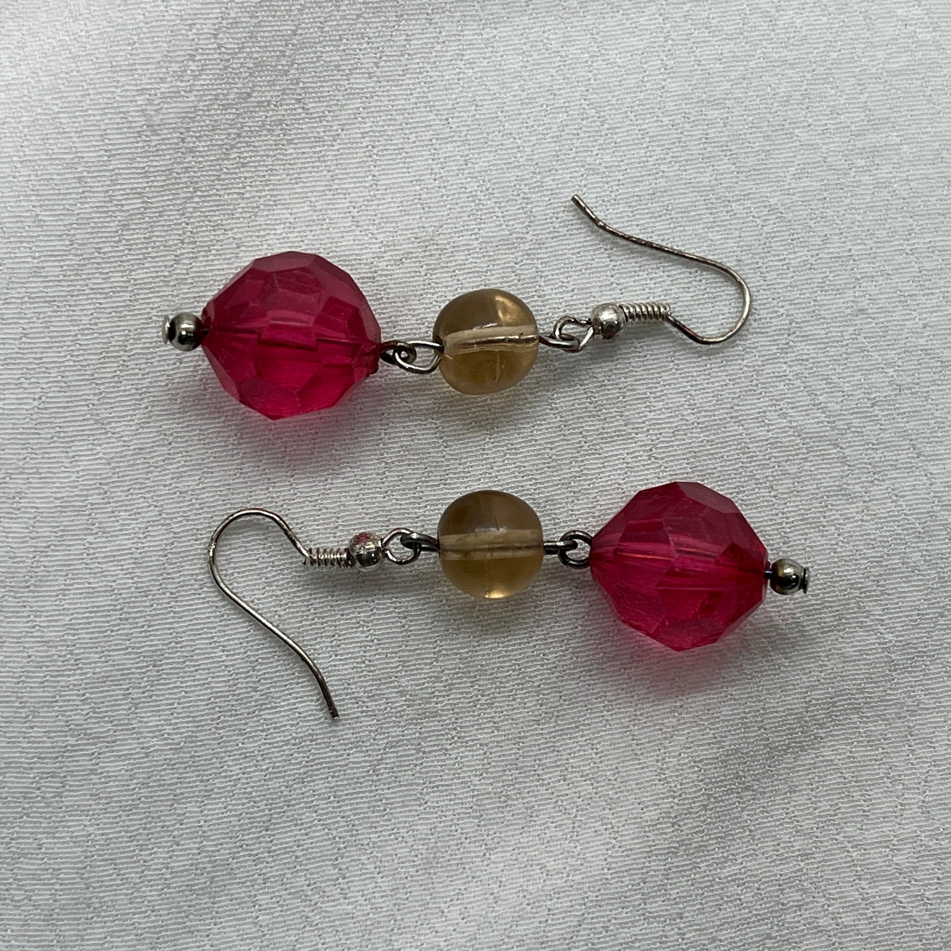 Søde sølv øreringe med rosa-beige glasperler og store pink facetterede akrylperler, sat på ægte sølvperlestilk.