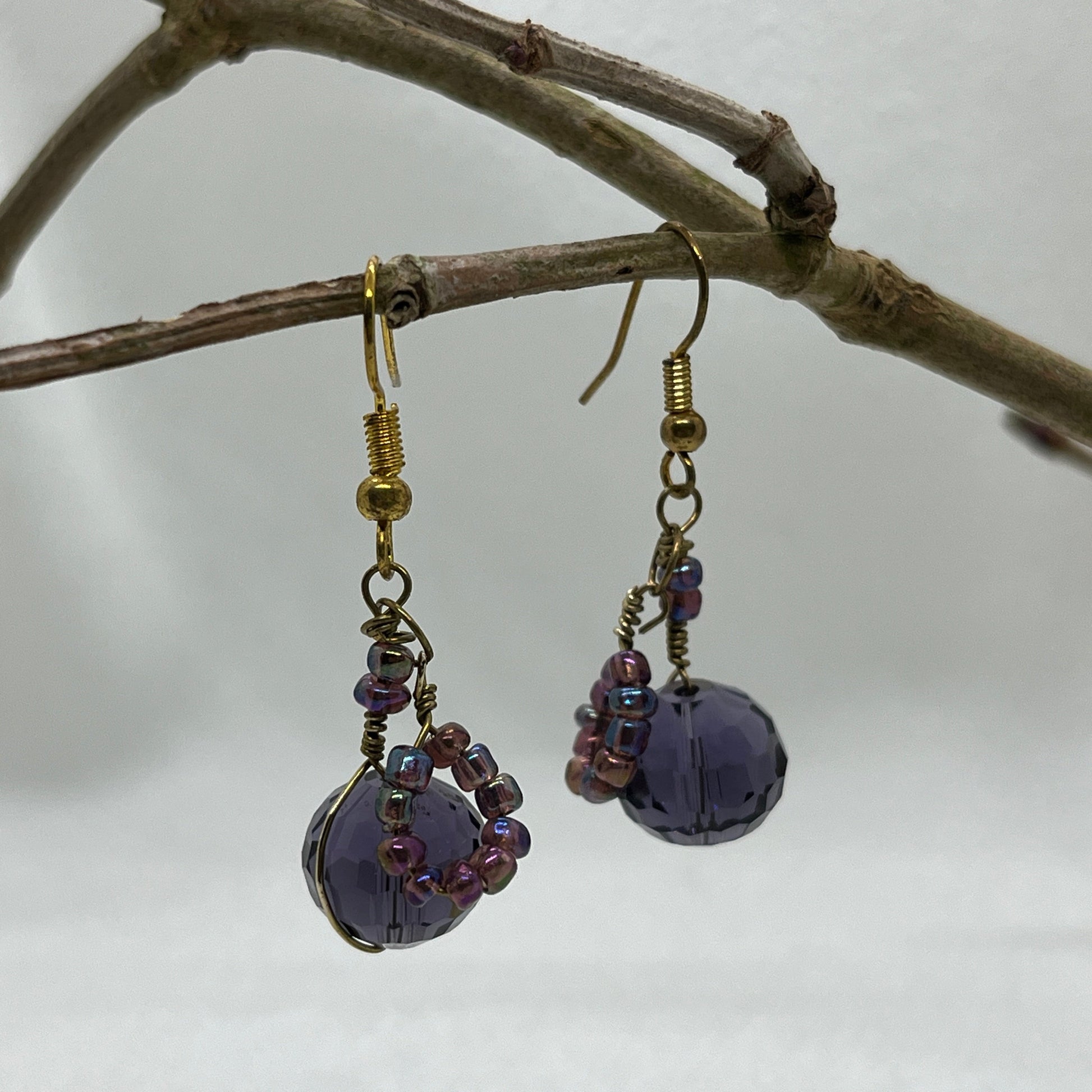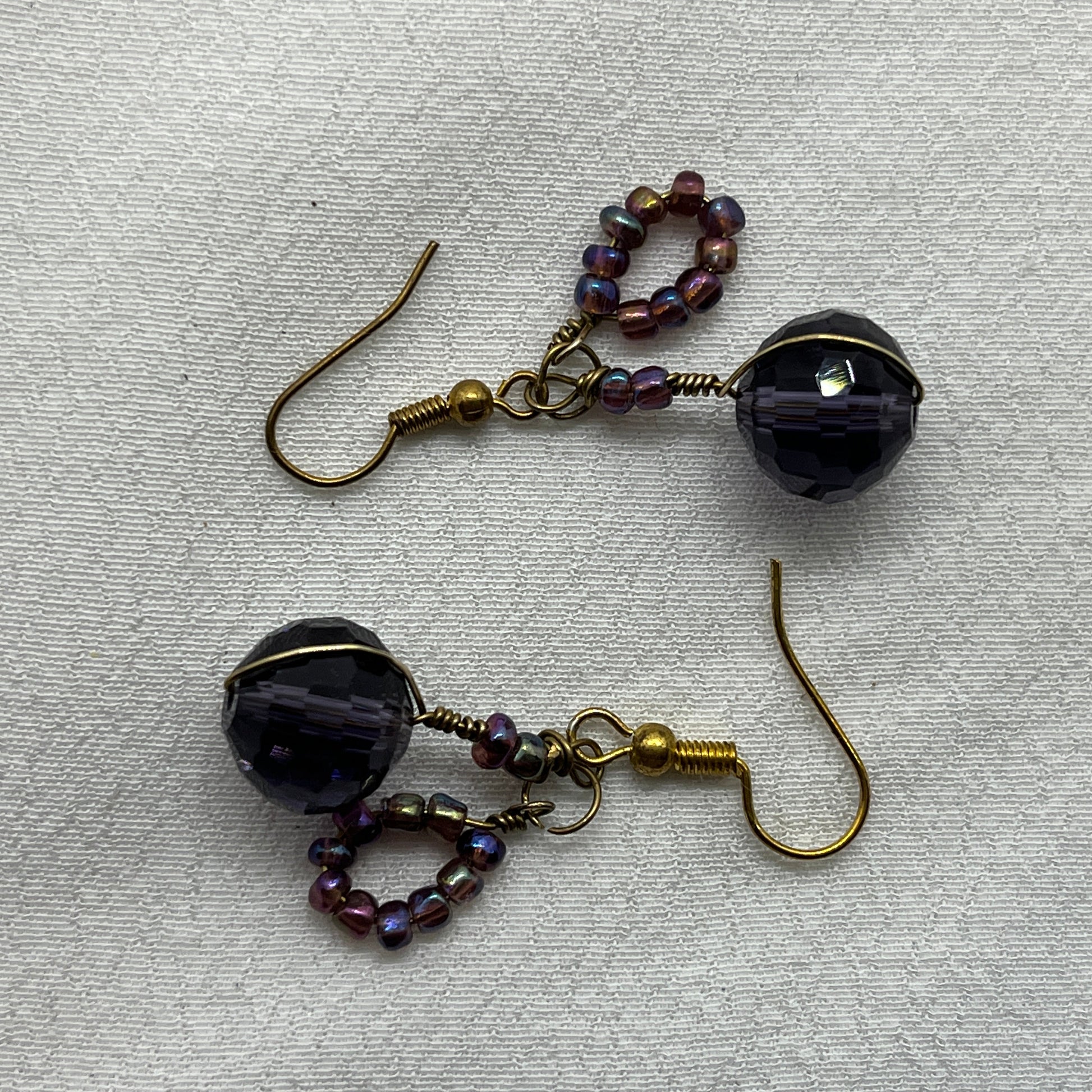 Meget smuk multifacetteret Ametyst på 10 mm, sat på messing ørering med yderligere vedhæng af lilla changerende små seedbeads. Meget smuk farvespil i facetterne.